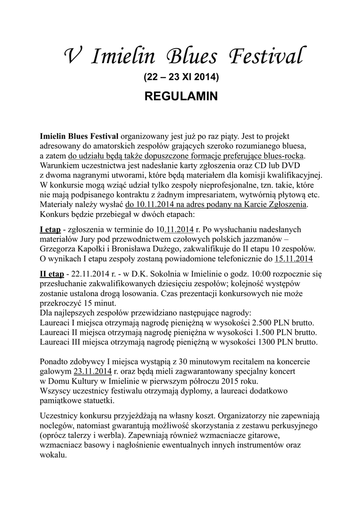 V Imielin Blues Festival (22 – 23 XI 2014) ! ! ! REGULAMIN Imielin Blues Festival organizowany jest już po raz piąty. Jest to projekt adresowany do amatorskich zespołów grających szeroko rozumianego bluesa, a zatem do udziału będą także dopuszczone formacje preferujące blues-rocka. Warunkiem uczestnictwa jest nadesłanie karty zgłoszenia oraz CD lub DVD z dwoma nagranymi utworami, które będą materiałem dla komisji kwalifikacyjnej. W konkursie mogą wziąć udział tylko zespoły nieprofesjonalne, tzn. takie, które nie mają podpisanego kontraktu z żadnym impresariatem, wytwórnią płytową etc. Materiały należy wysłać do 10.11.2014 na adres podany na Karcie Zgłoszenia. Konkurs będzie przebiegał w dwóch etapach: ! I etap - zgłoszenia w terminie do 10.11.2014 r. Po wysłuchaniu nadesłanych materiałów Jury pod przewodnictwem czołowych polskich jazzmanów – Grzegorza Kapołki i Bronisława Dużego, zakwalifikuje do II etapu 10 zespołów. O wynikach I etapu zespoły zostaną powiadomione telefonicznie do 15.11.2014 ! II etap - 22.11.2014 r. - w D.K. Sokolnia w Imielinie o godz. 10:00 rozpocznie się przesłuchanie zakwalifikowanych dziesięciu zespołów; kolejność występów zostanie ustalona drogą losowania. Czas prezentacji konkursowych nie może przekroczyć 15 minut. Dla najlepszych zespołów przewidziano następujące nagrody: Laureaci I miejsca otrzymają nagrodę pieniężną w wysokości 2.500 PLN brutto. Laureaci II miejsca otrzymają nagrodę pieniężna w wysokości 1.500 PLN brutto. Laureaci III miejsca otrzymają nagrodę pieniężną w wysokości 1300 PLN brutto. Ponadto zdobywcy I miejsca wystąpią z 30 minutowym recitalem na koncercie galowym 23.11.2014 r. oraz będą mieli zagwarantowany specjalny koncert w Domu Kultury w Imielinie w pierwszym półroczu 2015 roku. Wszyscy uczestnicy festiwalu otrzymają dyplomy, a laureaci dodatkowo pamiątkowe statuetki. ! Uczestnicy konkursu przyjeżdżają na własny koszt. Organizatorzy nie zapewniają noclegów, natomiast gwarantują możliwość skorzystania z zestawu perkusyjnego (oprócz talerzy i werbla). Zapewniają również wzmacniacze gitarowe, wzmacniacz basowy i nagłośnienie ewentualnych innych instrumentów oraz wokalu.