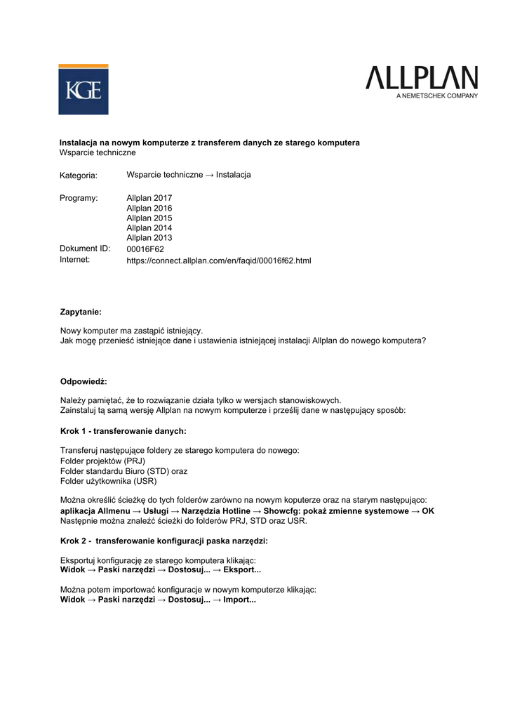 Instalacja na nowym komputerze z transferem danych ze starego komputera Wsparcie techniczne Kategoria Wsparcie techniczne → Instalacja 3URJUDPy $OOSODQ $OOSODQ $OOSODQ $OOSODQ $OOSODQ ) KWWSVFRQQHFWDOOSODQFRPHQIDTLGIKWPO Dokument,' ,QWHUQHW Zapytanie Nowy komputer ma zastąpić istniejący. Jak mogę przenieść istniejące dane i ustawienia istniejącej instalacji Allplan do nowego komputera? Odpowiedź Należy pamiętać, że to rozwiązanie działa tylko w wersjach stanowiskowych. Zainstaluj tą samą wersję Allplan na nowym komputerze i prześlij dane w następujący sposób: Krok transferowanie danych Transferuj następujące foldery ze starego komputera do nowego: FROGHUprojektów 35- Folder standardu Biuro67'oraz Folder użytkownika865 Można określić ścieżkę do tych folderów zarówno na nowym koputerze oraz na starym następująco: aplikacja Allmenu → Usługi → Narzędzia Hotline → Showcfg:pokaż zmienne systemowe → OK Następnie można znaleźć ścieżki do folderów35-67'oraz 865 Krok 2transferowanie konfiguracji paska narzędzi Eksportuj konfigurację ze starego komputera klikając: Widok → Paski narzędzi → Dostosuj... → Eksport... Można potem importować konfiguracje w nowym komputerze klikając: Widok → Paski narzędzi → Dostosuj... → Import...