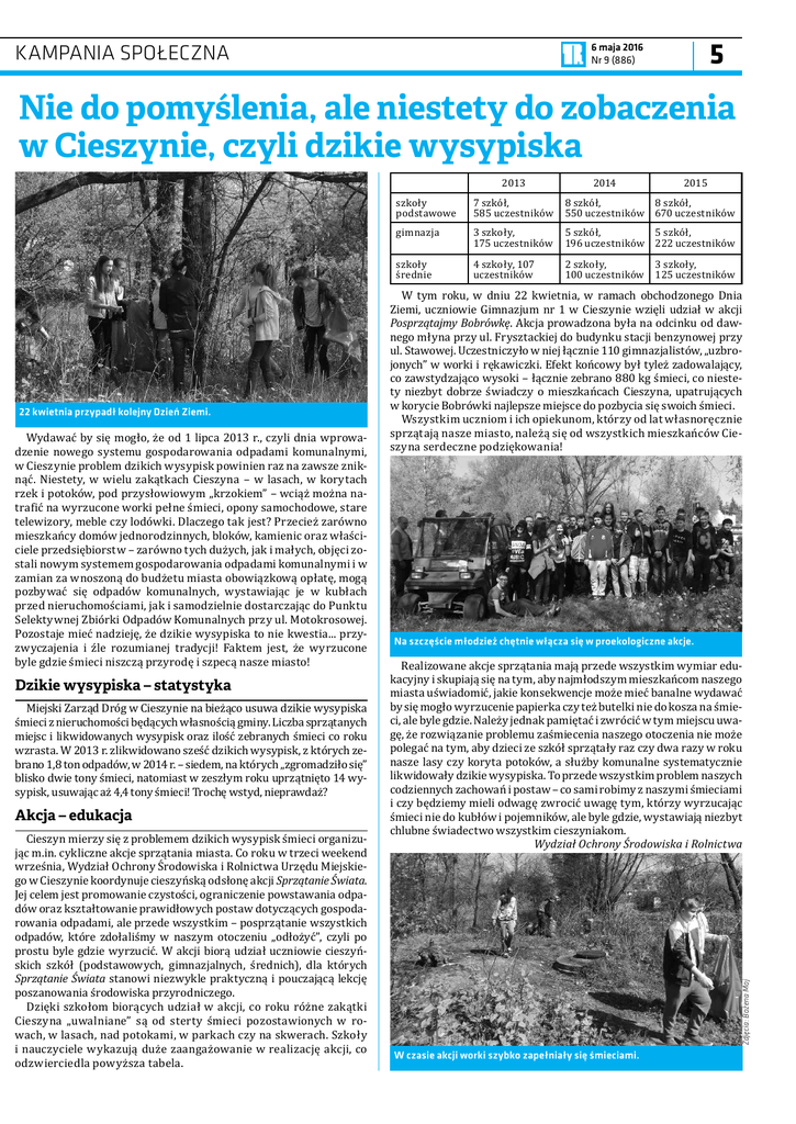 kampania społeczna 5 6 maja 2016 Nr 9 (886) Nie do pomyślenia, ale niestety do zobaczenia w Cieszynie, czyli dzikie wysypiska szkoły podstawowe gimnazja szkoły średnie Wydawać by się mogło, że od 1 lipca 2013 r., czyli dnia wprowadzenie nowego systemu gospodarowania odpadami komunalnymi, w Cieszynie problem dzikich wysypisk powinien raz na zawsze zniknąć. Niestety, w wielu zakątkach Cieszyna – w lasach, w korytach rzek i potoków, pod przysłowiowym „krzokiem” – wciąż można natrafić na wyrzucone worki pełne śmieci, opony samochodowe, stare telewizory, meble czy lodówki. Dlaczego tak jest? Przecież zarówno mieszkańcy domów jednorodzinnych, bloków, kamienic oraz właściciele przedsiębiorstw – zarówno tych dużych, jak i małych, objęci zostali nowym systemem gospodarowania odpadami komunalnymi i w zamian za wnoszoną do budżetu miasta obowiązkową opłatę, mogą pozbywać się odpadów komunalnych, wystawiając je w kubłach przed nieruchomościami, jak i samodzielnie dostarczając do Punktu Selektywnej Zbiórki Odpadów Komunalnych przy ul. Motokrosowej. Pozostaje mieć nadzieję, że dzikie wysypiska to nie kwestia... przyzwyczajenia i źle rozumianej tradycji! Faktem jest, że wyrzucone byle gdzie śmieci niszczą przyrodę i szpecą nasze miasto! Dzikie wysypiska – statystyka Miejski Zarząd Dróg w Cieszynie na bieżąco usuwa dzikie wysypiska śmieci z nieruchomości będących własnością gminy. Liczba sprzątanych miejsc i likwidowanych wysypisk oraz ilość zebranych śmieci co roku wzrasta. W 2013 r. zlikwidowano sześć dzikich wysypisk, z których zebrano 1,8 ton odpadów, w 2014 r. – siedem, na których „zgromadziło się” blisko dwie tony śmieci, natomiast w zeszłym roku uprzątnięto 14 wysypisk, usuwając aż 4,4 tony śmieci! Trochę wstyd, nieprawdaż? Akcja – edukacja Cieszyn mierzy się z problemem dzikich wysypisk śmieci organizując m.in. cykliczne akcje sprzątania miasta. Co roku w trzeci weekend września, Wydział Ochrony Środowiska i Rolnictwa Urzędu Miejskiego w Cieszynie koordynuje cieszyńską odsłonę akcji Sprzątanie Świata. Jej celem jest promowanie czystości, ograniczenie powstawania odpadów oraz kształtowanie prawidłowych postaw dotyczących gospodarowania odpadami, ale przede wszystkim – posprzątanie wszystkich odpadów, które zdołaliśmy w naszym otoczeniu „odłożyć”, czyli po prostu byle gdzie wyrzucić. W akcji biorą udział uczniowie cieszyńskich szkół (podstawowych, gimnazjalnych, średnich), dla których Sprzątanie Świata stanowi niezwykle praktyczną i pouczającą lekcję poszanowania środowiska przyrodniczego. Dzięki szkołom biorących udział w akcji, co roku różne zakątki Cieszyna „uwalniane” są od sterty śmieci pozostawionych w rowach, w lasach, nad potokami, w parkach czy na skwerach. Szkoły i nauczyciele wykazują duże zaangażowanie w realizację akcji, co odzwierciedla powyższa tabela. 7 szkół, 585 uczestników 3 szkoły, 175 uczestników 4 szkoły, 107 uczestników 2014 2015 8 szkół, 550 uczestników 8 szkół, 670 uczestników 2 szkoły, 100 uczestników 3 szkoły, 125 uczestników 5 szkół, 196 uczestników 5 szkół, 222 uczestników W tym roku, w dniu 22 kwietnia, w ramach obchodzonego Dnia Ziemi, uczniowie Gimnazjum nr 1 w Cieszynie wzięli udział w akcji Posprzątajmy Bobrówkę. Akcja prowadzona była na odcinku od dawnego młyna przy ul. Frysztackiej do budynku stacji benzynowej przy ul. Stawowej. Uczestniczyło w niej łącznie 110 gimnazjalistów, „uzbrojonych” w worki i rękawiczki. Efekt końcowy był tyleż zadowalający, co zawstydzająco wysoki – łącznie zebrano 880 kg śmieci, co niestety niezbyt dobrze świadczy o mieszkańcach Cieszyna, upatrujących w korycie Bobrówki najlepsze miejsce do pozbycia się swoich śmieci. Wszystkim uczniom i ich opiekunom, którzy od lat własnoręcznie sprzątają nasze miasto, należą się od wszystkich mieszkańców Cieszyna serdeczne podziękowania! Na szczęście młodzież chętnie włącza się w proekologiczne akcje. Realizowane akcje sprzątania mają przede wszystkim wymiar edukacyjny i skupiają się na tym, aby najmłodszym mieszkańcom naszego miasta uświadomić, jakie konsekwencje może mieć banalne wydawać by się mogło wyrzucenie papierka czy też butelki nie do kosza na śmieci, ale byle gdzie. Należy jednak pamiętać i zwrócić w tym miejscu uwagę, że rozwiązanie problemu zaśmiecenia naszego otoczenia nie może polegać na tym, aby dzieci ze szkół sprzątały raz czy dwa razy w roku nasze lasy czy koryta potoków, a służby komunalne systematycznie likwidowały dzikie wysypiska. To przede wszystkim problem naszych codziennych zachowań i postaw – co sami robimy z naszymi śmieciami i czy będziemy mieli odwagę zwrocić uwagę tym, którzy wyrzucając śmieci nie do kubłów i pojemników, ale byle gdzie, wystawiają niezbyt chlubne świadectwo wszystkim cieszyniakom. Wydział Ochrony Środowiska i Rolnictwa Zdjęcia: Bożena Moj 22 kwietnia przypadł kolejny Dzień Ziemi. 2013 W czasie akcji worki szybko zapełniały się śmieciami. ogłoszenia i komunikaty Zmiana lokalizacji Punktu Obsługi Klienta – odpady Burmistrz Miasta Cieszyna informuje, że od dnia 20 kwietnia 2016 r. nastąpiła zmiana lokalizacji Punktu Obsługi Klienta, tj. z ul. Przykopa 7 punkt został przeniesiony na 3 Maja 18. W Punktach Obsługi Klienta mieszkańcy: • mogą otrzymać dodatkowe worki służące do selektywnej zbiórki odpadów komunalnych • mogą otrzymać kody kreskowe na worki do selektywnej zbiórki odpadów komunalnych • mogą zgłaszać wszelkie skargi, wnioski bądź zastrzeżenia dotyczące realizacji usługi w zakresie odbioru odpadów komunalnych. Godziny otwarcia Punktów Obsługi Klienta: • Ekoplast-Produkt sp. z o.o, ul. Frysztacka 145, tel.: 33 85 80 075, 503 933 206, godz. pracy: od poniedziałku do piątku: 6.00-15.00; • Ekoplast-Produ