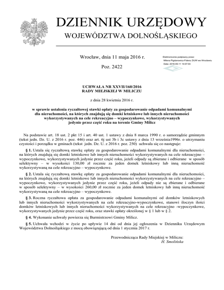 DZIENNIK URZĘDOWY WOJEWÓDZTWA DOLNOŚLĄSKIEGO Wrocław, dnia 11 maja 2016 r. Elektronicznie podpisany przez: Milena Pigdanowicz-Fidera; DUW we Wrocławiu Poz. 2422 Data: 2016-05-11 14:07:03 UCHWAŁA NR XXVII/160/2016 RADY MIEJSKIEJ W MILICZU z dnia 28 kwietnia 2016 r. w sprawie ustalenia ryczałtowej stawki opłaty za gospodarowanie odpadami komunalnymi dla nieruchomości, na których znajdują się domki letniskowe lub innych nieruchomości wykorzystywanych na cele rekreacyjno – wypoczynkowe, wykorzystywanych jedynie przez część roku na terenie Gminy Milicz Na podstawie art. 18 ust. 2 pkt 15 i art. 40 ust. 1 ustawy z dnia 8 marca 1990 r. o samorządzie gminnym (tekst jedn. Dz. U. z 2016 r. poz. 446) oraz art. 6j ust 3b i 3c ustawy z dnia 13 września1996r. o utrzymaniu czystości i porządku w gminach (tekst jedn. Dz. U. z 2016 r. poz. 250) uchwala się co następuje: § 1. Ustala się ryczałtową stawkę opłaty za gospodarowanie odpadami komunalnymi dla nieruchomości, na których znajdują się domki letniskowe lub innych nieruchomości wykorzystywanych na cele rekreacyjno – wypoczynkowe, wykorzystywanych jedynie przez część roku, jeżeli odpady są zbierane i odbierane w sposób selektywny – w wysokości 130,00 zł rocznie za jeden domek letniskowy lub inną nieruchomość wykorzystywaną na cele rekreacyjno – wypoczynkowe. § 2. Ustala się ryczałtową stawkę opłaty za gospodarowanie odpadami komunalnymi dla nieruchomości, na których znajdują się domki letniskowe lub innych nieruchomości wykorzystywanych na cele rekreacyjno – wypoczynkowe, wykorzystywanych jedynie przez część roku, jeżeli odpady nie są zbierane i odbierane w sposób selektywny – w wysokości 260,00 zł rocznie za jeden domek letniskowy lub inną nieruchomość wykorzystywaną na cele rekreacyjno – wypoczynkowe. § 3. Roczna ryczałtowa opłata za gospodarowanie odpadami komunalnymi od domków letniskowych lub innych nieruchomości wykorzystywanych na cele rekreacyjno-wypoczynkowe, stanowi iloczyn ilości domków letniskowych lub innych nieruchomości wykorzystywanych na cele rekreacyjno -wypoczynkowe, wykorzystywanych jedynie przez część roku, oraz stawki opłaty określonej w § 1 lub w § 2. § 4. Wykonanie uchwały powierza się Burmistrzowi Gminy Milicz. § 5. Uchwała wchodzi w życie po upływie 14 dni od dnia jej ogłoszenia w Dzienniku Urzędowym Województwa Dolnośląskiego z mocą obowiązującą od dnia 1 stycznia 2017 r. Przewodnicząca Rady Miejskiej w Miliczu: H. Smolińska
