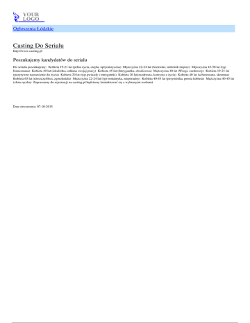 Ogłoszenia Łódzkie Casting Do Serialu http://www.casting.pl Poszukujemy kandydatów do serialu Do serialu poszukujemy: Kobieta 19-21 lat (pełna życia, ciepła, optymistyczna) Mężczyzna 22-24 lat (beztroski, miłośnik imprez) Mężczyzna 45-50 lat (typ biznesmana) Kobieta 40 lat (idealistka, oddana swojej pracy) Kobieta 45 lat (Intrygantka, dwulicowa) Mężczyzna 40 lat (Wrogi, zazdrosny) Kobieta 19-21 lat (pozytywne nastawienie do życia) Kobieta 20 lat (typ gwiazdy i intrygantki) Kobieta 20 lat(zazdrosna, korzysta z życia) Kobieta 40 lat (schorowana, skromna) Kobieta 65 lat (nieszczęśliwa, zgorzkniała) Mężczyzna 22-24 lat (typ romantyka, nieporadny) Kobieta 40-45 lat (pesymistka, prosta kobieta) Mężczyzna 40-45 lat (złota rączka) Zapraszamy do rejestracji na casting.pl będziemy kontaktować się z wybranymi osobami. Date utworzenia: 07-10-2015