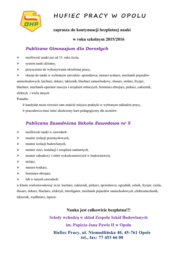 HUFIEC PRACY W OPOLU zaprasza do kontynuacji bezpłatnej nauki w roku szkolnym 2015/2016 Publiczne Gimnazjum dla Dorosłych możliwość nauki już od 15. roku życia, system nauki dzienny, przyuczenie do wykonywania określonej pracy, okazja do nauki w wybranym zawodzie: sprzedawca, murarz-tynkarz, mechanik pojazdów samochodowych, kucharz, dekarz, lakiernik, blacharz samochodowy, ślusarz, stolarz, fryzjer, blacharz, mechanik-operator maszyn i urządzeń rolniczych, betoniarz-zbrojarz, piekarz, cukiernik, elektryk i wielu innych Ponadto: kandydat może również sam znaleźć miejsce praktyki w wybranym zakładzie pracy, pracodawca musi mieć ukończony kurs pedagogiczny dla uczniów. Publiczna Zasadnicza Szkoła Zawodowa nr 5 możliwość nauki w zawodach: monter izolacji przemysłowych, monter izolacji budowlanych, monter sieci, instalacji i urządzeń sanitarnych, monter zabudowy i robót wykończeniowych w budownictwie, stolarz, murarz-tynkarz, betoniarz-zbrojarz lub w innych zawodach: w klasie wielozawodowej: m.in. kucharz, cukiernik, piekarz, sprzedawca, ogrodnik, rolnik, fryzjer, cieśla, ślusarz, dekarz, blacharz, elektryk, introligator, mechanik pojazdów samochodowych ,elektromechanik, lakiernik, wędliniarz, tapicer. Nauka jest całkowicie bezpłatna!!! Szkoły wchodzą w skład Zespołu Szkół Budowlanych im. Papieża Jana Pawła II w Opolu Hufiec Pracy, ul. Niemodlińska 40, 45-761 Opole tel., fax: 77 453 66 00 Uczestnicy hufca objęci zostaną opieką wychowawczą, zajęciami profilaktycznymi, resocjalizacyjnymi i wyrównawczymi. Młodzież będzie mogła uczestniczyć w szeregu imprez kulturalnych i sportowych, wziąć udział w realizowanych w hufcu programach europejskich, a także uzyskać pomoc w sytuacjach kryzysowych. Proponujemy również szeroko pojęte wsparcie doradcy zawodowego. Aby zapisać się do hufca, trzeba przyjść z rodzicem lub opiekunem prawnym oraz przynieść ze sobą następujące dokumenty: ostatnie świadectwo oraz świadectwo ukończenia szkoły podstawowej wynik sprawdzianu wiedzy po klasie VI szkoły podstawowej – do gimnazjum, wynik egzaminu gimnazjalnego – do nauki w szkole zawodowej, krótką opinię dyrektora dotychczasowej szkoły (tylko dla kandydatów niepełnoletnich), opinię z poradni psychologiczno-pedagogicznej (do nauki w gimnazjum), bezpłatne zaświadczenie od lekarza rodzinnego o możliwości kształcenia w dowolnym typie szkoły, 3 zdjęcia legitymacyjne, numer PESEL, kartę zdrowia ucznia, podanie do szkoły, podanie do hufca, kwestionariusz osobowy oraz zgodę rodziców wypełnia się na miejscu na dostępnych drukach. Rekrutacja trwa do 28 sierpnia 2015 roku Nie czekaj, zapisz się już dziś – liczba miejsc ograniczona! Hufiec Pracy ul. Niemodlińska 40, 45-761 Opole tel., fax: 77 453 66 00 e-mail: [email protected] Zapraszamy również do odwiedzenia stron internetowych: www.opolska.ohp.pl/rekrutacja www.opolska.ohp.pl/hufce_pracy