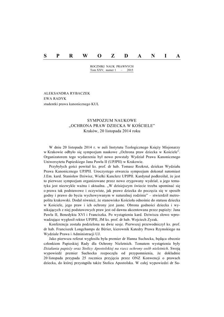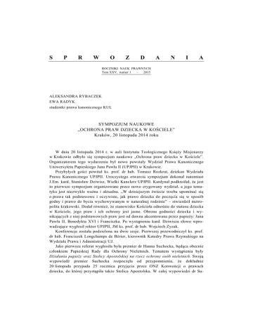 S P R W O Z D A N I A ROCZNIKI NAUK PRAWNYCH Tom XXV, numer 1 – 2015 ALEKSANDRA RYBACZEK EWA RADYK studentki prawa kanonicznego KUL SYMPOZJUM NAUKOWE „OCHRONA PRAW DZIECKA W KOŚCIELE” Kraków, 20 listopada 2014 roku W dniu 20 listopada 2014 r. w auli Instytutu Teologicznego Księży Misjonarzy w Krakowie odbyło się sympozjum naukowe „Ochrona praw dziecka w Kościele”. Organizatorem tego wydarzenia był nowo powstały Wydział Prawa Kanonicznego Uniwersytetu Papieskiego Jana Pawła II (UPJPII) w Krakowie. Przybyłych gości powitał ks. prof. dr hab. Tomasz Rozkrut, dziekan Wydziału Prawa Kanonicznego UPJPII. Uroczystego otwarcia sympozjum dokonał natomiast J.Em. kard. Stanisław Dziwisz, Wielki Kanclerz UPJPII. Kardynał podkreślał, że jest to pierwsze sympozjum organizowane przez nowo erygowany wydział, a jego tematyka jest niezwykle ważna i aktualna. „W dzisiejszym świecie trzeba upominać się o prawa tak podstawowe i oczywiste, jak prawo dziecka do poczęcia się w sposób godny i prawo do bycia wychowywanym w naturalnej rodzinie” – stwierdził metropolita krakowski. Dodał również, że stanowisko Kościoła odnośnie do statusu dziecka w Kościele, jego praw i ich ochrony jest jasne. Obrona godności dziecka i wynikających z niej podstawowych praw jest od dawna akcentowana przez papieży: Jana Pawła II, Benedykta XVI i Franciszka. Po wystąpieniu kard. Dziwisza słowo wprowadzające wygłosił rektor UPJPII, JM ks. prof. dr hab. Wojciech Zyzak. Konferencja została podzielona na dwie sesje. Pierwszej przewodniczył ks. prof. dr hab. Franciszek Longchamps de Bérier, kierownik Katedry Prawa Rzymskiego na Wydziale Prawa i Administracji UJ. Jako pierwsza referat wygłosiła była premier dr Hanna Suchocka, będąca obecnie członkiem Papieskiej Rady dla Ochrony Nieletnich. Tematem wystąpienia były Działania papieży oraz Stolicy Apostolskiej na rzecz ochrony osób nieletnich. Swoją wypowiedź premier Suchocka rozpoczęła od przypomnienia, że dokładnie 20 listopada przypada 25 rocznica przyjęcia przez ONZ Konwencji o prawach dziecka, do której przystąpiła także Stolica Apostolska. W całej wypowiedzi dr Su- 174 SPRAWOZDANIA chockiej podkreślana była konsekwencja w działaniu Jana Pawła II na rzecz ochrony praw dziecka. Zaangażowanie papieża przejawiało się w różnych formach, nawet poprzez pisanie listów do samych dzieci. Za każdym razem działania miały na celu zwrócenie uwagi na współczesne zagrożenia dzieci. Wówczas nie była jeszcze jednak znana skala wykorzystywania seksualnego nieletnich w Kościele. Zdaniem byłej premier Jan Paweł II wraz z poszerzaniem swojej wiedzy na ten temat starał się zabierać głos. Największy nacisk w tej sprawie, szczególnie ze strony mediów, Stolica Apostolska odbierała za pontyfikatu Benedykta XVI. Pomimo podejmowanych ze strony papieża kroków w celu rozwiązania spraw sprzed lat w USA oraz Irlandii, a także przepraszania za łamanie praw dzieci w Kościele media niejednokrotnie zarzucały przedstawicielom Kościoła bezczynność wobec przestępstw pedofilii. Obecnie sytuacja jest inna. Papież Franciszek otworzył nowy rozdział w walce o ochronę praw dziecka. Prelegentka stwierdziła, że będąc bogatszym o wiedzę i doświadczenia swoich poprzedników, papież zyskał wsparcie mediów w swoich działaniach, zwłaszcza że powołał specjalną Komisję ds. ochrony nieletnich. Będąc członkiem tego organu, pani premier przedstawiła krótko jego działania, wyrażając na koniec nadzieję na pozytywne efekty przygotowywanych tam rozwiązań. Następnie głos zabrała dr hab. Elżbieta Szczot z KUL. Wygłoszony przez nią referat to Władza rodzicielska a wolność religijna dziecka w prawie kanonicznym. Prelegentka podkreśliła, że oboje rodzice mają równy obowiązek wychowania dzieci. Troska o chrześcijańskie kształtowanie postaw jest ich najważniejszym zadaniem. Rodzice zobowiązani są to tego, aby przekazywać dzieciom to wszystko, co zawarte jest w Katechizmie Kościoła Katolickiego, gdyż to rodzina jest pierwszym miejscem kształtowania sumienia. Pomimo wynikającego z godności osoby ludzkiej prawa do wolności religijnej młodzi ludzie powinni opierać się na jakichś wzorach. Zdaniem dr Szczot współcześnie brak jednak odpowiednich autorytetów, które mogłyby pomagać w organizowaniu życia religijnego opartego na miłości i prawości. Kolejny referat w tej sesji przedstawiony został przez ks. dr. hab. Krzysztofa Warchałowskiego, prof. UKSW. Jego wystąpienie dotyczyło zagadnienia poruszanego przez przedmówczynię – relacji władzy rodzicielskiej do wolności religijnej dziecka, rozważanego jednak na gruncie prawa polskiego. Prelegent również podkreślił znaczenie obowiązku wychowania dziecka, zaznaczając przy tym, że jest to także prawo rodziców. Głównym kryterium wykonywania władzy rodzicielskiej powinno być dobro dziecka, które ks. prof. Warchałowski zdefiniował jako „zespół wartości materialnych i niematerialnych niezbędny do prawidłowego rozwoju dziecka”. Wychowywanie, będące wszelkim oddziaływaniem na człowieka, powinno być zgodne z przekonaniami religijnymi osób za nie odpowiedzialnych. Z drugiej jednak strony wyraźnie akcentuje się podmiotowość dziecka i obowiązek uszanowania jego praw i poglądów. Rodzice, którzy są „dysponentami wolności religijnej dziecka, powinni uwzględniać wzrastającą dojrzałość swoich podopiecznych” – podkreślał prelegent. Swoje wystąpienie zakończył, przedstawiając dwa stanowiska, które wiążą się z omawianą tematyką: konfrontacyjne i służebne. Pierwsze z nich przewiduje SPRAWOZDANIA 175 sprzeczność interesów rodziców i dzieci w trakcie procesu wychowania, podczas gdy drugie zakłada uwzględnianie przez rodziców stopnia dojrzałości dzieci w procesie kształtowaniu postaw i wskazywaniu kierunków rozwoju. Drugiej sesji przewodniczył o. dr A