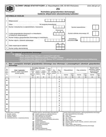 GŁÓWNY URZĄD STATYSTYCZNY, al. Niepodległości 208, 00-925 Warszawa www.stat.gov.pl ZG Kartoteka gospodarstwa domowego, badanie aktywności ekonomicznej ludności INFORMACJE OGÓLNE 1 Miejscowość . . . . . . . . . . . . . . . . . . . . . . . Ulica . . . . . . . . . . . . . . . . . . . . . . . . . 2 Nr budynku/mieszkania . . . . . . . . Numer mieszkania w województwie z losowania Symbol województwa I 3 Liczba gospodarstw domowych w mieszkaniu w kolejnych obserwacjach 4 Numer kolejny gospodarstwa domowego w mieszkaniu 5 Numer rejonu i obwodu spisowego 6 Data rozpoczęcia badania 7 Numer próby elementarnej Obserwacje II III IV Symbol oddziału terenowego US Identyfikator mieszkania IDM rok kw. Dział 1. Członkowie gospodarstwa domowego A. OBECNI NIEOBECNI, którzy spełniają jedno z poniższych kryteriów: - okres nieobecności faktycznej wynosi 3 miesiące i krócej, - okres nieobecności faktycznie jest dłuższy niż 3 miesiące, a całkowity okres nieobecności (faktycznej i planowanej) jest krótszy niż 1 rok. 1. Stan i powiązania wewnątrz gospodarstwa domowego oraz informacje o poszczególnych członkach gospodarstwa domowego Nr kol. osoby Imię i nazwisko (wpisać, jeżeli respondent wyraził zgodę) 1 2 a) Nr osoby, która jest Stan małżoncywil- WyPłeć kiem ojcem matką nya) kształ- 1 – M lub (ojczy- (maco(praw- cenieb) 2 – K partne- mem) chą) ny) rem 3 4 5 6 7 8 01 1 2 02 1 2 03 1 2 04 1 2 05 1 2 06 1 2 07 1 2 Symbol stanu cywilnego: 1 – kawaler, panna 2 – żonaty, zamężna 3 – wdowiec, wdowa 4 – rozwiedziony(-na), w separacji prawnej b) Symbol poziomu ukończonego wykształcenia: 00 – stopień naukowy (co najmniej doktora) 10 – tytuł magistra lub równorzędny 11 – tytuł licencjata lub inżyniera 12 – dyplom ukończenia kolegium 20 – świadectwo ukończenia szkoły policealnej, pomaturalnej 30 – średnie zawodowe 40 – średnie ogólnokształcące 50 – zasadnicze zawodowe 60 – gimnazjalne 70 – podstawowe 80 – niepełne podstawowe 90 – bez wykształcenia szkolnego Obywatelstwo nazwa 9 c) symbol 10 Kraj urodzenia nazwa 11 symbol 12 Stopień pokrewieństwa z głową gospodarstwa domowegoc) symnazwa bol 13 14 Symbol stopnia pokrewieństwa z głową gospodarstwa domowego: 01 – głowa gospodarstwa domowego 02 – mąż, żona 03 – partner, partnerka 04 – syn, córka 05 – zięć, synowa 06 – ojciec, matka, teść, teściowa 07 – dziadek, babcia, wnuk, wnuczka, prawnuk, prawnuczka 08 – brat, siostra 09 – wujek, ciotka, dalszy krewny 10 – niespokrewniony członek gospodarstwa domowego 2. Dodatkowe informacje o poszczególnych członkach gospodarstwa domowego Czy w bieżącym Nr roku Nr obRok miał(a) oso- ser- uroPan/ by wa- dzenia Pani już cji urodziny? 1 – tak 2 – nie 1 2 3 4 Okres nieobecności w gospodarstwie domowym Okres przebywania w Polsce Stopieńd) Gdzie Pan/Pani miesznieplanokał(a) rok temu? pełnowanyf) spraw(łącznie 1 - w tej samej gminie ności z fakty- 2 - w innej gminie, ale w tym (wpicznym) faktysamym województwie sać, czny [wypeł- 3 - w innym województwie faktyjeżeli (w miee) nić tylko (nazwa/symbol) czny respondla osób 4 - w innym kraju siądent przebycach) (nazwa/symbol) wyraził wających zgodę) w Polsce krócej niż 1 rok] 5 6 7 8 9 Miejsce pobytu osoby nieobecnej Przyczyna planoniewanyg) obec(łącznościh) nie z faktycznym) 10 11 (przebywającej w Polsce - nazwa województwa i miejscowości oraz symbol terytorialny miejscowości; przebywającej za granicą - nazwa i symbol kraju) 12 UczestNr nictwo ankiety w baZD daniui) 13 14 I II 01 III IV I II 02 III IV I II 03 III IV I II 04 III IV I II 05 III IV I II 06 III IV I II 07 III IV d) Symbol stopnia niepełnosprawności: 1 – orzeczenie o znacznym stopniu niepełnosprawności lub równoważne, 2 – orzeczenie o umiarkowanym stopniu niepełnosprawności lub równoważne, 3 – orzeczenie o lekkim stopniu niepełnosprawności lub równoważne, 9 – brak aktualnego orzeczenia o stopniu niepełnosprawności lub równoważnego; dziecko poniżej 16 lat. e) Symbol faktycznego okresu przebywania w Polsce: 3 miesiące lub krócej – symb. 98; dłużej niż 3 miesiące, ale krócej niż 1 rok – symb. 97; 1 rok lub dłużej – dokładna liczba lat (z zakresu 01 – 96); od urodzenia – symb. 00. f) Symbol planowanego okresu przebywania w Polsce: krócej niż 12 miesięcy – dokładna liczba miesięcy; 1 rok lub dłużej – symb. 12. g) Symbol planowanego okresu nieobecności: krócej niż 12 miesięcy – dokładna liczba miesięcy; 1 rok lub dłużej – symb. 12. Uwaga: Symb. 12 może wystąpić tylko w przypadku, kiedy okres nieobecności faktycznej nie przekracza 3 miesięcy. W przypadku gdy okres nieobecności faktycznej jest dłuższy niż 3 miesiące i osoba planuje przebywać poza gospodarstwem domowym (nieobecność faktyczna i planowana) 1 rok lub dłużej, ankieter powinien spisać tę osobę w części B lub C Kartoteki ZG. h) Symbol przyczyny nieobecności: na terenie Polski w gospodarstwach zbiorowych w związku z: 1 – wykonywaniem pracy przebywa w hotelu robotniczym; 2 – nauką przebywa w internacie, bursie, domu studenckim; 3 – innymi przyczynami (przebywa w domu pomocy społecznej, domu rencistów, domu dziecka, zakładzie wychowawczym, zakładzie dla przewlekle chorych itp.); na terenie Polski poza gospodarstwami zbiorowymi w związku z: 4 – wykonywaniem pracy; 5 – innymi przyczynami (np. pobyt w szpitalu); za granicą w związku z: 6 – wykonywaniem pracy; 7 – poszukiwaniem pracy; 8 – nauką; 9 – innymi przyczynami. i) Symbol uczestnictwa w badaniu: 1 – jest ankieta ZD; 2 – nieobecny(-na), brak ankiety ZD; 3 – odmówił(a) wywiadu, brak ankiety ZD; 4 – przybył(a), jest ankieta ZD; 5 – przybył(a) i nieobecny(-na), brak ankiety; 6 – przybył(a) i odmówił(a) wywiadu, brak ankiety ZD; 7 – opuścił(a) gospodarstwo domowe, brak ankiety ZD. B. PRZEBYWAJĄCY NA TERENIE KRAJU W GOSPO