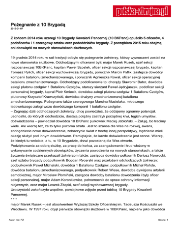 Pożegnanie z 10 Brygadą 2015-01-07 Z końcem 2014 roku szeregi 10 Brygady Kawalerii Pancernej (10 BKPanc) opuściło 5 oficerów, 4 podoficerów i 1 szeregowy sztabu oraz pododdziałów brygady. Z początkiem 2015 roku obejmą oni obowiązki na nowych stanowiskach służbowych. 19 grudnia 2014 roku w sali tradycji odbyło się pożegnanie żołnierzy, którzy wyznaczeni zostali na nowe stanowiska służbowe. Odchodzącymi oficerami byli: major Marek Rusek, szef sekcji rozpoznawczej 10BKPanc, kapitan Paweł Szostek, oficer sekcji rozpoznawczej brygady, kapitan Tomasz Rylich, oficer sekcji wychowawczej brygady, porucznik Marcin Pytlik, zastępca dowódcy kompanii batalionu zmechanizowanego, i porucznik Agnieszka Kowal, oficer sekcji operacyjnej batalionu zmechanizowanego. Odchodzący podoficerowie to: chorąży Sławomir Bator, dowódca załogi plutonu czołgów 1 Batalionu Czołgów, starszy sierżant Paweł Jędryjaszek, podoficer sekcji personalnej brygady, kapral Piotr Kmiecik, dowódca załogi plutonu czołgów 1 Batalionu Czołgów, plutonowy Krzysztof Krawczyński, dowódca drużyny zmechanizowanej batalionu zmechanizowanego. Pożegnano także szeregowego Marcina Musielaka, młodszego ładowniczego załogi wozu dowódczego kompanii 1 batalionu czołgów. – Żegnając dziś odchodzących żołnierzy, chcę powiedzieć, że oddajemy ogromny potencjał. Jednostki, do których odchodzicie, dostają potężny zastrzyk porządnej krwi, tęgich umysłów, doświadczenia – powiedział dowódca 10 BKPanc pułkownik Maciej Jabłoński. – Żałuję, bo tracimy wiele. Ale wierzę też, że to tylko pozorna strata. Jest to szansa dla Was na rozwój, awans, zdobędziecie nowe doświadczenia, zobaczycie świat z trochę innej perspektywy, będziecie mieli okazję służyć pod innym dowództwem. Pamiętajcie, że każde doświadczenie jest cenne. Wierzę, że kiedyś tu wrócicie, a tu, w 10 Brygadzie, drzwi pozostaną dla Was otwarte. Podziękowania za dobrą służbę, za pracę do końca, za zaangażowanie i trud włożony w wykonywanie codziennych obowiązków, życzenia powodzenia na nowych stanowiskach, a także życzenia świąteczne przekazali żołnierzom także: zastępca dowódcy pułkownik Dariusz Nawrocki, szef sztabu brygady podpułkownik Bogdan Rycerski oraz przełożeni odchodzących żołnierzy: podpułkownik Paweł Michalski, dowódca 1 Batalionu Czołgów, podpułkownik Michał Rohde, dowódca batalionu zmechanizowanego, podpułkownik Robert Wiese, dowódca dywizjonu artylerii samobieżnej, major Mirosław Płomiński, zastępca dowódcy batalionu dowodzenia i były oficer sekcji personalnej, major Adam Koronkiewicz, pełnomocnik do spraw ochrony informacji niejawnych, oraz major Leszek Zbąski, szef sekcji wychowawczej brygady. Uroczystość zakończyło wspólne, pamiątkowe zdjęcie przed tablicą 10 Brygady Kawalerii Pancernej. *** major Marek Rusek – jest absolwentem Wyższej Szkoły Oficerskiej im. Tadeusza Kościuszki we Wrocławiu. W 1997 roku objął pierwsze obowiązki służbowe w 10BKPanc, najpierw jako dowódca Autor: red. PZ Strona: 1 plutonu w kompanii rozpoznawczej, następnie jako dowódca kompanii (1999) i szef sekcji rozpoznawczej batalionu zmechanizowanego (2003). Od 2006 roku pełnił obowiązki szefa sztabu batalionu zmechanizowanego. Po ukończeniu studiów Operacyjno-Taktycznych w Akademii Obrony Narodowej został wyznaczony na stanowisko zastępcy dowódcy batalionu w 10 Batalionie Rozpoznawczym. Od 2010 roku był szefem sekcji rozpoznawczej wydziału rozpoznania i walki elektronicznej w dowództwie Czarnej Dywizji. Rok później objął obowiązki szefa sekcji rozpoznawczej w 10BKPanc. Od stycznia 2015 roku pełni obowiązki starszego specjalisty wydziału analiz i prognoz w Dowództwie Operacyjnym Rodzajów Sił Zbrojnych w stopniu podpułkownika. Wziął udział w I i IV zmianie PKW Irak oraz XIV zmianie PKW Afganistan. kapitan Paweł Szostek – jest absolwentem Wyższej Szkoły Oficerskiej im. Tadeusza Kościuszki we Wrocławiu. Obowiązki służbowej dowódcy plutonu – dowódcy grupy w kompanii rozpoznawczej w 34BKPanc objął w 1997 roku. W 1999 roku był dowódcą kompanii w 10 Batalionie Rozpoznawczym Strzelców Konnych w Żaganiu. W kolejnych latach pełnił obowiązki oficera operacyjnego batalionu czołgów w 34BKPanc (2000), oficera sekcji rozpoznawczej dywizjonu przeciwlotniczego (2001), szefa sekcji rozpoznawczej dywizjonu przeciwlotniczego (2004) oraz dowódcy kompanii dowodzenia batalionu czołgów w 34BKPanc (2009). Od 2012 roku służył w 10BKPanc jako oficer sekcji rozpoznawczej. Od stycznia 2015 pełni obowiązki szefa sekcji rozpoznawczej w 34BKPanc. Wziął udział w IV zmianie PKW Irak oraz I, VIII i XII zmianie PKW Afganistan. kapitan Tomasz Rylich – jest absolwentem Wyższej Szkoły Oficerskiej im. Tadeusza Kościuszki we Wrocławiu. W szeregi 10BKPanc wstąpił w 2004 roku jako dowódca plutonu ogniowego 1 baterii dywizjonu artylerii samobieżnej. W 2008 roku wyznaczony został na stanowisko zastępcy dowódcy baterii, a dwa lata później został oficerem wychowawczym dywizjonu. Od 2012 roku pełnił obowiązki oficera sekcji wychowawczej brygady. Od stycznia 2015 roku objął stanowisko oficera sekcji wychowawczej w 34BKPanc. porucznik Marcin Pytlik – jest absolwentem Wyższej Szkoły Oficerskiej Wojsk Lądowych we Wrocławiu. W 10BKPanc służbę rozpoczął od stanowiska dowódcy plutonu w batalionie zmechanizowanym. Od 2013 roku pełnił obowiązki zastępcy dowódcy kompanii – dowódcy załogi w tymże batalionie. Od stycznia 2015 roku pełni obowiązki dowódcy kompanii ochrony i regulacji ruchu w 11 Batalionie Dowodzenia. porucznik Agnieszka Kowal – jest absolwentką Wyższej Szkoły oficerskiej Wojsk Lądowych im. Tadeusza Kościuszki we Wrocławiu. W 2007 roku objęła obowiązki dowódcy plutonu w batalionie zmechanizowanym, a następnie wyznaczona została na stanowisko oficera sekcji operacyjne