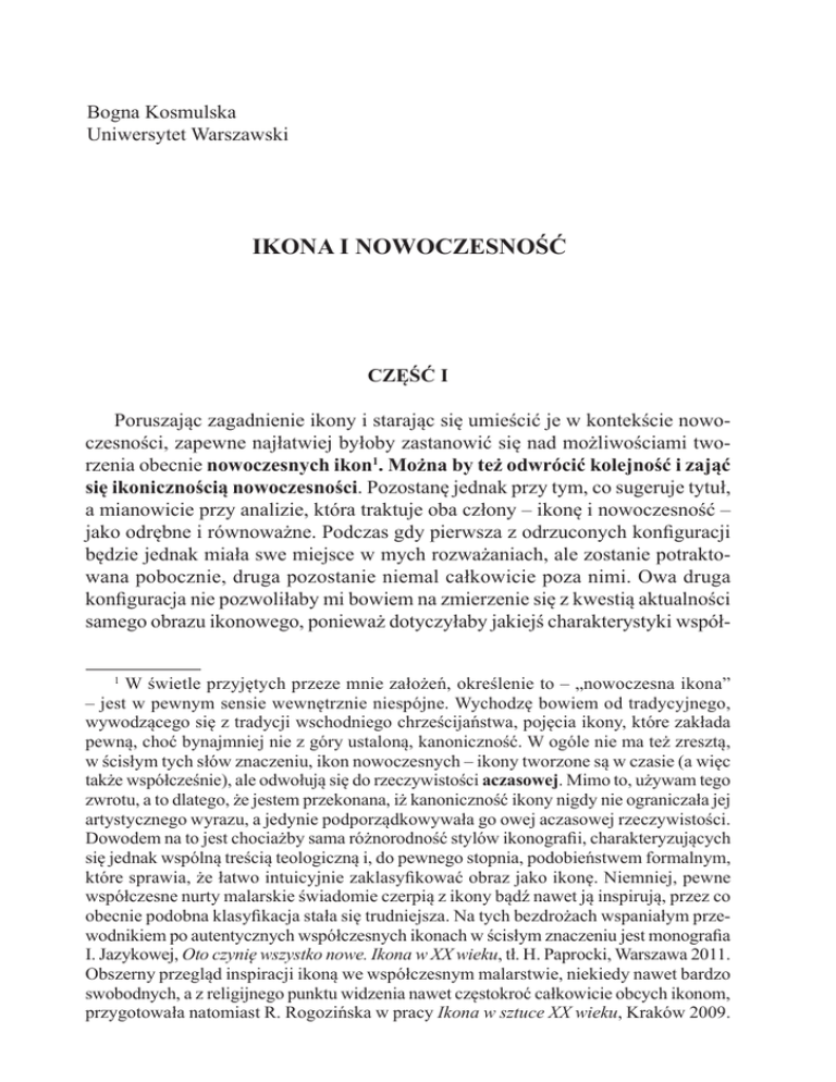 Bogna Kosmulska Uniwersytet Warszawski IKONA I NOWOCZESNOŚĆ CZĘŚĆ I Poruszając zagadnienie ikony i starając się umieścić je w kontekście nowoczesności, zapewne najłatwiej byłoby zastanowić się nad możliwościami tworzenia obecnie nowoczesnych ikon1. Można by też odwrócić kolejność i zająć się ikonicznością nowoczesności. Pozostanę jednak przy tym, co sugeruje tytuł, a mianowicie przy analizie, która traktuje oba człony – ikonę i nowoczesność – jako odrębne i równoważne. Podczas gdy pierwsza z odrzuconych konfiguracji będzie jednak miała swe miejsce w mych rozważaniach, ale zostanie potraktowana pobocznie, druga pozostanie niemal całkowicie poza nimi. Owa druga konfiguracja nie pozwoliłaby mi bowiem na zmierzenie się z kwestią aktualności samego obrazu ikonowego, ponieważ dotyczyłaby jakiejś charakterystyki współW świetle przyjętych przeze mnie założeń, określenie to – „nowoczesna ikona” – jest w pewnym sensie wewnętrznie niespójne. Wychodzę bowiem od tradycyjnego, wywodzącego się z tradycji wschodniego chrześcijaństwa, pojęcia ikony, które zakłada pewną, choć bynajmniej nie z góry ustaloną, kanoniczność. W ogóle nie ma też zresztą, w ścisłym tych słów znaczeniu, ikon nowoczesnych – ikony tworzone są w czasie (a więc także współcześnie), ale odwołują się do rzeczywistości aczasowej. Mimo to, używam tego zwrotu, a to dlatego, że jestem przekonana, iż kanoniczność ikony nigdy nie ograniczała jej artystycznego wyrazu, a jedynie podporządkowywała go owej aczasowej rzeczywistości. Dowodem na to jest chociażby sama różnorodność stylów ikonografii, charakteryzujących się jednak wspólną treścią teologiczną i, do pewnego stopnia, podobieństwem formalnym, które sprawia, że łatwo intuicyjnie zaklasyfikować obraz jako ikonę. Niemniej, pewne współczesne nurty malarskie świadomie czerpią z ikony bądź nawet ją inspirują, przez co obecnie podobna klasyfikacja stała się trudniejsza. Na tych bezdrożach wspaniałym przewodnikiem po autentycznych współczesnych ikonach w ścisłym znaczeniu jest monografia I. Jazykowej, Oto czynię wszystko nowe. Ikona w XX wieku, tł. H. Paprocki, Warszawa 2011. Obszerny przegląd inspiracji ikoną we współczesnym malarstwie, niekiedy nawet bardzo swobodnych, a z religijnego punktu widzenia nawet częstokroć całkowicie obcych ikonom, przygotowała natomiast R. Rogozińska w pracy Ikona w sztuce XX wieku, Kraków 2009. 1 Ikona i nowoczesność 21 czesnej kultury, która w oczywisty sposób jest ikoniczna, tj. obrazkowa, ale równocześnie, w pewnych swych przejawach, ikonoklastyczna. Objawia się to w różnych dziedzinach życia i myślenia, w gustach estetycznych ludzi współczesnych, i w samej estetyce oraz refleksji o sztuce. Otóż, o sztuce wiele się dziś mówi (tekst niniejszy, pozbawiony odwołań do konkretnych dzieł ikonowych jest zresztą tego wyrazem); obecnie, co wieścił już Hegel, „sztuka domaga się myślącej kontemplacji – wszelako nie w tym celu, aby tworzyć nowe dzieła sztuki, lecz aby poznać naukowo, czym jest sztuka”2. Ikona natomiast służy kontemplacji, nie tyle samej sztuki, ile – za pośrednictwem konkretnego wizerunku – czegoś, co poza nią samą wykracza. Celem moich dociekań będzie przede wszystkim podkreślenie tego aspektu i próba rekonstrukcji metafizycznego przesłania, które wiąże się z tym wykraczaniem, a które właściwe jest obrazowi ikonowemu z racji jego historycznej i religijnej natury. Będę się również starała wskazać punkty, które decydują o tym, że ikona jest na wskroś nienowoczesna, ale z zamierzeniem, by poprzez to doświadczenie obcości przejść do doświadczenia większej bliskości, jaką osiągnąć można poprzez życzliwą interpretację. Nie chciałabym jednak w tej interpretacji iść za daleko, sprowadzać ikonę na ziemię. Jest ona wszak przede wszystkim narzędziem wznoszenia do Nieba. To, co może jednak otwierać możliwości dalszej refleksji, to sposób interpretacji tego Nieba, które można rozumieć dosłownie – jako eschatologiczne spełnienie – i to należy do podstaw teologii obrazu, ale również jako pewne egzystencjalne doświadczenie, dzięki któremu stajemy się lepsi. Na marginesie tych wstępnych uwag dodam, że kategoria kultury, jaką posługiwać się będę dość często w swej pracy, brzmiąca nieco archaicznie i nazbyt totalizująco, jest mi niezbędna, ponieważ zestawiam z nowoczesnością także zjawiska bardzo odległe w czasie. Z konieczności zatem tworzę modele, które mogą wydawać się zbyt jednostronne. Wierzę jednak, że to, co rysuję tu w płaszczyźnie diachronicznej, ma także przełożenie na płaszczyznę synchroniczną w tym sensie, że dawne dzieje ikonoklazmu i ikonofilii toczą się w pewien sposób także przed naszymi oczyma i w naszych wnętrzach, że problem metafizyczności wielu zjawisk nie został jednoznacznie rozstrzygnięty, wreszcie, że wciąż stajemy bezradni wobec ikon, o których wiele się mówi, lecz które ostatecznie wymykają się słowom. Ze względu na konieczne rozbicie artykułu, winna jestem Czytelnikowi na zakończenie tych kilku słów wprowadzenia wyjaśnienie, co znajdzie się w Części I, a co w Części II pracy. Otóż, w niniejszym numerze podejmę ogólniejsze refleksje nad estetyczno-moralnym wymiarem nowoczesności (A.), nad zasadniczą sytuacją ikony w świecie współczesnym (B.) oraz zestawię nowoczesność 2 Cyt. za: W. Welsch, Filozofia i sztuka, tł. K. Guczalska, w: tegoż, Estetyka poza estetyką, red. K. Wilkoszewska, Kraków 2005, s. 16. 22 Bogna Kosmulska i ikonę, biorąc za punkt wyjścia wypowiedzi Dostojewskiego i Kristevej na temat obrazu Martwy Chrystus Hansa Holbeina Młodszego (C.). Od Chrystusa martwego – konkretnego dzieła malarskiego i nowożytnej formacji kulturowej przejdę do Chrystusa zmartwychwstałego – ikon