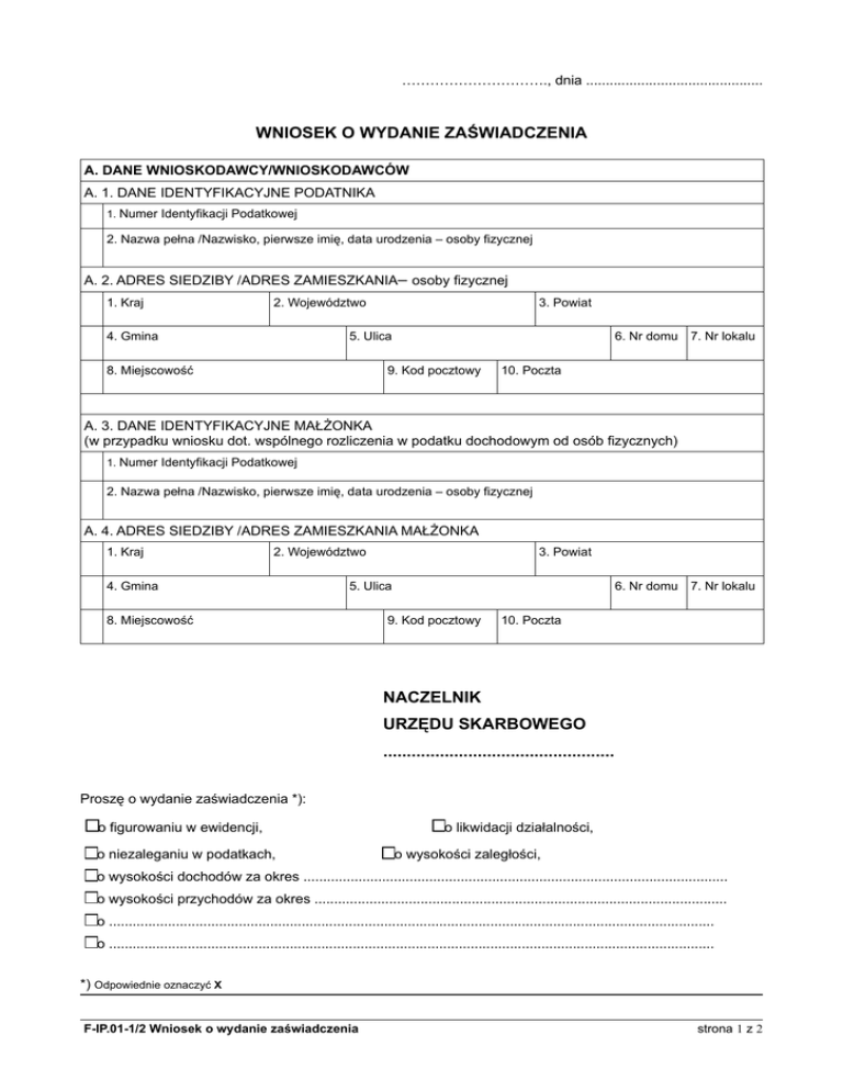 …………………………., dnia ............................................. WNIOSEK O WYDANIE ZAŚWIADCZENIA A. DANE WNIOSKODAWCY/WNIOSKODAWCÓW A. 1. DANE IDENTYFIKACYJNE PODATNIKA 1. Numer Identyfikacji Podatkowej 2. Nazwa pełna /Nazwisko, pierwsze imię, data urodzenia – osoby fizycznej A. 2. ADRES SIEDZIBY /ADRES ZAMIESZKANIA– osoby fizycznej 1. Kraj 2. Województwo 4. Gmina 3. Powiat 5. Ulica 8. Miejscowość 6. Nr domu 7. Nr lokalu 9. Kod pocztowy 10. Poczta A. 3. DANE IDENTYFIKACYJNE MAŁŻONKA (w przypadku wniosku dot. wspólnego rozliczenia w podatku dochodowym od osób fizycznych) 1. Numer Identyfikacji Podatkowej 2. Nazwa pełna /Nazwisko, pierwsze imię, data urodzenia – osoby fizycznej A. 4. ADRES SIEDZIBY /ADRES ZAMIESZKANIA MAŁŻONKA 1. Kraj 2. Województwo 4. Gmina 3. Powiat 5. Ulica 8. Miejscowość 6. Nr domu 7. Nr lokalu 9. Kod pocztowy 10. Poczta NACZELNIK URZĘDU SKARBOWEGO ................................................. Proszę o wydanie zaświadczenia *): o figurowaniu w ewidencji, o niezaleganiu w podatkach, o likwidacji działalności, o wysokości zaległości, o wysokości dochodów za okres ............................................................................................................ o wysokości przychodów za okres ......................................................................................................... o .......................................................................................................................................................... o .......................................................................................................................................................... *) Odpowiednie oznaczyć X F-IP.01-1/2 Wniosek o wydanie zaświadczenia strona 1 z 2 Oświadczam, że prowadzę działalność gospodarczą w zakresie: ............................................................................................................................................................................. na terenie działania Urzędu Skarbowego ........................................................................................................... Zaświadczenie jest mi potrzebne w celu przedłożenia ...................................................................................... w sprawie ........................................................................................................................................................... Zaświadczenie proszę wystawić w ......... egzemplarzach (podać ilość). W przypadku złożenia zeznania w innym urzędzie skarbowym prosi się o podanie nazwy tego urzędu: ............................................................................................................................................................................. Oświadczam, że nie/ składałam/em zeznania PIT......... w Urzędzie Skarbowym ............... .............................. ............................................................................................................................................................................. ................................................................................. Podpis/podpisy UWAGA! Zaświadczenie zostanie wydane po okazaniu dowodu osobistego wyłącznie osobie, której wniosek dotyczy lub osobie upoważnionej przez wnioskodawcę. UPOWAŻNIENIE Upoważniam/y Pana/Panią …..............................................................................PESEL.................................... legitymującego/ą się dowodem osobistym nr …................................................................................... wydanym przez ................................................................................................................................................... dnia ................................... do odbioru zaświadczenia wnioskowanego na odwrocie. .................................................................. (podpis wnioskodawcy/wnioskodawców) F-IP.01-1/2 Wniosek o wydanie zaświadczenia strona 2 z 2