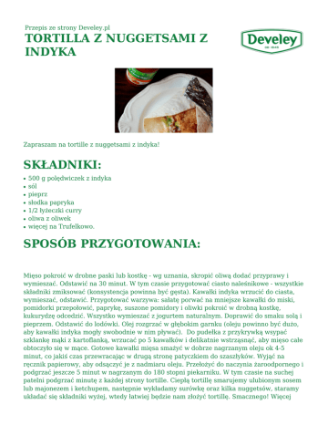 Przepis ze strony Develey.pl TORTILLA Z NUGGETSAMI Z INDYKA Zapraszam na tortille z nuggetsami z indyka! SKŁADNIKI: ● ● ● ● ● ● ● 500 g polędwiczek z indyka sól pieprz słodka papryka 1/2 łyżeczki curry oliwa z oliwek więcej na Trufelkowo. SPOSÓB PRZYGOTOWANIA: Mięso pokroić w drobne paski lub kostkę - wg uznania, skropić oliwą dodać przyprawy i wymieszać. Odstawić na 30 minut. W tym czasie przygotować ciasto naleśnikowe - wszystkie składniki zmiksować (konsystencja powinna być gęsta). Kawałki indyka wrzucić do ciasta, wymieszać, odstawić. Przygotować warzywa: sałatę porwać na mniejsze kawałki do miski, pomidorki przepołowić, paprykę, suszone pomidory i oliwki pokroić w drobną kostkę, kukurydzę odcedzić. Wszystko wymieszać z jogurtem naturalnym. Doprawić do smaku solą i pieprzem. Odstawić do lodówki. Olej rozgrzać w głębokim garnku (oleju powinno być dużo, aby kawałki indyka mogły swobodnie w nim pływać). Do pudełka z przykrywką wsypać szklankę mąki z kartoflanką, wrzucać po 5 kawałków i delikatnie wstrząsnąć, aby mięso całe obtoczyło się w mące. Gotowe kawałki mięsa smażyć w dobrze nagrzanym oleju ok 4-5 minut, co jakiś czas przewracając w drugą stronę patyczkiem do szaszłyków. Wyjąć na ręcznik papierowy, aby odsączyć je z nadmiaru oleju. Przełożyć do naczynia żaroodpornego i podgrzać jeszcze 5 minut w nagrzanym do 180 stopni piekarniku. W tym czasie na suchej patelni podgrzać minutę z każdej strony tortille. Ciepłą tortillę smarujemy ulubionym sosem lub majonezem i ketchupem, następnie wykładamy surówkę oraz kilka nuggetsów, staramy układać się składniki wyżej, wtedy łatwiej będzie nam złożyć tortillę. Smacznego! Więcej przepisów na Trufelkowo.