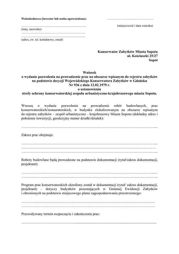 Wnioskodawca (inwestor lub osoba upowaŜniona): ………………………………………. ……………………………………………………….. (imię, nazwisko) ………………………………………………………. ………………………………………………………. (adres, ew. tel. kontaktowy, email) (miejscowość i data wniosku) Konserwator Zabytków Miasta Sopotu ul. Kościuszki 25/27 Sopot Wniosek o wydanie pozwolenia na prowadzenie prac na obszarze wpisanym do rejestru zabytków na podstawie decyzji Wojewódzkiego Konserwatora Zabytków w Gdańsku Nr 936 z dnia 12.02.1979 r. o ustanowieniu strefy ochrony konserwatorskiej zespołu urbanistyczno-krajobrazowego miasta Sopotu. Wnoszę o wydanie pozwolenia na prowadzenie robót budowlanych, prac konserwatorskich/restauratorskich, w budynku zlokalizowanym na obszarze wpisanym do rejestru zabytków – zespół urbanistyczno – krajobrazowy Miasta Sopotu (dokładny adres i połoŜenie inwestycji, geodezyjny numer działki/działek): …………………………………………………………………………………………………... Zakres prac obejmuje: …………………………………………………………………………………………………... …………………………………………………………………………………………………. …………………………………………………………………………………………………... Roboty budowlane będą prowadzone na podstawie dokumentacji (tytuł/zakres dokumentacji, projektant): ………………………………………………………………………………………………...… …………………………………………………………………………………………………... Program prac konserwatorskich określony został w dokumentacji (tytuł/ zakres dokumentacji, projektant) – dotyczy budynków pozostających w Gminnej Ewidencji Zabytków i chronionych na podstawie miejscowego planu zagospodarowania przestrzennego: ………………………………………………………………………………………………… ………………………………………………………………………………………………… Przewidywany termin rozpoczęcia i zakończenia prac: ……………………………………….......................................................................................... Imię, nazwisko i adres osoby kierującej pracami konserwatorskimi: ………………………………………........……………………………………………………. …………………………………………………………………………………………………. Oświadczam, Ŝe posiadam tytuł prawny do korzystania z zabytku1, wynikający z: ……………………………..…………………………………………………………………… ………………………………………………………………………………………………….. Do wniosku załączam: 1. 2 egzemplarze projektu, z których 1 pozostanie w Biurze Konserwatora Zabytków Miasta Sopotu. 2. Poprawnie wypełnione oświadczenie o prawie do dysponowania nieruchomością na cele budowlane, które składa się pod groźbą odpowiedzialności karnej i którego nie moŜe złoŜyć pełnomocnik osoby fizycznej (gdy w oświadczeniu przywołano zgody współwłaścicieli, zgody takie naleŜy załączyć) lub aktualny dokument potwierdzający posiadanie przez Wnioskodawcę tytułu prawnego do korzystania z nieruchomości zlokalizowanej w obszarze wpisanym do rejestru zabytków, wynikającego z prawa własności, uŜytkowania wieczystego, trwałego zarządu albo ograniczonego prawa rzeczowego lub stosunku zobowiązaniowego, tj. aktualny odpis Księgi Wieczystej (maksymalnie 3 miesięczny) i umowa najmu lub dzierŜawy - w przypadku najmu lub dzierŜawy) oraz zgoda wszystkich współwłaścicieli nieruchomości, a w przypadku Wspólnoty Mieszkaniowej uchwała Wspólnoty Mieszkaniowej pozwalająca na roboty budowlane. 3. UpowaŜnienie udzielone Wnioskodawcy działającemu w imieniu osoby posiadającej tytuł prawny do korzystania z nieruchomości - oryginał lub uwierzytelniona kopia (w przypadku, gdy zachodzi taka konieczność). 4. Dokumenty potwierdzające posiadanie kwalifikacji i praktyki zawodowej osoby wykonującej prace konserwatorskie/prace restauratorskie. 5. Dowód zapłaty opłaty skarbowej – uwierzytelniona na zgodność z oryginałem kopia (nie pobiera się opłaty na cele mieszkaniowe). ……………………………………….. (podpis wnioskodawcy) Opłata skarbowa 82,00 zł za wydanie pozwolenia na prace konserwatorskie, restauratorskie, roboty budowlane lub inne prace przy zabytku lub na obszarach wpisanych do rejestru zabytków; podstawa prawna: załącznik: Cz. III pkt 44 ppkt 2 do Ustawy z dnia 16 listopada 2006 r. o opłacie skarbowej (Dz. Ust. z 2006 r., nr 225, poz. 1635) 1 Pozwolenie na prace przy zabytku wydaje się na wniosek osoby fizycznej lub jednostki organizacyjnej posiadającej tytuł prawny do korzystania z zabytku, wynikający z prawa własności, uŜytkowania wieczystego, trwałego zarządu albo ograniczonego prawa rzeczowego lub stosunku zobowiązanego (art. 36 ust. 5 ustawy z dnia 23 lipca 2003 r. o ochronie zabytków i opiece nad zabytkami (Dz. U. z 2003 r. Nr 162, poz. 1568 z późniejszymi zmianami)).