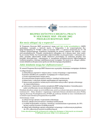 POLSKA AGENCJA ROZWOJU PRZEDSIÊBIORCZOŒCI POLISH AGENCY FOR ENTERPRISE DEVELOPMENT BEZPIECZEÑSTWO I HIGIENA PRACY W SEKTORZE MSP - PHARE 2002 PROGRAM ROZWOJU BHP Kto mo¿e ubiegaæ siê o wsparcie? W Programie Rozwoju BHP uczestniczyæ mog¹ mali lub œredni przedsiêbiorcy (MSP) spe³niaj¹cy warunki, o których mowa w Za³¹czniku I do rozporz¹dzenia Komisji Europejskiej Nr 70/2001 z dnia 12 stycznia 2001 r. w sprawie stosowania art. 87 i 88 Traktatu ustanawiaj¹cego Wspólnotê Europejsk¹ do pomocy pañstwa dla ma³ych i œrednich przedsiêbiorców. Ponadto wnioskodawca ubiegaj¹cy siê o dotacjê musi: mieæ siedzibê na terenie Polski, byæ bezpoœrednio odpowiedzialny za przygotowanie i wdro¿enie projektu, posiadaæ odpowiednie œrodki finansowe pozwalaj¹ce na realizacjê projektu oraz posiadaæ doœwiadczenie i umiejêtnoœci w zarz¹dzaniu przedsiêwziêciem odpowiadaj¹cym wielkoœci projektu, o którego wspó³finansowanie wystêpuje. Nie mo¿e m.in. zalegaæ z p³atnoœciami sk³adek na ubezpieczenia spo³eczne lub obowi¹zuj¹cych podatków. Jakie dzia³ania mog¹ byæ dofinansowane? W ramach Programu Rozwoju BHP finansowane s¹ projekty obejmuj¹ce nastêpuj¹ce dzia³ania: 1) us³ugi doradcze: a) identyfikacja zagro¿eñ w miejscu pracy i ocena zwi¹zanego z zagro¿eniami, b) pomiar szkodliwych czynników wystêpuj¹cych w miejscu pracy, c) ocena ergonomicznoœci miejsc pracy, d) ocena poziomu bezpieczeñstwa maszyn i instalacji technicznych, e) planowanie i wdro¿enie dzia³añ zapobiegaj¹cych zagro¿eniom, f) opracowanie projektów technicznych stosowania maszyn albo/i sprzêtu ochronnego na stanowiskach pracy, g) wdro¿enie i ulepszenie systemu zarz¹dzania BHP (us³ugi doradcze i konsultacyjne); audyt certyfikacyjny nie jest dzia³aniem kwalifikowanym. Dzia³ania doradcze uznaje siê za kwalifikowane, je¿eli s¹ wykonywane przez akredytowanych wykonawców - firmy doradcze i organizacje wspierania biznesu akredytowane przez Polsk¹ Agencjê Rozwoju Przedsiêbiorczoœci (PARP) do realizacji dzia³añ na rzecz wnioskodawców w ramach czêœci doradczej Programu Rozwoju BHP. 2) inwestycje, w tym: a) zakup nowego sprzêtu i wyposa¿enia ochronnego, b) koszty zakupu nowych maszyn i instalacji technicznych, c) wydatki bezpoœrednio zwi¹zane z instalacj¹ i uruchomieniem wyposa¿enia, do 10% ³¹cznej wartoœci kosztów kwalifikowanych, d) zakup indywidualnego sprzêtu ochronnego zwi¹zanego z realizowanym projektem, do 10% ca³kowitych kosztów kwalifikowanych. Lista akredytowanych wykonawców us³ug jest dostêpna w Internecie na stronach PARP pod adresem: http://www.parp.gov.pl Wsparcie na us³ugi doradcze musi zawieraæ siê w przedziale od 500 do 4000 EUR i nie mo¿e przekroczyæ 50% wartoœci kwalifikowanych kosztów netto. Wsparcie na inwestycje musi zawieraæ siê w przedziale od 2000 do 50 000 EUR i nie mo¿e przekroczyæ 50% kosztów kwalifikowanych netto dzia³añ. Gdzie z³o¿yæ wniosek? Wnioski wraz z wymaganymi za³¹cznikami nale¿y wysy³aæ w zaklejonej i oznaczonej kopercie listem poleconym, przesy³k¹ kuriersk¹ lub dostarczyæ osobiœcie (dostarczaj¹cy otrzyma potwierdzenie odbioru z podpisem i dat¹) na adres jednej z czterech Regionalnych Instytucji Finansuj¹cych (RIF). Województwo RIF dolnoœl¹skie, lubuskie, opolskie, wielkopolskie, Agencja Rozwoju Regionalnego S.A. w Koninie ul. Zak³adowa 4, 62-510 Konin tel. (0-63) 245-30-95, http://www.arrkonin.org.pl ma³opolskie, œl¹skie, œwiêtokrzyskie, podkarpackie Ma³opolska Agencja Rozwoju Regionalnego S.A. w Krakowie ul. Kordylewskiego 11, 31-542 Kraków tel. (0-12) 411-46-03, http://www.marr.pl pomorskie, zachodniopomorskie, kujawsko-pomorskie, warmiñsko-mazurskie Agencja Rozwoju Pomorza S.A. w Gdañsku ul. Piwna 36/39, 80-831 Gdañsk tel. (0-58) 323-31-10, http://www.arpg.gda.pl mazowieckie, podlaskie, lubelskie, ³ódzkie Fundacja Ma³ych i Œrednich Przedsiêbiorstw w Warszawie ul. Smocza 27, 01-048 Warszawa tel. (0-22) 838-02-61, http://www.fund.org.pl Terminy sk³adania wniosków Wyznaczono 4 terminy sk³adania wniosków, zawsze do godziny 15:00: 2 sierpnia, 27 wrzeœnia, 25 paŸdziernika, 2 grudnia 2004 r. Gdzie uzyskaæ informacje? Szczegó³owe informacje na temat warunków uczestnictwa w Programie oraz zasad sk³adania wniosków, a tak¿e wzory wniosków zawarte s¹ na stronie internetowej PARP http://www.parp.gov.pl Informacje na temat Programu mo¿na równie¿ uzyskaæ w miejscu sk³adania wniosku (RIF) oraz w Polskiej Agencji Rozwoju Przedsiêbiorczoœci tel. (0 22) 432 89 91 lub 92, 0 801 33 22 02, e-mail [email protected] Program Bezpieczeñstwo i Higiena Pracy w Sektorze MSP jest finansowany ze œrodków programu Phare 2002 Unii Europejskiej oraz œrodków bud¿etowych. Program wdra¿a Polska Agencja Rozwoju Przedsiêbiorczoœci dzia³aj¹ca pod nadzorem Pe³nomocnika ds. Realizacji Programu (PAO) w Ministerstwie Gospodarki i Pracy.