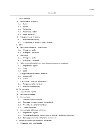 140660 Zawartość Przed zbiorem I. A. Dojrzewanie winogron A.1. Cukier A.2. Kwasy A.3. Dojrzałość A.4. Pobieranie próbek A.5. Skład winogron B. Przygotowanie do zbioru B.1. Prowadzenie winnicy B.2. Przygotowanie winiarni przed zbiorem Zbiór II. A. Odszypułkowywanie i miażdżenie A.1. Winogrona białe A.2. Winogrona czerwone B. Maceracja B.1. Winogrona białe B.2. Winogrona czerwone C. Wino z samocieku i wino z soku tłoczonego za pomocą prasy C.1. Zagadnienia ogólne C.2. Prasy C.3. Osad D. Korygowanie właściwości moszczu D.1. Kwasowość D.2. Cukier E. Chłodzenie i kontrola temperatury E.1. Temperatura fermentacji E.2. Kontrola temperatury III. Fermentacja A. Zagadnienia ogólne B. Drożdże winiarskie C. Fermentacja C.1. Fermentacja alkoholowa C.2. Samoczynne zatrzymanie fermentacji C.3. Produkty uboczne fermentacji C.4. Cukier resztkowy D. Fermentacja jabłkowo-mlekowa D.1. Zagadnienia ogólne D.2. Czynniki wpływające na przebieg fermentacji jabłkowo-mlekowej D.3. Zaszczepianie wina bakteriami mlekowymi IV. Zabiegi prowadzone w piwnicy winiarskiej A. Ściąganie wina znad osadu B. Stabilizacja B.1. Dysocjacja kwasu winowego B.2. Wodorowinian potasu B.3. Stabilizacja w niskich temperaturach B.4. Winian wapnia B.5. Zapobieganie krystalizacji wodorowinianu potasu lub jej przyspieszanie C. Klarowanie C.1. Stabilizacja białkowa C.2. Redukcja tanin C.3. Substancje klarujące o zastosowaniu ogólnym D. Filtrowanie D.1. Filtry płytowe D.2. Filtry membranowe D.3. Separatory mechaniczne E. Kupażowanie F. Utrzymanie piwnicy F.1. Higiena F.2. Przechowywanie wina Dojrzewanie w beczkach V. A. Bednarstwo A.1. Produkcja beczek A.2. Parowanie z beczek A.3. Utrzymanie beczek B. Dojrzewanie w beczce B.1. Skład drewna dębowego i ekstrakcja najważniejszych substancji B.2. Różnice między dębem francuskim a dębem amerykańskim B.3. Zamienniki dla beczek dębowych VI. Butelkowanie A. Opakowanie A.1. Butelki A.2. Korki A.3. Kapturki A.4. Etykiety B. Linia rozlewcza VII. Zagadnienia ogólne A. Dwutlenek siarki A.1. Dwutlenek siarki jako konserwant A.2. Zastosowanie dwutlenku siarki w produkcji wina B. Wady i choroby wina B.1. Wady chemiczne B.2. Choroby wina C. Przepisy prawne (Sylwia Bonin) C.1. Definicje C.2. Produkcja wyrobów winiarskich w Polsce C.3. Przepisy ogólne C.4. Wybrane praktyki enologiczne D. Związki fenolowe D.1. Związki fenolowe w winie D.2. Taniny D.3. Kolor czerwonego wina Dodatek: Ocena wina Analiza opisowa Ocena wina Literatura uzupełniająca
