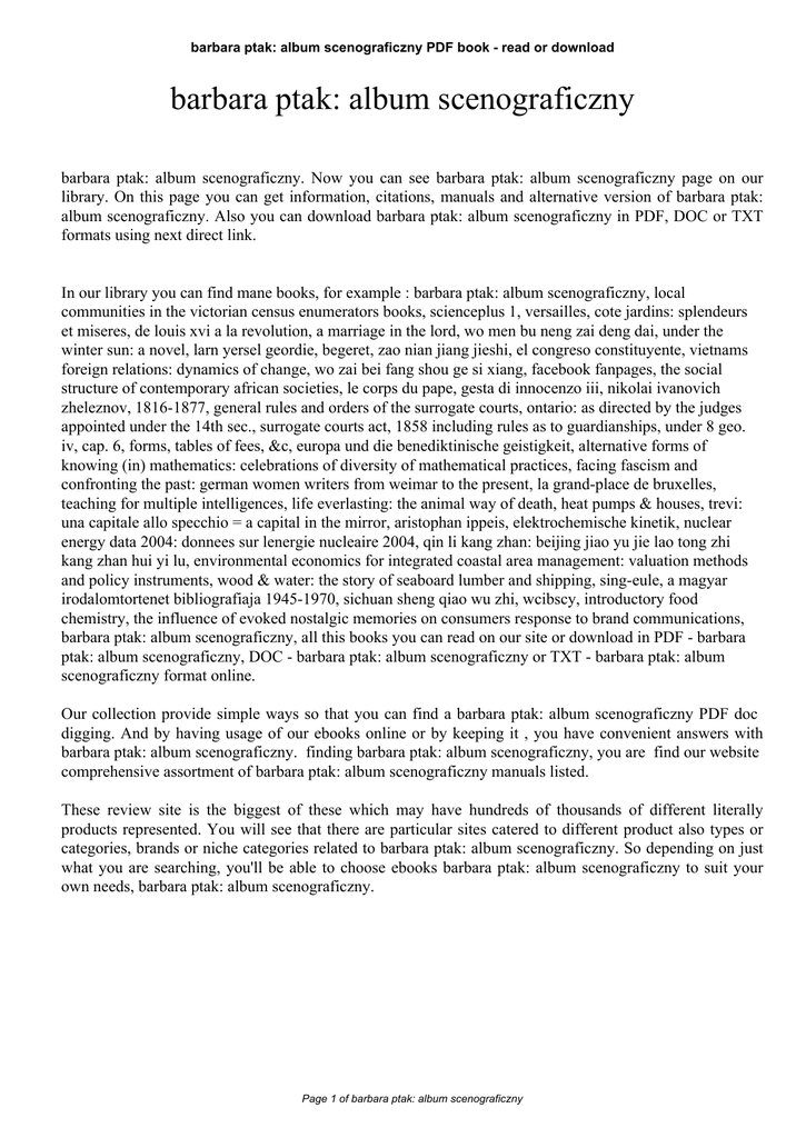 barbara ptak: album scenograficzny PDF book - read or download barbara ptak: album scenograficzny barbara ptak: album scenograficzny. Now you can see barbara ptak: album scenograficzny page on our library. On this page you can get information, citations, manuals and alternative version of barbara ptak: album scenograficzny. Also you can download barbara ptak: album scenograficzny in PDF, DOC or TXT formats using next direct link. In our library you can find mane books, for example : barbara ptak: album scenograficzny, local communities in the victorian census enumerators books, scienceplus 1, versailles, cote jardins: splendeurs et miseres, de louis xvi a la revolution, a marriage in the lord, wo men bu neng zai deng dai, under the winter sun: a novel, larn yersel geordie, begeret, zao nian jiang jieshi, el congreso constituyente, vietnams foreign relations: dynamics of change, wo zai bei fang shou ge si xiang, facebook fanpages, the social structure of contemporary african societies, le corps du pape, gesta di innocenzo iii, nikolai ivanovich zheleznov, 1816-1877, general rules and orders of the surrogate courts, ontario: as directed by the judges appointed under the 14th sec., surrogate courts act, 1858 including rules as to guardianships, under 8 geo. iv, cap. 6, forms, tables of fees, &c, europa und die benediktinische geistigkeit, alternative forms of knowing (in) mathematics: celebrations of diversity of mathematical practices, facing fascism and confronting the past: german women writers from weimar to the present, la grand-place de bruxelles, teaching for multiple intelligences, life everlasting: the animal way of death, heat pumps & houses, trevi: una capitale allo specchio = a capital in the mirror, aristophan ippeis, elektrochemische kinetik, nuclear energy data 2004: donnees sur lenergie nucleaire 2004, qin li kang zhan: beijing jiao yu jie lao tong zhi kang zhan hui yi lu, environmental economics for integrated coastal area management: valuation methods and policy instruments, wood & water: the story of seaboard lumber and shipping, sing-eule, a magyar irodalomtortenet bibliografiaja 1945-1970, sichuan sheng qiao wu zhi, wcibscy, introductory food chemistry, the influence of evoked nostalgic memories on consumers response to brand communications, barbara ptak: album scenograficzny, all this books you can read on our site or download in PDF - barbara ptak: album scenograficzny, DOC - barbara ptak: album scenograficzny or TXT - barbara ptak: album scenograficzny format online. Our collection provide simple ways so that you can find a barbara ptak: album scenograficzny PDF doc digging. And by having usage of our ebooks online or by keeping it , you have convenient answers with barbara ptak: album scenograficzny. finding barbara ptak: album scenograficzny, you are find our website comprehensive assortment of barbara ptak: album scenograficzny manuals listed. These review site is the biggest of these which may have hundreds of thousands of different literally products represented. You will see that there are particular sites catered to different product also types or categories, brands or niche categories related to barbara ptak: album scenograficzny. So depending on just what you are searching, you'll be able to choose ebooks barbara ptak: album scenograficzny to suit your own needs, barbara ptak: album scenograficzny. Page 1 of barbara ptak: album scenograficzny