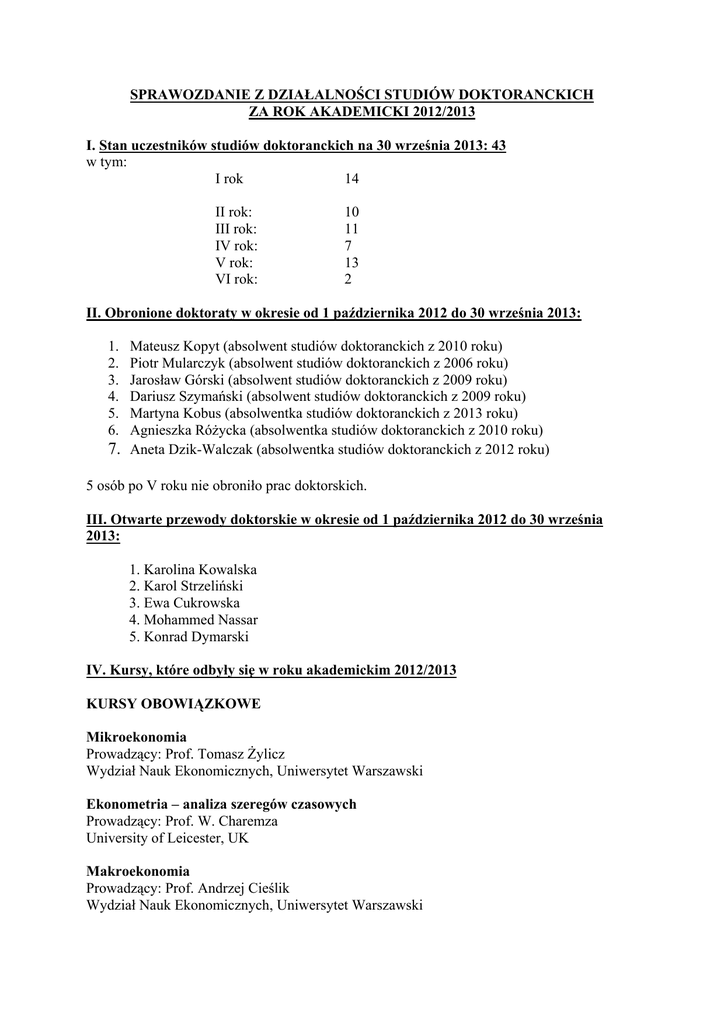 SPRAWOZDANIE Z DZIAŁALNOŚCI STUDIÓW DOKTORANCKICH ZA ROK AKADEMICKI 2012/2013 I. Stan uczestników studiów doktoranckich na 30 września 2013: 43 w tym: I rok 14 II rok: III rok: IV rok: V rok: VI rok: 10 11 7 13 2 II. Obronione doktoraty w okresie od 1 października 2012 do 30 września 2013: 1. 2. 3. 4. 5. 6. Mateusz Kopyt (absolwent studiów doktoranckich z 2010 roku) Piotr Mularczyk (absolwent studiów doktoranckich z 2006 roku) Jarosław Górski (absolwent studiów doktoranckich z 2009 roku) Dariusz Szymański (absolwent studiów doktoranckich z 2009 roku) Martyna Kobus (absolwentka studiów doktoranckich z 2013 roku) Agnieszka Różycka (absolwentka studiów doktoranckich z 2010 roku) 7. Aneta Dzik-Walczak (absolwentka studiów doktoranckich z 2012 roku) 5 osób po V roku nie obroniło prac doktorskich. III. Otwarte przewody doktorskie w okresie od 1 października 2012 do 30 września 2013: 1. Karolina Kowalska 2. Karol Strzeliński 3. Ewa Cukrowska 4. Mohammed Nassar 5. Konrad Dymarski IV. Kursy, które odbyły się w roku akademickim 2012/2013 KURSY OBOWIĄZKOWE Mikroekonomia Prowadzący: Prof. Tomasz Żylicz Wydział Nauk Ekonomicznych, Uniwersytet Warszawski Ekonometria – analiza szeregów czasowych Prowadzący: Prof. W. Charemza University of Leicester, UK Makroekonomia Prowadzący: Prof. Andrzej Cieślik Wydział Nauk Ekonomicznych, Uniwersytet Warszawski The Art and Science of Microeconomic Modeling Prowadzący: Prof. Oded Stark Wydział Nauk Ekonomicznych, Uniwersytet Warszawski Seminarium doktoranckie KURSY DODATKOWE Wstęp do optymalizacji nieliniowej Prowadzący: dr Gabriel Pietrzkowski Wydział Matematyki, Uniwersytet Warszawski Modelowanie makroekonomiczne Prowadzący: dr Krzysztof Makarski NBP, SGH LaTeX dla początkujących i średniozaawansowanych Prowadzący: mgr Jakub Pochrybniak Wydział Matematyki, Uniwersytet Warszawski Academic Research Skills, COMPETE training course Prowadzący: Prof. Steve Quarrie, Newcastle University, Bosko Nektarijevic, Balkan Security Network V. Wywiązywanie się z obowiązków doktoranta 1. Zaliczenia: - makroekonomia, odbyła się tylko część kursu prowadzona przez prof. A. Cieślika II rok: 2/9 nie zaliczyły III rok: 3/11 nie zaliczyło IV rok: 1/7 nie zaliczyła - mikroekonomia, 2/9 nie zaliczyły (także egzaminu poprawkowego) - ekonometria, 9/9 zaliczona - The Art and Science of Microeconomic Modeling, 2/9 nie zaliczyły (w tym: jedna osoba nie zaliczyła także egzaminu poprawkowego) 2. Otwarcie przewodu doktorskiego: III rok: 9/11 bez otwartego przewodu doktorskiego IV rok: 2/7 bez otwartego przewodu doktorskiego V rok: 3/14 bez otwartego przewodu doktorskiego 3. Wywiązywanie się z pensum: W załączeniu VI. Zestawienie zbiorcze publikacji: V rok Anacka Marta, Fihel Agnieszka, Selektywność emigracji i migracji powrotnych Polaków – o procesie „wypłukiwania”, Central and Eastern European Migration Research, Ośrodek Badań nad Migracjami, 1, 2013, 1, ss. 57-67 Anacka Marta, Fihel Agnieszka, Return migration to Poland in the post-accession period EU Labour Migration in Troubled Times, red. Galgoczi B., Leschke J., Watt A., Surrey, 2012, ASHGATE, Ośrodek Badań nad Migracjami, ss. 143-167 Kobus Martyna, Attribute decomposability of multidimensional inequality indices, Economics Letters 2012 Kobus Martyna, Miłoś Piotr, Inequality decomposition by population subgroups for ordinal data, Journal of Health Economics, 2012, ss. 15-21 Kobus Martyna, Oded Stark, Jakubek Marcin, A concern about low relative income, and the alignment of utilitarianism with egalitarianism, Economics Letters, 114, 2012 Kobus Martyna, Bukowski Paweł, Educational equality of opportunity in Poland, Ekonomista, 2012 IV rok Byra Łukasz , Stark Oded, Intentions to Return of Clandestine Migrants: Comment, Review of Development Economics, 2013, 17(1), ss. 156-162 Byra Łukasz , Stark Oded, A Back-Door Brain Drain, Economics Letters, 2012, 116(3), ss. 273-276 Byra Łukasz, Stark Oded, Rethinking the brain drain: Dynamice and Transition, International Review of Economics and Finance, 11, 2013 Gajderowicz Tomasz, Grotkowska Gabriela, Wincenciak Leszek, Premia płacowa z wykształcenia wyższego według grup zawodów, Ekonomista, 2012, 5, ss. 577-603 Gajderowicz Tomasz, Grotkowska Gabriela, Wincenciak Leszek, Determinanty czasu trwania bezrobocia absolwentów, Gospodarka Narodowa, 2012, ss. 11-12 Gajderowicz Tomasz, Grotkowska Gabriela, Wincenciak Leszek, Does students’ international mobility increase their employability?, Ekonomia, 2012, 30, 72-79 Gajderowicz Tomasz, Wincenciak Leszek, Grotkowska Gabriela, Demeter Paul, Methodology adopted in the DEHEMS Project, Employability of graduates and higher education management Systems. Final report of DEHEMS Project, red. Mateja Melink, Samo Pavlin, Ljubljana, 2012, University of Ljubljana, ss. 50-65 Gajderowicz Tomasz, Wincenciak Leszek, Grotkowska Gabriela, Determinants of graduates labour market success across domains: a comparative analysis, Employability of graduates and higher education management Systems. Final report of DEHEMS Project, red. Mateja Melink, Samo Pavlin, Ljubljana, 2012, University of Ljubljana, ss. 66-76 Gajderowicz Tomasz, Grotkowska Gabriela, Wincenciak Leszek, Review of professional domains and analysis of professional success of the graduates: Science, Employability of graduates and higher education management Systems. Final report of DEHEMS Project, red. Mateja Melink, Samo Pavlin, Ljubljana, 2012, University of Ljubljana, ss. 220-250 Gajderowicz Tomasz, Bobrowicz Barbara, Rynek pracy, Ekonomia eksperymentalna, red. Krawczyk Michał, Warszawa, 2012, Wolters Kluwer Wilamowski Maciej, Eksperymenty dydaktyczne, Ekonomia eksperymentalna, red. Michał Krawczyk, Warszawa, 2012, Wolters Kluwer, ss. 243-258 Krawczyk Michał, Wilamowski Maciej, Organizacja rynku, Ekonomia eksperymentalna, red. Michał Krawczyk, Warszawa, 2012, Wolters Kluwer, ss. 193-209 Kusztelak Przemysław, Wil