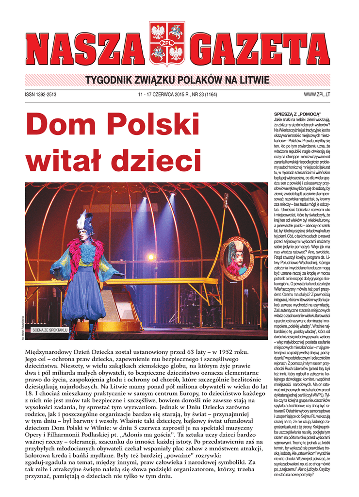 TYGODNIK ZWIĄZKU POLAKÓW NA LITWIE ISSN 1392-2513 11 - 17 CZERWCA 2015 R., NR 23 (1164) fot. Marian Paluszkiewicz Dom Polski witał dzieci SCENA ZE SPEKTAKLU Międzynarodowy Dzień Dziecka został ustanowiony przed 63 laty – w 1952 roku. Jego cel – ochrona praw dziecka, zapewnienie mu bezpiecznego i szczęśliwego dzieciństwa. Niestety, w wielu zakątkach ziemskiego globu, na którym żyje prawie dwa i pół miliarda małych obywateli, to bezpieczne dzieciństwo oznacza elementarne prawo do życia, zaspokojenia głodu i ochrony od chorób, które szczególnie bezlitośnie dziesiątkują najmłodszych. Na Litwie mamy ponad pół miliona obywateli w wieku do lat 18. I chociaż mieszkamy praktycznie w samym centrum Europy, to dzieciństwo każdego z nich nie jest znów tak bezpieczne i szczęśliwe, bowiem dorośli nie zawsze stają na wysokości zadania, by sprostać tym wyzwaniom. Jednak w Dniu Dziecka zarówno rodzice, jak i poszczególne organizacje bardzo się starają, by świat – przynajmniej w tym dniu – był barwny i wesoły. Właśnie taki dziecięcy, bajkowy świat ufundował dzieciom Dom Polski w Wilnie: w dniu 5 czerwca zaprosił je na spektakl muzyczny Opery i Filharmonii Podlaskiej pt. „Adonis ma gościa”. Ta sztuka uczy dzieci bardzo ważnej rzeczy – tolerancji, szacunku do inności każdej istoty. Po przedstawieniu zaś na przybyłych młodocianych obywateli czekał wspaniały plac zabaw z mnóstwem atrakcji, kolorowa kreda i bańki mydlane. Były też bardziej „poważne” rozrywki: zgaduj-zgadula na temat, między innymi, praw człowieka i narodowej symboliki. Za tak miłe i atrakcyjne święto należą się słowa podzięki organizatorom, którzy, trzeba przyznać, pamiętają o dzieciach nie tylko w tym dniu. WWW.ZPL.LT SPIESZĄ Z „POMOCĄ” Jakie znaki na niebie i ziemi wskazują, że zbliżamy się do kolejnych wyborów? Na Wileńszczyźnie już tradycyjnie jest to okazywanie troski o miejscowych mieszkańców – Polaków. Prawda, myliłby się ten, kto po tym stwierdzeniu uzna, że władzom republiki nagle otwierają się oczy na istniejące i nierozwiązywane od zarania litewskiej niepodległości problemy autochtonicznej mniejszości (akurat tu, w rejonach solecznickim i wileńskim będącej większością, co dla wielu spędza sen z powiek) i zakasawszy przysłowiowe rękawy biorą się do roboty, by ziemię zwrócić bądź uczciwie skompensować; nazwiska napisać tak, by krewny zza miedzy – bez trudu mógł je odczytać. Umieścić tabliczki z nazwami ulic i miejscowości, które by świadczyły, że kraj ten od wieków był wielokulturowy, a pierwiastek polski – obecny od setek lat, był istotną częścią składową kultury tej ziemi. Cóż, o takich cudach to nawet przed sejmowymi wyborami możemy sobie jedynie pomarzyć. Więc jak ma nas władza ratować? Ano, swoiście. Rząd stworzył kolejny program ds. Litwy Południowo-Wschodniej, którego założenia i wydzielane fundusze mogą być uznane raczej za kroplę w morzu potrzeb a nie rozpęd do tygrysiego skoku regionu. O powstaniu funduszu tejże Wileńszczyzny mówiła też pani prezydent. Czemu ma służyć? Z pewnością integracji, która w litewskim wydaniu jakoś zawsze wychodzi na asymilację. Zaś autentyczne starania miejscowych władz o zachowanie wielokulturowości uparcie jest nazywane dominacją i monopolem „polskiej władzy”. Właśnie najbardziej o tę „polską władzę”, która od dwóch dziesięcioleci wygrywa tu wybory – więc najwidoczniej posiada zaufanie miejscowych mieszkańców – mają pretensje ci, co pałają wielką chęcią „porządzenia” w podstołecznym i solecznickim rejonach. Z pomocą im tym razem przychodzi Ruch Liberałów (przed laty byli też inni), który ogłosił o założeniu kolejnego dziwoląga: komitetu wspólnot mniejszości narodowych. Ma on ratować miejscowych mieszkańców przed dyktaturą jednej partii (czyli AWPL). Tylko czy ta kolejna grupa nieudaczników spytała autochtonów, czy chcą być ratowani? Ostatnie wybory samorządowe i uzupełniające do Sejmu RL wskazują raczej na to, że nie czują żadnego zagrożenia akurat z tej strony. Kolejna próba uszczęśliwiania na siłę, podjęta tym razem na półtora roku przed wyborami sejmowymi. Trochę to jednak za krótki termin, by wykazać się prawdziwą troską i robotą. Ale „ratownikom” wyraźnie nie o to chodzi. Ważne jest pokazać, że są niezadowoleni, np. ci, co chcą mówić po „tutejszemu”. Ale to już było. Czyżby nie stać na nowe pomysły? 2 11 - 17 czerwca 2015 r., nr 23 (1164) www.zpl.lt Jesteśmy i będziemy Polakami fot. Paweł Stefanowicz Referat prezesa Michała Mackiewicza na 14. Zjeździe Związku Polaków na Litwie Szanowni Państwo, dostojni goście, delegaci Zjazdu. Powszechnie wiadomo, że nie da się ani zatrzymać, ani odwołać, ani nawet zahamować prawa przemijania. Wszystko ma początek i wszystko kiedyś się kończy. Ale to prawo – wydaje się – nie działa w stosunku do ZPL. Związek powołany do życia z pierwszym powiewem odrodzenia naszej tożsamości narodowej na początku lat dziewięćdziesiątych, żyje i rozwija się już ponad 25 lat nabierając wciąż nowych barw. Właśnie wtedy uświadomiliśmy sobie, że nadszedł czas podźwignąć się z kolan i podnieść głowę, by przemówić pełnią głosu: jesteśmy Polakami... Te nasze pięć prawd niektórym spędzają sen z powiek już od ćwierćwiecza, a nas łączyły i wciąż łączą w zwartych szeregach, byśmy jako Polacy potrafili zadbać o swoje interesy i prawa, budować swoje życie. Na początku mogło się wydawać, że tym zadaniom, jakie sobie wytyczyliśmy, zdołamy podołać i to w krótkim czasie. Mówiliśmy wówczas przede wszystkim o odkłamywaniu i pielęgnowaniu pamięci historycznej, popieraniu polskojęzycznego szkolnictwa, krzewieniu twórczości literackiej i działalności edytorskiej, rozwijaniu twórczości artystycznej 