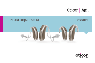 instrukcja OBSŁUGI miniBTE Podziękowanie Wskazania Dziękujemy za wybranie naszego produktu. Dołożyliśmy wszelkich starań, aby Twój nowy aparat słuchowy był najwyższej jakości, a także łatwy w użytkowaniu i obsłudze. Aparat słuchowy ma wzmacniać dźwięk i przesyłać go do ucha, kompensując ubytek słuchu. Twój aparat słuchowy jest przeznaczony dla ubytków słuchu od lekkich i umiarkowanych do znacznych. Zalecamy uważne przeczytanie instrukcji, co pozwoli w pełni wykorzystać wszystkie funkcje, jakie oferuje Twój nowy aparat. W zależności od Twoich potrzeb w aparacie można zaprogramować różne funkcje. Protetyk słuchu zaznaczy ustawione funkcje i programy aparatu/-ów w odpowiednich sekcjach instrukcji; pełną informację znajdziesz w tabelce na ostatniej stronie. Protetyk słuchu dostosowuje wzmocnienie do Twoich indywidualnych możliwości słuchowych. Jeżeli masz jakiekolwiek pytania dotyczące użytkowania lub obsługi aparatu słuchowego, skontaktuj się ze swoim protetykiem słuchu. Spis treści Ważna uwaga Prosimy o zapoznanie się z całą instrukcją przed rozpoczęciem korzystania z aparatu słuchowego. Zawarto w niej istotne informacje dotyczące właściwego i bezpiecznego używania aparatu słuchowego i baterii. Aparat miniBTE z Corda27 Aparat miniBTE z wkładką 9 Ostrzeżenia11 Uruchamianie aparatu słuchowego po raz pierwszy 15 Wymiana baterii 16 Włączanie/wyłączanie aparatu 18 Oznaczenie dla prawego i lewego ucha 19 Zakładanie aparatu z wkładką 20 21 Zakładanie aparatu z cienkim dźwiękowodem Corda2 Przycisk funkcji 22 Programy (opcja) 24 Regulator głośności (opcja) 26 Wyciszenie (opcja) 27 Komora baterii z zabezpieczeniem przed otwarciem (opcja) 28 Telefon Auto (opcja) 29 Codzienna pielęgnacja aparatu słuchowego 31 Dokończenie na następnej stronie Jak wymienić Corda2 33 34 Czyszczenie aparatu z cienkim dźwiękowodem Corda2 35 Codzienna pielęgnacja aparatu z nasadką Corda2 2 36 Wymiana nasadki Corda Codzienna pielęgnacja mikrowkładki z Corda237 Czyszczenie wkładki 39 Unikanie gorąca, wilgoci i chemikaliów 42 Używanie aparatu słuchowego 43 Najczęściej spotykane trudności i ich rozwiązania 48 Akcesoria bezprzewodowe 50 Międzynarodowa gwarancja 51 Telefon komórkowy 53 Informacje techniczne 55 Przegląd ustawień aparatu słuchowego 58 Aparat miniBTE z Corda2 Otwory mikrofonu Opcje wkładek: Cienki dźwiękowód Mikrowkładka Nasadka Nasadka Plus Nasadka otwarta: Przycisk funkcji Otwór wylotowy dźwięku Mała (S) Średnia (M) Duża (L) Żyłka mocująca Typ baterii: 312 7 Komora baterii Aparat miniBTE z wkładką Otwory mikrofonu Rożek Plastikowy dźwiękowód Przycisk funkcji Otwór wentylacyjny Otwór wylotowy dźwięku Ważna uwaga Należy całkowicie otworzyć komorę baterii, aby umożliwić obieg powietrza w Twoim aparacie, zwłaszcza w nocy lub gdy nie używasz go przez dłuższy czas. 8 Typ baterii: 312 Komora baterii Wkładka 9 Ostrzeżenia Przed założeniem aparatów słuchowych powinieneś w pełni zapoznać się z poniższymi przestrogami i całą zawartością broszury. Używanie aparatów słuchowych • Aparaty słuchowe mogą być używane tylko, jeśli zostały przepisane i dostrojone przez specjalistę. Rezultatem nieodpowiedniego użycia może być nagła i trwała utrata słuchu. • Nigdy nie pozwalaj innym osobom używać Twoich aparatów, ponieważ niewłaściwe używanie może spowodować u nich trwałe uszkodzenie słuchu. Ważna uwaga Należy całkowicie otworzyć komorę baterii, aby umożliwić obieg powietrza w Twoim aparacie, zwłaszcza w nocy lub gdy nie używasz go przez dłuższy czas. 10 Ryzyko zakrztuszenia/połknięcia • Aparaty słuchowe, ich części i baterie nie są zabawkami i powinny być przechowywane z dala od dzieci lub kogokolwiek, kto mógłby je połknąć czy też w inny sposób wyrządzić sobie krzywdę. • Nigdy nie zmieniaj baterii ani nie dostrajaj aparatu w obecności niemowląt, małych dzieci lub osób upośledzonych umysłowo. • Usuwaj baterie ostrożnie w miejscach, do których niemowlęta, małe dzieci i osoby upośledzone umysłowo nie mają dostępu. 11 • Nigdy nie wkładaj aparatu słuchowego ani baterii do ust. Są one śliskie i mogą zostać przez przypadek połknięte. • Zdarza się, że baterie bywają mylone z pastylkami; zawsze sprawdzaj leki przed połknięciem, aby uniknąć takiej pomyłki. • Większość aparatów słuchowych może być na życzenie wyposażona w komorę baterii z zabezpieczeniem przed otwarciem. Jest to szczególnie zalecane w przypadku niemowląt, małych dzieci i osób upośledzonych umysłowo. Jeżeli aparat słuchowy lub bateria zostały połknięte, należy natychmiast skontaktować się z lekarzem. Używanie baterii • Zawsze używaj baterii zalecanych przez Twojego protetyka słuchu. Baterie niskiej jakości mogą wyciekać, powodując uszkodzenie ciała i aparatu. • Nigdy nie próbuj ładować baterii. Mogą one eksplodować i spowodować poważne obrażenia. • Nigdy nie pal zużytych baterii. Mogą one eksplodować i spowodować poważne obrażenia. Przerwy w działaniu aparatu • Aparaty słuchowe mogą przestać działać na przykład, gdy baterie się wyczerpały lub jeśli słuchawka jest zatkana przez wilgoć lub woskowinę. Powinieneś być tego świadomy, szczególnie gdy uczestniczysz w ruchu ulicznym lub innych sytuacjach, gdzie można spotkać dźwięki ostrzegawcze. Aktywne implanty • Oticon zaleca ostrożność i postępowanie zgodnie z wytycznymi zalecanymi przez producentów implantów, np. rozruszników serca, dotyczących korzystania z telefonów komórkowych. • Jeżeli używasz implantu, trzymaj aparat słuchowy w odległości większej niż 15 cm od niego, np. nie w kieszonce na piersi. Jeżeli masz implant wszczepiony do mózgu, skontaktuj się z producentem urządzenia, aby uzyskać informacje na temat możliwych zakłóceń. • Narzędzie wielofunkcyjne ma wbudowa