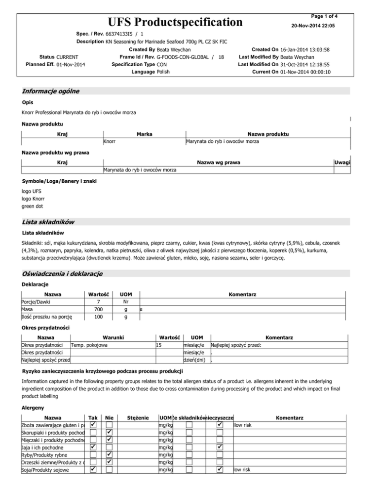 Page 1 of 4 UFS Productspecification 20-Nov-2014 22:05 Spec. / Rev. 66374133IS / 1 Description KN Seasoning for Marinade Seafood 700g PL CZ SK FIC Created By Frame Id / Rev. Specification Type Language Status CURRENT Planned Eff. 01-Nov-2014 Beata Weychan G-FOODS-CON-GLOBAL / 18 CON Polish Created On Last Modified By Last Modified On Current On 16-Jan-2014 13:03:58 Beata Weychan 31-Oct-2014 12:18:55 01-Nov-2014 00:00:10 Informacje ogólne Opis Knorr Professional Marynata do ryb i owoców morza Nazwa produktu Kraj Marka Nazwa produktu Marynata do ryb i owoców morza Knorr Nazwa produktu wg prawa Kraj Nazwa wg prawa Uwagi Marynata do ryb i owoców morza Symbole/Loga/Banery i znaki logo UFS logo Knorr green dot Lista składników Lista składników Składniki: sól, mąka kukurydziana, skrobia modyfikowana, pieprz czarny, cukier, kwas (kwas cytrynowy), skórka cytryny (5,9%), cebula, czosnek (4,3%), rozmaryn, papryka, kolendra, natka pietruszki, oliwa z oliwek najwyższej jakości z pierwszego tłoczenia, koperek (0,5%), kurkuma, substancja przeciwzbrylająca (dwutlenek krzemu). Może zawierać gluten, mleko, soję, nasiona sezamu, seler i gorczycę. Oświadczenia i deklaracje Deklaracje Nazwa Porcje/Dawki Masa Ilość proszku na porcję Wartość 7 700 100 UOM Nr g g Komentarz e Okres przydatności Nazwa Warunki Temp. pokojowa Okres przydatności Okres przydatności Najlepiej spożyć przed Wartość UOM miesiąc/e 15 miesiąc/e dzień(dni) Komentarz Najlepiej spożyć przed: . . Ryzyko zanieczyszczenia krzyżowego podczas procesu produkcji Information captured in the following property groups relates to the total allergen status of a product i.e. allergens inherent in the underlying ingredient composition of the product in addition to those due to cross contamination during processing of the product and which impact on final product labelling Alergeny Nazwa Tak Nie Stężenie Zboża zawierające gluten i produkty pochodne Skorupiaki i produkty pochodne Mięczaki i produkty pochodne Jaja i ich pochodne Ryby/Produkty rybne Orzeszki ziemne/Produkty z orzeszków ziemnych Soja/Produkty sojowe UOMZe składników Zanieczyszczenie mg/kg llow risk mg/kg mg/kg mg/kg mg/kg mg/kg mg/kg low risk Komentarz Page 2 of 4 UFS Productspecification 20-Nov-2014 22:05 Spec. / Rev. 66374133IS / 1 Description KN Seasoning for Marinade Seafood 700g PL CZ SK FIC Created By Frame Id / Rev. Specification Type Language Status CURRENT Planned Eff. 01-Nov-2014 Beata Weychan G-FOODS-CON-GLOBAL / 18 CON Polish Created On Last Modified By Last Modified On Current On 16-Jan-2014 13:03:58 Beata Weychan 31-Oct-2014 12:18:55 01-Nov-2014 00:00:10 Alergeny [Continued] Nazwa Tak Nie Stężenie Mleko/Produkty mleczne Orzechy/Produkty z orzechów Nasiona sezamu/Produkty z nasion sezamu Siarczyny (=> 10mg/kg) Seler Rośliny strączkowe/Nasiona roślin strączkowych (inne) Groch Musztarda/Produkty z gorczycy Łubin i produkty pochodne UOMZe składników Zanieczyszczenie mg/kg low risk mg/kg mg/kg llow risk mg/kg mg/kg low risk mg/kg mg/kg mg/kg low risk mg/kg Komentarz Diety - zagwarantowane Nazwa Wegańska Lakto-ovo-wegetariańska Lakto-wegetariańska Tak Nie Komentarz Tak Nie Komentarz Produkt wolny od: Nazwa Napromienianie Mięso Alkohol Deklaracje . Oświadczenia Nazwa Oświadczenie Oświadczenie Oświadczenie Oświadczenie Oświadczenie Oświadczenie Oświadczenie Oświadczenie Oświadczenie Oświadczenie Oświadczenie Oświadczenie Oświadczenie Oświadczenie Oświadczenie Opis 1 (icon) MSG 2 (icon) BEZ DODATKU GLUTAMINIANU SODU / NO ADDED MSG 3. 4. 5. 6. 7. 8. 9. 10. 11. 12(icon) 700 g 13. 14. 15. Oświadczenia / Orzeczenia . Instrukcje Sposób przygotowania Użycie: połącz z olejem lub nanieś bezpośrednio na mięso. Uwagi Page 3 of 4 UFS Productspecification 20-Nov-2014 22:05 Spec. / Rev. 66374133IS / 1 Description KN Seasoning for Marinade Seafood 700g PL CZ SK FIC Created By Frame Id / Rev. Specification Type Language Status CURRENT Planned Eff. 01-Nov-2014 Beata Weychan G-FOODS-CON-GLOBAL / 18 CON Polish Created On Last Modified By Last Modified On Current On 16-Jan-2014 13:03:58 Beata Weychan 31-Oct-2014 12:18:55 01-Nov-2014 00:00:10 Warunki przechowywania Przechowywać w suchym, chłodnym i zaciemnionym miejscu. Instrukcje bezpieczeństwa . Utylizacja . Instrukcja recepturowa Instrukcja recepturowa . Informacja żywieniowa Informacje żywieniowe (BoP) For Artwork: use nutritional values per 100 g as sold Wartość odżywcza 100 g Energia Tłuszcz w tym kw. tłuszczowe nasycone Węglowodany w tym cukry Błonnik Białko Sól kJ / kcal g g g g g g g Informacje żywieniowe na opakowanie [Produkt wprowadzany do obrotu] Inf. żywieniowe na produkt wprowadzany do obrotu Nazwa Wielkość porcji 100 G Wartość Wartości Energia Energia Białko Węglowodany Węglowodany w tym Tłuszcz Tłuszcz w tym Błonnik Sól Cecha kJ kcal Cukry Kwasy nasycone Pokarmowy as NaCl Składniki odżywcze Energia Energia kJ kcal Cecha na 100 UOM g produktu wprowadzanegona do100 obrotu ml produktu kJ 1083 kcal 258 g 4,9 g 45 g 8 g 3,2 g 0,3 g 4,1 g 29,5 Wskazane dzienne spożycie 8400 2000 na porcję 1083 258 4,9 45 8 3,2 0,3 4,1 29,5 % 13 13 oznaczenie GDA GDA Page 4 of 4 UFS Productspecification 20-Nov-2014 22:05 Spec. / Rev. 66374133IS / 1 Description KN Seasoning for Marinade Seafood 700g PL CZ SK FIC Status CURRENT Planned Eff. 01-Nov-2014 Składniki odżywcze Białko Węglowodany Węglowodany w tym Tłuszcz Tłuszcz w tym Błonnik Sól Created By Frame Id / Rev. Specification Type Language Cecha Cukry Kwasy nasycone Pokarmowy as NaCl Beata Weychan G-FOODS-CON-GLOBAL / 18 CON Polish Wskazane dzienne spożycie 50 260 90 70 20 6 * % referencyjnej wartości spożycia dla przeciętnej osoby dorosłej (8400 kJ/2000 kcal) Informacje żywieniowe na opakowanie [Na przygotowany produkt] * % referencyjnej wartości spożycia dla przeciętnej osoby dorosłej (8400 kJ/2000 kcal) Dane kontaktowe Kontakt www.ufs.com Unilever Food Solutions Unilever Polsk