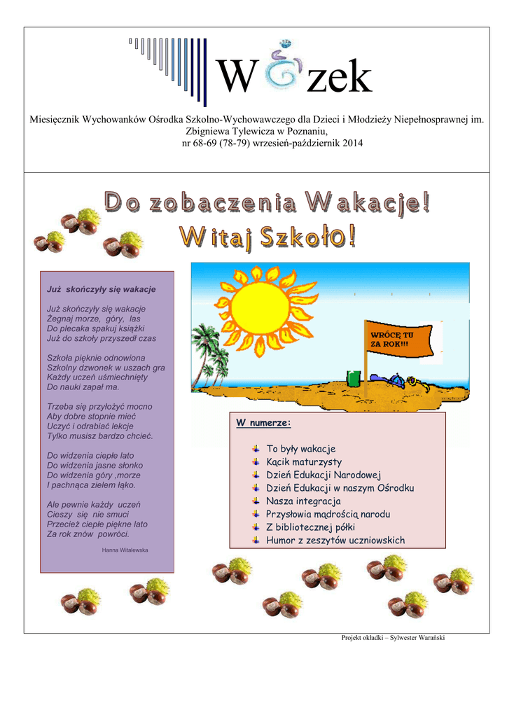 W zek Miesięcznik Wychowanków Ośrodka Szkolno-Wychowawczego dla Dzieci i Młodzieży Niepełnosprawnej im. Zbigniewa Tylewicza w Poznaniu, nr 68-69 (78-79) wrzesień-październik 2014 Już skończyły się wakacje Już skończyły się wakacje Żegnaj morze, góry, las Do plecaka spakuj książki Już do szkoły przyszedł czas Szkoła pięknie odnowiona Szkolny dzwonek w uszach gra Każdy uczeń uśmiechnięty Do nauki zapał ma. Trzeba się przyłożyć mocno Aby dobre stopnie mieć Uczyć i odrabiać lekcje Tylko musisz bardzo chcieć. Do widzenia ciepłe lato Do widzenia jasne słonko Do widzenia góry ,morze I pachnąca zielem łąko. Ale pewnie każdy uczeń Cieszy się nie smuci Przecież ciepłe piękne lato Za rok znów powróci. W numerze: To były wakacje Kącik maturzysty Dzień Edukacji Narodowej Dzień Edukacji w naszym Ośrodku Nasza integracja Przysłowia mądrością narodu Z bibliotecznej półki Humor z zeszytów uczniowskich Hanna Witalewska Projekt okładki – Sylwester Warański TO BYŁY WAKACJE… Jeszcze niedawno żegnaliśmy się, a tu już koniec wakacji. Pora wracać do szkoły, do naszych codziennych obowiązków, do matematyki, fizyki, biologii i tego wszystkiego, co nazywamy szkołą. Czy jednak nauka i pokonywanie własnych słabości nie przynosi nam satysfakcji? Przecież chyba o to chodzi, by rozwijać swoją wiedzę, umiejętności i osobowość. Tak, jak czytamy w refrenie hymnu naszego Ośrodka – Praca nad sobą ważna rzecz (…) powinniśmy dobrze wykorzystać czas. Czas roku szkolnego 2014/2015. A co to były za wakacje? Niechaj poniższe zdjęcia dadzą odpowiedź… W zek Kącik cik maturzysty... Przykładowe tematy wypracowań z języka polskiego… Centralna Komisja Egzaminacyjna zamieściła na swojej stronie www.cke.edu.pl przykładowe tematy wypracowań maturalnych, jakie mogą pojawić się na maturze od 2015 roku. Poniżej zamieszczamy przykłady. Temat 1. Czym może być dla człowieka podróżowanie? Rozważ problem i uzasadnij swoje stanowisko, odwołując się do podanego fragmentu reportażu Ryszarda Kapuścińskiego oraz innych, wybranych przez siebie, tekstów kultury. Twoja praca powinna liczyć co najmniej 250 słów. Temat 2. Zinterpretuj podany utwór. Postaw tezę interpretacyjną i uzasadnij ją. Twoja praca powinna liczyć co najmniej 250 słów. (zamieszczony w arkuszu tekst to Pieśń IX z Ksiąg wtórych Jana Kochanowskiego). Wyciąg z informatora CKE DZIEŃ EDUKACJI NARODOWEJ W naszym Ośrodku to dzień szczególnie ważny. Czcimy bowiem aż trzy ważne wydarzenia: obchody Dnia Patrona, Dnia Edukacji Narodowej i Ślubowanie Pierwszoklasistów na Sztandar Ośrodka. Może warto właśnie dlatego przypomnieć, że Dzień Edukacji Narodowej to polskie święto oświaty i szkolnictwa wyższego ustanowione 27 kwietnia 1972 r. określone ustawą – Karta praw i obowiązków nauczyciela jako Dzień Nauczyciela. Od 1982, na mocy ustawy – Karta Nauczyciela obchodzone jako Dzień Edukacji Narodowej. Święto to upamiętnia rocznicę powstania Komisji Edukacji Narodowej, która została utworzona z inicjatywy króla Stanisława Augusta Poniatowskiego i zrealizowana przez Sejm Rozbiorowy w dniu 14 października 1773 r. Potocznie, dzień ten nadal zwany jest Dniem Nauczyciela. Drodzy Pedagodzy i Pracownicy oświaty! W tym szczególnym dniu życzymy Wam dużo zdrowia i nieograniczonej ilości zapału i cierpliwości. Oby Wasza ciężka praca zawsze natrafiała na podatny grunt i wydawała plon stokrotny… Niechaj się kwiecą ścieżki Waszych wędrówek pedagogicznych. Wszystkiego najlepszego! Patrycja Łuczak Dzień Edukacji w naszym Ośrodku KWIATY POD TABLICĄ PAMIĄTKOWĄ, CZYLI 14. PAŹDZIERNIKA 2014 ROKU Uroczysta akademia z okazji Święta Edukacji Narodowej, Dnia Patrona oraz Ślubowania Uczniów Klas Pierwszych rozpoczęła się punktualnie o godzinie 1000. W tym roku aula, dzięki staraniom naszych nadwornych scenografów (Pan Krystian Reszel i Pani Marta Chlebna), przemieniła się w las pełen sów, będących nawiązaniem do statuetki wręczanej Przyjaciołom Ośrodka. W roli konferansjerów zadebiutowały uczennice klasy pierwszej liceum: Dominika i Julia, które poprowadziły uroczystość według scenariusza przygotowanego przez Panią Barbarę Nowak. Po powitaniu przybyłych gości i wręczeniu kwiatów Pani Teresie Tylewicz – żonie naszego Patrona, na scenie pojawiły się Angelika i Patrycja (z kl. 1 LOb), które przypomniały wszystkim zgromadzonym życiorys Dyrektora Zbigniewa Tylewicza, będącego naszym Patronem już 10 lat. Do wartości moralnych, na straży których stał Pan Tylewicz, nawiązywała pierwsza etiuda, przygotowana pod kierunkiem Państwa Reszel i Pani Marty Chlebnej przez Bezsennych. Stanowiła ona jednocześnie wstęp do drugiej części uroczystości, dedykowanej wszystkim pracownikom Ośrodka. Życzenia gronu pedagogicznemu oraz wszystkim pracownikom niepedagogicznym złożyli przedstawiciele Samorządu Uczniowskiego. Później komentarz do prezentacji multimedialnej, ukazującej jak w różnych egzotycznych miejscach na świecie honoruje się pedagogów w dniu ich święta, przeczytały Natalia (kl. 3 LO a) i Iza (kl. 2 LO a). Wreszcie głos zabrała Pani Dyrektor Aleksandra Skorniak: złożyła życzenia z okazji Dnia Edukacji, przypomniała poczet osób nagrodzonych statuetką Sowy oraz zaprosiła do tego grona Panią Dr Elżbietę Szczepaniak i Pana Leszka Górnego. Ciepłe słowa do nauczycieli i pierwszoklasistów z okazji ich święta skierowała również Inspektor Wydziału Oświaty – Pani Ewa Harmaciej. O pomocy, współdziałaniu, dostrzeganiu potrzeb drugiego człowieka i przyjaźni, czyli tym wszystkim, czym charakteryzują się ludzie wielkiego serca, była druga etiuda, przygotowana przez Bezsennych. Później odbyło się Ślubowanie Uczniów Klas Pierwszych szkół działających w Ośrodku. Zamknęło ono tegoroczną uroczystość. Barbara Nowak Przysłowia mą
