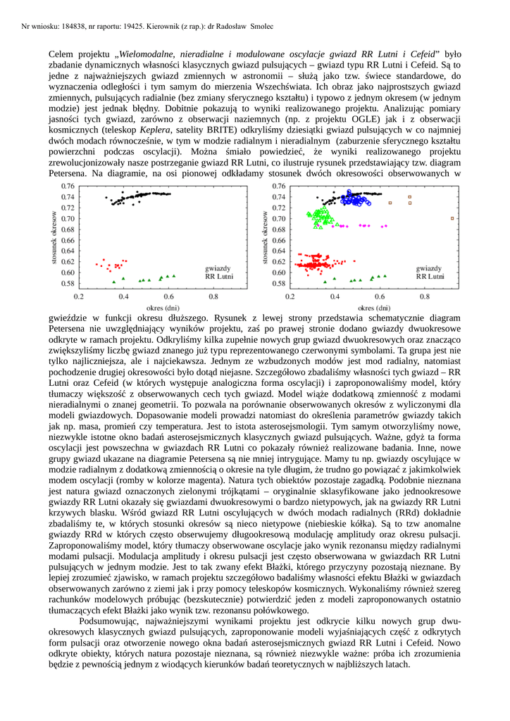 Nr wniosku: 184838, nr raportu: 19425. Kierownik (z rap.): dr Radosław Smolec Celem projektu „Wielomodalne, nieradialne i modulowane oscylacje gwiazd RR Lutni i Cefeid” było zbadanie dynamicznych własności klasycznych gwiazd pulsujących – gwiazd typu RR Lutni i Cefeid. Są to jedne z najważniejszych gwiazd zmiennych w astronomii – służą jako tzw. świece standardowe, do wyznaczenia odległości i tym samym do mierzenia Wszechświata. Ich obraz jako najprostszych gwiazd zmiennych, pulsujących radialnie (bez zmiany sferycznego kształtu) i typowo z jednym okresem (w jednym modzie) jest jednak błędny. Dobitnie pokazują to wyniki realizowanego projektu. Analizując pomiary jasności tych gwiazd, zarówno z obserwacji naziemnych (np. z projektu OGLE) jak i z obserwacji kosmicznych (teleskop Keplera, satelity BRITE) odkryliśmy dziesiątki gwiazd pulsujących w co najmniej dwóch modach równocześnie, w tym w modzie radialnym i nieradialnym (zaburzenie sferycznego kształtu powierzchni podczas oscylacji). Można śmiało powiedzieć, że wyniki realizowanego projektu zrewolucjonizowały nasze postrzeganie gwiazd RR Lutni, co ilustruje rysunek przedstawiający tzw. diagram Petersena. Na diagramie, na osi pionowej odkładamy stosunek dwóch okresowości obserwowanych w gwieździe w funkcji okresu dłuższego. Rysunek z lewej strony przedstawia schematycznie diagram Petersena nie uwzględniający wyników projektu, zaś po prawej stronie dodano gwiazdy dwuokresowe odkryte w ramach projektu. Odkryliśmy kilka zupełnie nowych grup gwiazd dwuokresowych oraz znacząco zwiększyliśmy liczbę gwiazd znanego już typu reprezentowanego czerwonymi symbolami. Ta grupa jest nie tylko najliczniejsza, ale i najciekawsza. Jednym ze wzbudzonych modów jest mod radialny, natomiast pochodzenie drugiej okresowości było dotąd niejasne. Szczegółowo zbadaliśmy własności tych gwiazd – RR Lutni oraz Cefeid (w których występuje analogiczna forma oscylacji) i zaproponowaliśmy model, który tłumaczy większość z obserwowanych cech tych gwiazd. Model wiąże dodatkową zmienność z modami nieradialnymi o znanej geometrii. To pozwala na porównanie obserwowanych okresów z wyliczonymi dla modeli gwiazdowych. Dopasowanie modeli prowadzi natomiast do określenia parametrów gwiazdy takich jak np. masa, promień czy temperatura. Jest to istota asterosejsmologii. Tym samym otworzyliśmy nowe, niezwykle istotne okno badań asterosejsmicznych klasycznych gwiazd pulsujących. Ważne, gdyż ta forma oscylacji jest powszechna w gwiazdach RR Lutni co pokazały również realizowane badania. Inne, nowe grupy gwiazd ukazane na diagramie Petersena są nie mniej intrygujące. Mamy tu np. gwiazdy oscylujące w modzie radialnym z dodatkową zmiennością o okresie na tyle długim, że trudno go powiązać z jakimkolwiek modem oscylacji (romby w kolorze magenta). Natura tych obiektów pozostaje zagadką. Podobnie nieznana jest natura gwiazd oznaczonych zielonymi trójkątami – oryginalnie sklasyfikowane jako jednookresowe gwiazdy RR Lutni okazały się gwiazdami dwuokresowymi o bardzo nietypowych, jak na gwiazdy RR Lutni krzywych blasku. Wśród gwiazd RR Lutni oscylujących w dwóch modach radialnych (RRd) dokładnie zbadaliśmy te, w których stosunki okresów są nieco nietypowe (niebieskie kółka). Są to tzw anomalne gwiazdy RRd w których często obserwujemy długookresową modulację amplitudy oraz okresu pulsacji. Zaproponowaliśmy model, który tłumaczy obserwowane oscylacje jako wynik rezonansu między radialnymi modami pulsacji. Modulacja amplitudy i okresu pulsacji jest często obserwowana w gwiazdach RR Lutni pulsujących w jednym modzie. Jest to tak zwany efekt Błażki, którego przyczyny pozostają nieznane. By lepiej zrozumieć zjawisko, w ramach projektu szczegółowo badaliśmy własności efektu Błażki w gwiazdach obserwowanych zarówno z ziemi jak i przy pomocy teleskopów kosmicznych. Wykonaliśmy również szereg rachunków modelowych próbując (bezskutecznie) potwierdzić jeden z modeli zaproponowanych ostatnio tłumaczących efekt Błażki jako wynik tzw. rezonansu połówkowego. Podsumowując, najważniejszymi wynikami projektu jest odkrycie kilku nowych grup dwuokresowych klasycznych gwiazd pulsujących, zaproponowanie modeli wyjaśniających część z odkrytych form pulsacji oraz otworzenie nowego okna badań asterosejsmicznych gwiazd RR Lutni i Cefeid. Nowo odkryte obiekty, których natura pozostaje nieznana, są również niezwykle ważne: próba ich zrozumienia będzie z pewnością jednym z wiodących kierunków badań teoretycznych w najbliższych latach.