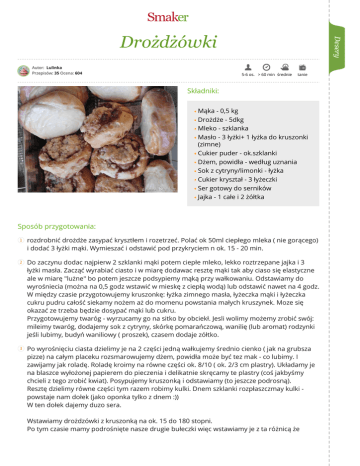 Drożdżówki Autor: Lulinka Przepisów: 35 Ocena: 604 5-6 os. > 60 min średnie tanie Składniki: Mąka - 0,5 kg Drożdże - 5dkg Mleko - szklanka Masło - 3 łyżki+ 1 łyżka do kruszonki (zimne) Cukier puder - ok.szklanki Dżem, powidła - według uznania Sok z cytryny/limonki - łyżka Cukier kryształ - 3 łyżeczki Ser gotowy do serników Jajka - 1 całe i 2 żółtka Sposób przygotowania: 1 rozdrobnić drożdże zasypać krysztłem i rozetrzeć. Polać ok 50ml ciepłego mleka ( nie gorącego) i dodać 3 łyżki mąki. Wymieszać i odstawić pod przykryciem n ok. 15 - 20 min. 2 Do zaczynu dodac najpierw 2 szklanki mąki potem ciepłe mleko, lekko roztrzepane jajka i 3 łyżki masła. Zacząć wyrabiać ciasto i w miarę dodawac resztę mąki tak aby ciaso się elastyczne ale w miarę "lużne" bo potem jeszcze podsypiemy mąką przy wałkowaniu. Odstawiamy do wyrośniecia (można na 0,5 godz wstawić w mieskę z ciepłą wodą) lub odstawić nawet na 4 godz. W między czasie przygotowujemy kruszonkę: łyżka zimnego masła, łyżeczka mąki i łyżeczka cukru pudru całość siekamy nożem aż do momenu powstania małych kruszynek. Moze się okazać ze trzeba będzie dosypać mąki lub cukru. Przygotowujemy twaróg - wyrzucamy go na sitko by obciekł. Jesli wolimy możemy zrobić swój: mileimy twaróg, dodajemy sok z cytryny, skórkę pomarańczową, wanilię (lub aromat) rodzynki jeśli lubimy, budyń waniliowy ( proszek), czasem dodaje zółtko. 3 Po wyrośnięciu ciasta dzielimy je na 2 części jedną wałkujemy średnio cienko ( jak na grubsza pizze) na całym placeku rozsmarowujemy dżem, powidła może być tez mak - co lubimy. I zawijamy jak roladę. Roladę kroimy na równe części ok. 8/10 ( ok. 2/3 cm plastry). Układamy je na blaszce wyłożonej papierem do pieczenia i delikatnie skręcamy te plastry (coś jakbyśmy chcieli z tego zrobić kwiat). Posypujemy kruszonką i odstawiamy (to jeszcze podrosną). Resztę dzielimy równe części tym razem robimy kulki. Dnem szklanki rozpłaszczmay kulki powstaje nam dołek (jako oponka tylko z dnem :)) W ten dołek dajemy duzo sera. Wstawiamy drożdzówki z kruszonką na ok. 15 do 180 stopni. Po tym czasie mamy podrośnięte nasze drugie bułeczki więc wstawiamy je z ta różnicą że podpiekamy je dodatkowo 3 minuty z górną grzałką. Po wystygnięciu polewamy bułeczki lukrem. Lukier: łyżka soku z cytryny i dodajemy cukier puder ażdo momentu kiedy sok będzie chłonął a masa uzyska konsystencję gęstej śmietany. Twoje notatki do przepisu:
