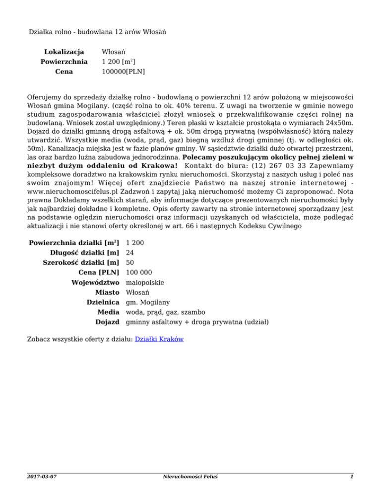Działka rolno - budowlana 12 arów Włosań Lokalizacja Włosań Powierzchnia Cena 1 200 [m2] 100000[PLN] Oferujemy do sprzedaży działkę rolno - budowlaną o powierzchni 12 arów położoną w miejscowości Włosań gmina Mogilany. (część rolna to ok. 40% terenu. Z uwagi na tworzenie w gminie nowego studium zagospodarowania właściciel złożył wniosek o przekwalifikowanie części rolnej na budowlaną. Wniosek został uwzględniony.) Teren płaski w kształcie prostokąta o wymiarach 24x50m. Dojazd do działki gminną drogą asfaltową + ok. 50m drogą prywatną (współwłasność) którą należy utwardzić. Wszystkie media (woda, prąd, gaz) biegną wzdłuż drogi gminnej (tj. w odległości ok. 50m). Kanalizacja miejska jest w fazie planów gminy. W sąsiedztwie działki dużo otwartej przestrzeni, las oraz bardzo luźna zabudowa jednorodzinna. Polecamy poszukującym okolicy pełnej zieleni w niezbyt dużym oddaleniu od Krakowa! Kontakt do biura: (12) 267 03 33 Zapewniamy kompleksowe doradztwo na krakowskim rynku nieruchomości. Skorzystaj z naszych usług i poleć nas swoim znajomym! Więcej ofert znajdziecie Państwo na naszej stronie internetowej www.nieruchomoscifelus.pl Zadzwoń i zapytaj jaką nieruchomość możemy Ci zaproponować. Nota prawna Dokładamy wszelkich starań, aby informacje dotyczące prezentowanych nieruchomości były jak najbardziej dokładne i kompletne. Opis oferty zawarty na stronie internetowej sporządzany jest na podstawie oględzin nieruchomości oraz informacji uzyskanych od właściciela, może podlegać aktualizacji i nie stanowi oferty określonej w art. 66 i następnych Kodeksu Cywilnego Powierzchnia działki [m2] 1 200 Długość działki [m] 24 Szerokość działki [m] 50 Cena [PLN] 100 000 Województwo malopolskie Miasto Włosań Dzielnica gm. Mogilany Media woda, prąd, gaz, szambo Dojazd gminny asfaltowy + droga prywatna (udział) Zobacz wszystkie oferty z działu: Działki Kraków 2017-03-07 Nieruchomości Feluś 1