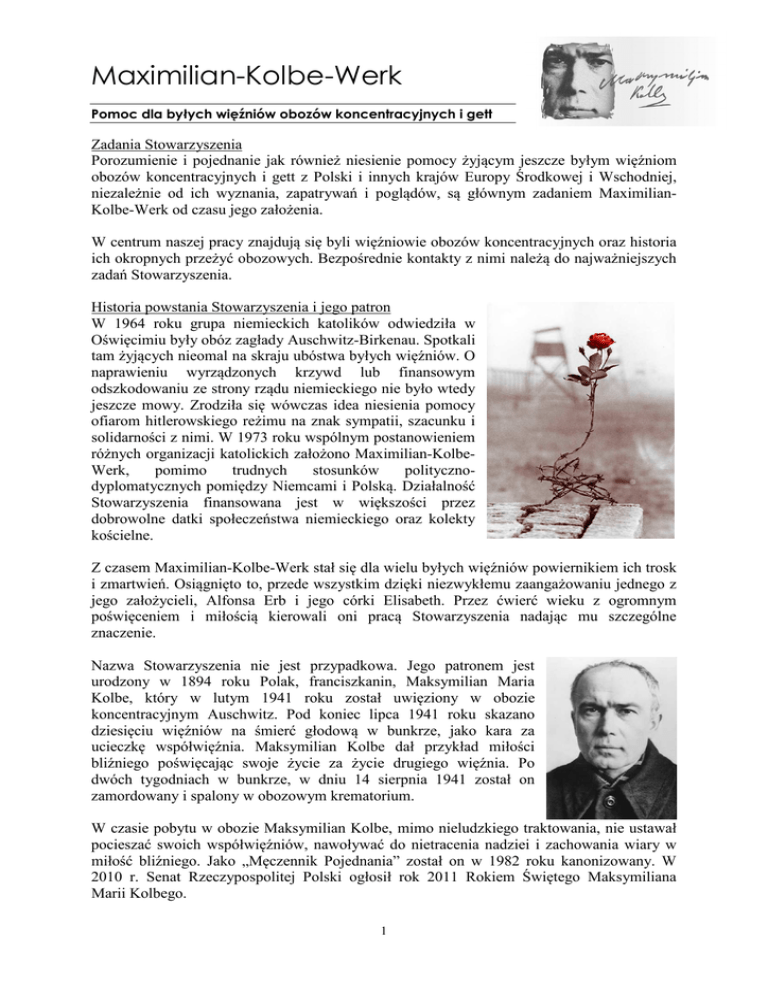 Maximilian-Kolbe-Werk Pomoc dla byłych więźniów obozów koncentracyjnych i gett Zadania Stowarzyszenia Porozumienie i pojednanie jak również niesienie pomocy żyjącym jeszcze byłym więźniom obozów koncentracyjnych i gett z Polski i innych krajów Europy Środkowej i Wschodniej, niezależnie od ich wyznania, zapatrywań i poglądów, są głównym zadaniem MaximilianKolbe-Werk od czasu jego założenia. W centrum naszej pracy znajdują się byli więźniowie obozów koncentracyjnych oraz historia ich okropnych przeżyć obozowych. Bezpośrednie kontakty z nimi należą do najważniejszych zadań Stowarzyszenia. Historia powstania Stowarzyszenia i jego patron W 1964 roku grupa niemieckich katolików odwiedziła w Oświęcimiu były obóz zagłady Auschwitz-Birkenau. Spotkali tam żyjących nieomal na skraju ubóstwa byłych więźniów. O naprawieniu wyrządzonych krzywd lub finansowym odszkodowaniu ze strony rządu niemieckiego nie było wtedy jeszcze mowy. Zrodziła się wówczas idea niesienia pomocy ofiarom hitlerowskiego reżimu na znak sympatii, szacunku i solidarności z nimi. W 1973 roku wspólnym postanowieniem różnych organizacji katolickich założono Maximilian-KolbeWerk, pomimo trudnych stosunków politycznodyplomatycznych pomiędzy Niemcami i Polską. Działalność Stowarzyszenia finansowana jest w większości przez dobrowolne datki społeczeństwa niemieckiego oraz kolekty kościelne. Z czasem Maximilian-Kolbe-Werk stał się dla wielu byłych więźniów powiernikiem ich trosk i zmartwień. Osiągnięto to, przede wszystkim dzięki niezwykłemu zaangażowaniu jednego z jego założycieli, Alfonsa Erb i jego córki Elisabeth. Przez ćwierć wieku z ogromnym poświęceniem i miłością kierowali oni pracą Stowarzyszenia nadając mu szczególne znaczenie. Nazwa Stowarzyszenia nie jest przypadkowa. Jego patronem jest urodzony w 1894 roku Polak, franciszkanin, Maksymilian Maria Kolbe, który w lutym 1941 roku został uwięziony w obozie koncentracyjnym Auschwitz. Pod koniec lipca 1941 roku skazano dziesięciu więźniów na śmierć głodową w bunkrze, jako kara za ucieczkę współwięźnia. Maksymilian Kolbe dał przykład miłości bliźniego poświęcając swoje życie za życie drugiego więźnia. Po dwóch tygodniach w bunkrze, w dniu 14 sierpnia 1941 został on zamordowany i spalony w obozowym krematorium. W czasie pobytu w obozie Maksymilian Kolbe, mimo nieludzkiego traktowania, nie ustawał pocieszać swoich współwięźniów, nawoływać do nietracenia nadziei i zachowania wiary w miłość bliźniego. Jako „Męczennik Pojednania” został on w 1982 roku kanonizowany. W 2010 r. Senat Rzeczypospolitej Polski ogłosił rok 2011 Rokiem Świętego Maksymiliana Marii Kolbego. 1 Pomoc w Polsce W Polsce żyje dzisiaj jeszcze około 10.000 byłych więźniów hitlerowskich obozów koncentracyjnych i gett. Stowarzyszenie Maximilian-Kolbe-Werk udziela im konkretnej pomocy: Indywidualna pomoc finansowa: udzielana jest na wniosek w granicach od 150 € do 600 € Dofinansowywanie fachowej opieki domowej wykonywanej przez pielęgniarki i inne wykwalifikowane osoby Centrum socjalno-medyczne w Łodzi udziela porad, zapewnia leczenie przez lekarzy specjalistów, wypożycza przedmioty zaopatrzenia medycznego i ponadto zaopatruje byłych więźniów posiłki na kółkach. W Krakowie dotowane jest Ambulatorium Medyczne Leczenie sanatoryjne i wczasy: rocznie finansowane jest około 300 miejsc sanatoryjnych i 150 miejsc na wczasy bożenarodzeniowe dla samotnych byłych więźniów Niemieccy honorowi współpracownicy Stowarzyszenia odwiedzają obłożnie chorych i niemogących opuszczać mieszkania byłych więźniów Siatka samopomocy: pomoc udzielana przez Stowarzyszenie koordynowana jest w każdym z byłych 49 województw przez honorowych współpracowników, tzw. „osoby zaufania”, które rekrutują się spośród byłych więźniów. „Osoby zaufania” koordynują pracę w danym regionie oraz pomagają swoim koleżankom i kolegom. Pomoc w krajach byłego Związku Radzieckiego Od 1992 roku Maximilian-Kolbe-Werk pomaga również byłym więźniom w krajach byłego Związku Radzieckiego. Do Rosji, na Ukrainę i Białoruś oraz do Krajów Nadbałtyckich zorganizowano 26 transportów z darami, podczas, których każdorazowo od 1.200 do 1.500 osób otrzymywało z darami rzeczowymi również pomoc finansową. Transportom towarzyszyli honorowi współpracownicy z Niemiec, którzy zajmowali się rozdziałem darów i wypłatą pomocy finansowej. Od 2002 roku w krajach wschodnio-europejskich w miejsce transportów z darami rzeczowymi organizowane są projekty pomocy i spotkań z byłymi więźniami obozów koncentracyjnych i gett. Podczas tych projektów pracownicy Maximilian-Kolbe-Werk spotykają się z byłymi więźniami obozów koncentracyjnych i gett na specjalnie zorganizowanych uroczystych zebraniach oraz odwiedzają chorych w domach. Wszyscy byli więźniowie mieszający w danym kraju lub regionie otrzymują pomoc finansową. Projekty pomocy i spotkań odbyły się już niejednokrotnie w Rosyjskiej Federacji, w tym również w Obwodzie Kaliningradzkim, w Estonii i Kazachstanie, na Ukrainie, Białorusi, Łotwie i Litwie. Leczenie sanatoryjne W roku 2007 odbyły się pierwsze dwa pobyty sanatoryjne dla byłych więźniów z krajów byłego Związku Radzieckiego. Oferta ta znacznie się od tej pory poszerzyła. Aktualnie regularnie organizowane są w wielu krajach pobyty sanatoryjne dla grup byłych więźniów w pobliżu ich miejsca zamieszkania. Pojednanie poprzez spotkania Od 1978 roku organizowane są dla byłych więźniów urlopy wypoczynkowe i spotkania w Niemczech. Od tego czasu rozesłano ponad 16.000 zaproszeń. W trakcie pobytu w Niemczech gośćmi opiekują się honorowi współpracownicy Stowarzyszenia MaximilianKolbe-Werk. Oprócz programu turystycznego przewidziane są spotkania zarówno z młodzieżą, jak i ze starszymi osobami. 2 Projekty ze świ