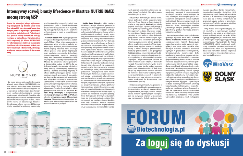 Kwartalnik Portalu nr 3/2014 Intensywny rozwój branży lifescience w Klastrze NUTRIBIOMED mocną stroną MŚP Branża life science jest jedną z najdynamiczniej rozwijających się dziedzin. Coraz więcej firm sektora MŚP stara się znaleźć swoją niszę na rynku, mimo iż często wiąże się to ze sporą inwestycją w badania i rozwój. Podmioty próbują pokonać bariery ekonomiczne, szukając rozwiązań w networkingu. Przynależność do takich organizacji jak Klaster NUTRIBIOMED nie tylko kreuje nowe możliwości finansowania działalności, ale także zapewnia bliskość partnerów naukowych i biznesowych, stymulując współpracę oraz przyczyniając się do rozwoju firmy. Za swoje główne cele, oprócz kreowania własnej marki, Klaster NUTRIBIOMED stawia transfer technologii oraz działalność B+R w sektorze life science, szczególnie zaś w dziedzinie biotechnologii. Jako konsorcjum naukowo-technologiczne promuje tę aktywność wśród swoich Członków jako siłę napędową innowacji. Wiele podmiotów sektora MŚP należących do klastra, intensywnie rozwija ten obszar swojej działalności, odnosząc sukcesy na rynku. Zbliżone na tyle by umożliwić współpracę, wystarczają- 50 co różne jednak by każdy mógł znaleźć swoje miejsce na rynku – Klaster Nutribiomed skupia firmy zaangażowane m.in. w genetykę, biologię molekularną, chemię oraz firmy wykorzystujące te nauki w swojej bieżącej działalności. Centrum Badań DNA wykorzystuje innowacyjne technologie Illuminowe na platformach MiSeq i HiSeq celem udoskonalenia diagnostyki wielu chorób o podłożu genetycznym, realizując jednocześnie różnorodne projekty naukowe. Firma w swojej ofercie posiada wiele paneli diagnostycznych opartych o nowatorską technologię sekwencjonowania następnej generacji (ang. Next Generation Sequencing - NGS) w połączeniu z analizą bioinformatyczną. Metoda ta umożliwia sekwencjonowanie z dokładnością wyższą niż 99,9% dla pojedynczej zasady, nieosiągalną dla żadnej innej metody laboratoryjnej, zapewniając szybszą i bardziej skuteczną diagnozę. W ofercie CBDNA znajdują się panele na całe spektrum chorób genetycznych pozwalając na diagnostykę predyspozycji rozwoju niemal wszystkich możliwych nowotworów. Jednoczesna analiza całych eksonów wielu genów, której firma jest pionierem w Polsce, stanowi milowy krok w rozwoju dzisiejszej diagnostyki. Ponadto firma świadczy usługi przygotowania bibliotek na systemie Access Array (Fluidigm) i przeprowadzenia reakcji emulsyjnego PCR (ddPCR), jak również sekwencjonowania DNA metodą Sangera. Diagnostyka wykorzystująca genetykę jest niewątpliwym przykładem zastosowania nauki w praktyce. Spółka Pure Biologics, także należąca do Klastra, stosuje natomiast genetykę w celu uzyskiwania wyjątkowych produktów białkowych. Firma ta świadczy profesjonalne usługi dla bioprzemysłu oraz sektora nauki w zakresie produkcji i analizy wysokiej jakości białek rekombinowanych na zamówienie oraz selekcji rekombinowanych przeciwciał monoklonalnych. Pure Biologics specjalizuje się w całościowym wykonaniu procesu tzw. od-genu-do-białka. Ponadto, oferuje szereg usług dla sektora life science m.in. opracowanie testów pomiarowych, badania oddziaływań białko-ligand, analizę stabilności białek, znakowanie białek, badania kinetyki enzymatycznej, identyfikację i analizę makrocząstek przy użyciu spektrometrii mas i wiele innych. Spółka prowadzi kilka własnych projektów badawczo-rozwojowych ukierunkowanych na opracowanie nowych testów diagnostycznych. Stosowane technologie selekcji rekombinowanych przeciwciał i otrzymywania białek rekombinowanych, stanowiące połączenie unikalnej wiedzy i umiejętności założycieli oraz pracowników firmy, zostały przetestowane na polskim rynku w kilkudziesięciu kontraktowych projektach naukowych. Opracowane przez Pure Biologics unikalne platformy technologiczne selekcji fragmentów przeciwciał i produkcji białek rekombinowanych dla celów rozwoju leków biologicznych są gotowe do wdrożenia na rynek globalny. Pure Biologics jest świetnym przykładem tego, że internacjonalizacja polskiej biotechnologii jest możliwa. „Klaster Nutribiomed daje możliwości szybkiej wymiany know-how i doświadczeń między członkami, a wypracowana sieć kontaktów branżo- Kwartalnik Portalu nr 3/2014 wych pozwala wszystkim sukcesywnie rozwijać biznes.” - mówi dr Filip Jeleń, prezes Pure Biologics sp. z o.o. Od genetyki do białek jest bardzo blisko. Temat białek jest z kolei atrakcyjny także dla innej firmy Klastra, wykorzystującej je trochę w inny sposób. Medacol jest młodą prężnie rozwijającą się firmą specjalizującą się w produkcji wysokiej jakości kosmetyków opartych na bazie aktywnego kolagenu morskiego. Wysoka zawartość hydroksyproliny w tym białku, a także doskonałe połączenie z kwasem hialuronowym, algami morskimi oraz skwalanem (naturalnym olejem pozyskiwanym z oliwek) poza idealnym nawilżeniem, opóźnia efekty starzenia się skóry, wypłyca zmarszczki, redukuje blizny, a także zmniejsza przebarwienia. Produkty przeznaczone są do pielęgnacji każdego rodzaju cery, zwłaszcza suchej. Seria z dodatkiem colostrum bogatego w immunoglobuliny, o właściwościach przeciwzapalnych i antystarzeniowych sprawia, że skóra w krótkim czasie odzyskuje doskonały wygląd. Pierwsza linia kosmetyków z serii collagen+ została bardzo dobrze przyjęta przez rynek. Obecnie działalność B+R firmy skupia się na problemie znanym od wielu lat na rynku - zachowania właściwej aktywności substancji stosowanych w przemyśle kosmetycznym przy jednoczesnym zachowaniu atrakcyjnej dla konsumenta ceny oraz łatwości aplikacji. Mnóstwo cennych białek „ma problem” z utrzymaniem stabilności, a dodatkowo wiele witamin jest wrażliwych na czynniki zewnętrzne takie jak wilgoć, światło, temperatura. Jednym z potencjalnych rozwiązań