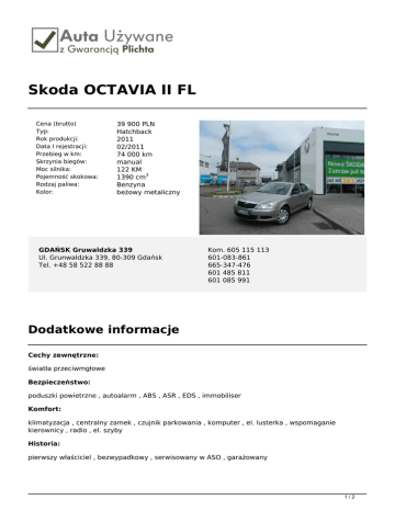 Skoda OCTAVIA II FL Cena (brutto) Typ: Rok produkcji: Data I rejestracji: Przebieg w km: Skrzynia biegów: Moc silnika: Pojemność skokowa: Rodzaj paliwa: Kolor: 39 900 PLN Hatchback 2011 02/2011 74 000 km manual 122 KM 1390 cm3 Benzyna beżowy metaliczny GDAŃSK Gruwaldzka 339 Ul. Grunwaldzka 339, 80-309 Gdańsk Tel. +48 58 522 88 88 Kom. 605 115 113 601-083-861 665-347-476 601 485 811 601 085 991 Dodatkowe informacje Cechy zewnętrzne: światła przeciwmgłowe Bezpieczeństwo: poduszki powietrzne , autoalarm , ABS , ASR , EDS , immobiliser Komfort: klimatyzacja , centralny zamek , czujnik parkowania , komputer , el. lusterka , wspomaganie kierownicy , radio , el. szyby Historia: pierwszy właściciel , bezwypadkowy , serwisowany w ASO , garażowany 1/2 Gwarancja Szanowni Państwo, Pragniemy Państwa poinformować, iż firma Plichta – Autoryzowany Dealer Škoda Auto prowadzi skup oraz sprzedaż samochodów używanych wszystkich marek, oferując także samochody używane z gwarancją objęte programem „Auta używane z Gwarancją Plichta”. W ramach programu „Auta Używane z Gwarancją Plichta ” każdy Klient otrzymuje atrakcyjny pakiet zniżek pozwalający zoptymalizować koszty eksploatacji samochodu: -50% na serwis klimatyzacji -50% na ustawienie zbieżności -50% na kosmetykę auta -50% na ścieżkę diagnostyczną -25% na wymiany oleju -25% na zakup opon + 5zł na sezon za hotelowanie opon -15% na części i akcesoria Oferujemy również kompleksową obsługę w zakresie finansowania i ubezpieczenia: - kredyty już od 4,99% - leasingi i kredyty bez zaświadczeń - uproszczone procedury – decyzja już od 30 min. - atrakcyjne pakiety AC/OC/NW/ASS wiodących firm ubezpieczeniowych Możliwość pozostawienia dotychczas użytkowanego auta w rozliczeniu – BEZPŁATNA WYCENA!!! Zapraszamy wszystkich Klientów na jazdę próbną wybranym autem. Numer oferty: c14 Informacja nie stanowi oferty w rozumieniu art. 66 KC. Podane dane mają charakter wyłącznie informacyjny. 2/2 Powered by TCPDF (www.tcpdf.org)
