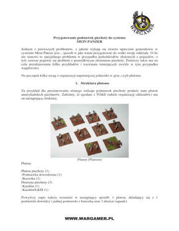 Przygotowanie podstawek piechoty do systemu MEIN PANZER Jednym z pierwszych problemów, z jakimi stykaj si wie o upieczeni generałowie w systemie Mein Panzer jest... sposób w jaki winni przygotowa do walki swoje oddziały. O ile nie stanowi to specjalnego problemu w przypadku pododdziałów zło onych z pojazdów, o tyle zawsze pojawia si problem z prawidłowym zło eniem piechoty. Poni szy tekst ma na celu przedstawienie kilku przykładów i rozwianie istniej cych zwykle w tym przypadku w tpliwo ci. Na pocz tek kilka uwag o organizacji najmniejszej jednostki w grze, czyli plutonu: 1. Struktura plutonu Za przykład dla prezentowania ró nego rodzaju podstawek piechoty posłu y nam pluton ameryka skich piechurów. Załó my, i zgodnie z TO&E (tabele organizacji oddziałów) ma on nast puj c struktur : Pluton: Pluton (Platoon) Pluton piechoty (1) -Podstawka dowodzenia (1) -Bazooka (1) Dru yna piechoty (3) -Karabin (1) -Karabin/LKM (1) Powy szy zapis nale y rozumie w nast puj cy sposób: 1 pluton, składaj cy si podstawki dowódcy i jednej podstawki z bazook oraz 3 dru yn (squads). z 1 Dru yna (squad) Ka da dru yna skała si z jednej podstawki Karabinów oraz jednej podstawki Karabin/LKM. W sumie nasz pluton b dzie liczył wi c 8 podstawek. 2. Co to jest podstawka (stand)? Podstawka reprezentuje najmniejszy mo liwy element w grze i odpowiada w rzeczywisto ci grupie 4-7 ołnierzy. W grze Mein Panzer jest on reprezentowany przez podstawk piechoty składaj c si z 3-4 figurek ołnierzy (tzw. stand bojowy) lub 1-2 figurek (stand pomocniczy lub standy wsparcia). Standami bojowymi s wszystkie podstawki reprezentuj ce sekcje broni strzeleckich jak karabiny, pistolety maszynowe, karabiny szturmowe. Standy pomocnicze reprezentuj głównie dowódców, obsług karabinów maszynowych, broni ppanc., ale tak e snajperów, obserwatorów etc. W Mein Panzer u ywamy podstawki o wymiarach 1/2”x1/2” cala. 3. Karabin/Karabinek/Pistolet Maszynowy Generaln zasad jest, i podstawki modeli wyposa onych w t sam bro strzeleck otrzymuj nazw od broni, w któr s uzbrojone. I tak podstawka uzbrojona w karabiny b dzie nazwana Karabin a podstawka uzbrojona w pistolety maszynowe – Pistolet Maszynowy (PM). Nale y pami ta , i bior c pod uwag skal modeli do gry rozró nienie posiadanej przez nie broni mo e by trudne. Dlatego te w tym zakresie obowi zuje pewna dowolno – wystarczy, aby gracz jasno okre lił, w co dana podstawka jest uzbrojona i oznaczył to w „rozpisce” swojej armii (przygotowany przed bitw arkusz ze skaldem, organizacja i kosztem punktowym wystawianych do bitwy jednostek) oraz podpisał na standzie (np. na spodzie podstawki). Oczywi cie mo na odpowiednio dobra modele, ale nie jest to konieczne. Najwa niejsze, aby nie było w tym zakresie w tpliwo ci w czasie gry. Podstawka Karabinów (ale równie dobrze karabinków lub PM) Prezentacja na podstawce: 3-4 modele na podstawce. 4. Karabin/LKM To podstawka bojowa na której siła ognia broni podstawowej (karabin, PM etc.) wzmocniona jest o sil ognia lekkiego karabinu maszynowego (LMK). Mo liwe kombinacj i statystyki znajduj si w tabeli piechoty ka dej nacji. Karabin/LKM Prezentacja na podstawce: na podstawce umieszczamy 2 modele zwykłe i 1 LKM (Karabin/LKM), b d zamieniamy jedna figurk z broni strzeleck na miotacz ognia lub panzerfaust. 5. Karabin/LKM, PM/Panzerfaust To kombinacje r cznych broni strzeleckich z broniami specjalnymi z tabeli piechoty lub broniami wsparcia z tabel uzbrojenia (głównie bronie ppanc – miotacze ognia, panzerfausty, koktajle mołotowa, ładunki wybuchowe, etc.). Aby móc doda dodatkow bro specjaln do podstawki bojowej bro ta musi si znajdowa w tabeli uzbrojenia w sekcji bronie piechoty. Wskutek dodania broni specjalnej do standardowej podstawki otrzymamy podstawk , która zawiera nazw broni standardowej oraz dodanej broni specjalnej (np.: Karabin/miotacz ognia czy Karabin/Panzerfaust). W celu dokonania takiej kombinacji nale y doda do kosztu podstawki bojowej koszt broni dodatkowej wyra ony w tabeli uzbrojenia. Bro wsparcia zazwyczaj słu y do osobnego wykorzystania bojowego – wyposa ona w bro specjaln podstawka prowadzi ogie z broni strzeleckiej lub specjalnej. Karabin/miotacz ognia Prezentacja na podstawce: na podstawce umieszczamy 2 modele zwykłe i jedna figurk z miotaczem ognia, panzerfustem lub inna broni . 6. Karabin/Saper, Karabin/Kawaleria Podobnie ja w przypadku broni specjalnych mo na tak e zmienia podstawki bojowe dodaj c im rozszerzenia. Rozszerzenia s wymieniane w tabeli piechoty np.: saperzy, kawaleria, zwiad, etc. Modyfikujemy statystyki podstawki o modyfikatory wynikaj ce z wybranego ulepszenia. Kawaleria Prezentacja na podstawce: kawaleria 2 modele kawalerii na podstawce. In ynierów ani zwiadu w aden specjalny sposób nie znaczymy za pomoc modeli. Fakt, e dana podstawka to in ynierowie lub zwiad oznaczamy w rozpisce i na spodzie podstawki. 7. Karabin/bazooka/zwiad lub Karabin/LKM/ Saper Dozwolone jest tak e doł czanie do jednej podstawki bojowej 1 broni specjalnej oraz jednoczesne dokonanie rozszerzenia. Nale y zmodyfikowa statystyki podstawki o modyfikatory wynikaj ce z dodanej broni i dokonanego ulepszenia. 8. LKM/KM/CKM Te bronie stanowi osobne podstawki wsparcia z własnymi statystykami. Radziecki CKM 9. LKM - lekki karabin maszynowy Prezentacja na podstawce: W przypadku zdecydowanej wi kszo ci broni umieszczamy po prostu jeden model na podstawce. Zazwyczaj w ród dost pnych modeli brak jest rozró nienia na modele KM i CKM – po prostu wybieramy, jaki karabin chcemy wystawi , płacimy odpowiednia liczb punktów i umieszczamy w rozpisce. LKM 10. Mortar - mo dzierz Podobnie brak jest rozró nienia na kaliber mo dzierzy – po prostu wybieramy ten który nam w danym momencie pasuje. Mo dzierz 11. Bro ppanc piechoty W przypadku sekcji broni ppanc. – umieszczamy 2 modele na podstawce jeden z broni ppanc a drugi jako asysta. Wystawiaj c podstawk z sam broni ppanc (np. bazooka czy panzerschreck) bierze