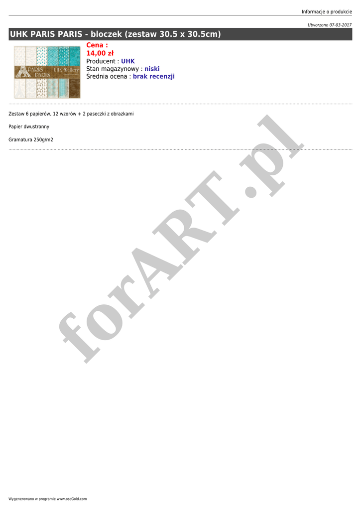 Informacje o produkcie Utworzono 07-03-2017 UHK PARIS PARIS - bloczek (zestaw 30.5 x 30.5cm) Cena : 14,00 zł Producent : UHK Stan magazynowy : niski Średnia ocena : brak recenzji Zestaw 6 papierów, 12 wzorów + 2 paseczki z obrazkami Papier dwustronny fo rA R T. pl Gramatura 250g/m2 Wygenerowano w programie www.oscGold.com