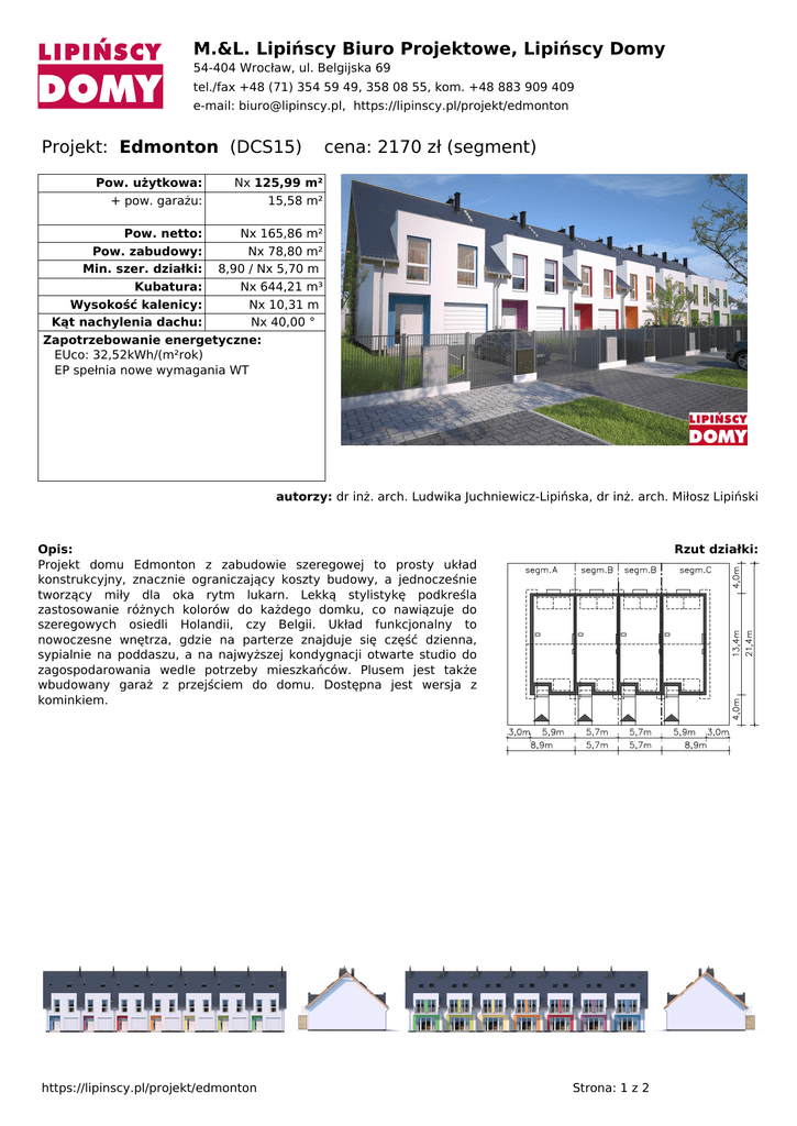 M.&L. Lipińscy Biuro Projektowe, Lipińscy Domy 54-404 Wrocław, ul. Belgijska 69 tel./fax +48 (71) 354 59 49, 358 08 55, kom. +48 883 909 409 e-mail: [email protected], https://lipinscy.pl/projekt/edmonton Projekt: Edmonton (DCS15) Pow. użytkowa: + pow. garażu: cena: 2170 zł (segment) Nx 125,99 m² 15,58 m² Pow. netto: Nx 165,86 m² Pow. zabudowy: Nx 78,80 m² Min. szer. działki: 8,90 / Nx 5,70 m Kubatura: Nx 644,21 m³ Wysokość kalenicy: Nx 10,31 m Kąt nachylenia dachu: Nx 40,00 ° Zapotrzebowanie energetyczne: EUco: 32,52kWh/(m²rok) EP spełnia nowe wymagania WT autorzy: dr inż. arch. Ludwika Juchniewicz-Lipińska, dr inż. arch. Miłosz Lipiński Opis: Projekt domu Edmonton z zabudowie szeregowej to prosty układ konstrukcyjny, znacznie ograniczający koszty budowy, a jednocześnie tworzący miły dla oka rytm lukarn. Lekką stylistykę podkreśla zastosowanie różnych kolorów do każdego domku, co nawiązuje do szeregowych osiedli Holandii, czy Belgii. Układ funkcjonalny to nowoczesne wnętrza, gdzie na parterze znajduje się część dzienna, sypialnie na poddaszu, a na najwyższej kondygnacji otwarte studio do zagospodarowania wedle potrzeby mieszkańców. Plusem jest także wbudowany garaż z przejściem do domu. Dostępna jest wersja z kominkiem. https://lipinscy.pl/projekt/edmonton Rzut działki: Strona: 1 z 2 Powered by TCPDF (www.tcpdf.org) Projekt: Edmonton (DCS15) Parter: 58,84 m² Powierzchnia łączna: 58,84 m² 1.1 1.2 1.3 1.4 1.5 1.6 Wiatrołap Komunikacja Pokój dzienny, kuchnia Łazienka, c.o. Schowek Garaż oraz: 1.7 Podest 1.8 Podest 4,08 m² 6,23 m² 27,93 m² 3,94 m² 1,08 m² 15,58 m² (1,08 m²) 3,12 m² 1,00 m² Poddasze: 60,93 m² Powierzchnia łączna: 60,93 m² 2.1 2.2 2.3 2.4 2.5 2.6 Komunikacja Pokój Pokój Łazienka Pokój Schody 8,60 m² 10,59 m² 13,56 m² 7,08 m² 17,55 m² 3,55 m² (10,59 m²) (13,56 m²) (17,55 m²) oraz: 2.7 Balkon 4,60 m² Studio: 21,80 m² Powierzchnia łączna: 21,80 m² 3.1 Pokój 3.2 Schody https://lipinscy.pl/projekt/edmonton 17,80 m² 4,00 m² Strona: 2 z 2 (17,80 m²)