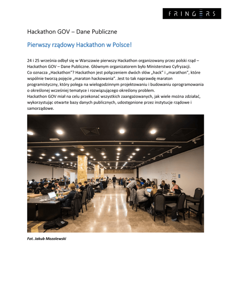 Hackathon GOV – Dane Publiczne Pierwszy rządowy Hackathon w Polsce! 24 i 25 września odbył się w Warszawie pierwszy Hackathon organizowany przez polski rząd – Hackathon GOV – Dane Publiczne. Głównym organizatorem było Ministerstwo Cyfryzacji. Co oznacza „Hackathon”? Hackathon jest połączeniem dwóch słów „hack” i „marathon”, które wspólnie tworzą pojęcie „maraton hackowania”. Jest to tak naprawdę maraton programistyczny, który polega na wielogodzinnym projektowaniu i budowaniu oprogramowania o określonej wcześniej tematyce i rozwiązującego określony problem. Hackathon GOV miał na celu przekonać wszystkich zaangażowanych, jak wiele można zdziałać, wykorzystując otwarte bazy danych publicznych, udostępnione przez instytucje rządowe i samorządowe. Fot. Jakub Mozolewski Jako zespół fringers reprezentujący Koło Naukowe Imagine Academy na Wydziale Matematyki i Informatyki Uniwersytetu Jagiellońskiego postanowiliśmy wziąć udział w Hackathonie, ponieważ byliśmy przekonani, że nasz pomysł rozwiąże „migrenowy problem” obywateli, będąc równocześnie pomocą w starciu z codziennymi obowiązkami. Nasza wspólna przygoda rozpoczęła się od wydarzeń, które wspólnie organizowaliśmy, później zaczęliśmy brać udział w różnych konkursach i hackathonach z własnymi projektami – i tak stworzyliśmy własny startup fringers. Na Hackathonie GOV, mającym miejsce w dniach 24-25 września w Warszawie, udało nam się zająć pierwsze miejsce z projektem eObywatel. Nasz projekt ma na celu usprawnić cały proces załatwienia spraw w urzędach, a aplikacja mobilna poprowadzić obywatela „za rękę” tak, aby przypadkiem o niczym nie zapominając, zakończył z sukcesem swoje sprawy w możliwie jak najkrótszym czasie. Dzięki wykorzystaniu danych publicznych uzyskaliśmy dostęp do wszystkich informacji na temat spraw w urzędach, do aktualnych w nich kolejek, mogliśmy wyświetlić listę najbliższych użytkownikowi kompetentnych urzędów i w efekcie zaprowadzić obywatela prosto do celu (a nawet zamówić mu ubera!). Dodaliśmy również możliwość rezerwacji miejsca w okienku w odpowiednim urzędzie. Ostatnie wolne chwile poświęciliśmy przygotowując również prototyp aplikacji na smartwatch Pebble, która wyświetlała użytkownikowi aktualną pozycję w kolejce. Plan wydawał się zbyt ambitny i bardzo ciężki do zrealizowania w tak ograniczonym czasie. Na szczęście, dzięki naszym wspólnym doświadczeniom, zgraniu i silnej pracy zespołowej wiedzieliśmy na co nas stać, a wraz z upływem czasu byliśmy coraz bardziej pewni, że uda nam się przygotować prototyp naprawdę nie najgorszej jakości. Udało nam się także zachwycić naszym projektem eObywatel Panią Minister Cyfryzacji Annę Strzeżyńską. Pani Minister od razu miała doskonałe wyobrażenie na temat połączenia naszej aplikacji z aktualnymi projektami Ministerstwa Cyfryzacji. Nagroda za zdobycie pierwszego miejsca to 18 000 zł oraz płatny staż w Centralnym Ośrodku Informatyki przy Ministerstwie Cyfryzacji. Wszyscy mieliśmy swoje aktualne obowiązki i niektórzy również stałą prace: „Płatny staż w urzędzie... to nie będzie raczej nic ciekawego ani atrakcyjnego.” - dokładnie tak myśleliśmy na początku. A teraz, już za miesiąc rozpoczniemy nową pracę dla polskiego rządu, a dokładniej dla polskich obywateli. We współpracy z Centralnym Ośrodkiem Informatyki i Ministerstwem Cyfryzacji będziemy realizować nasz projekt eObywatel, dzięki któremu stworzymy prawdziwą wartość dla obywateli i urzędów w Polsce! Śledźcie postępy naszego projektu eObywatel i pamiętajcie o nas. Do usłyszenia! – fringers Fabian Kapuscik Robert Kuna Aleksander Surman Jakub Król autor zdjęć – Jakub Mozolewski