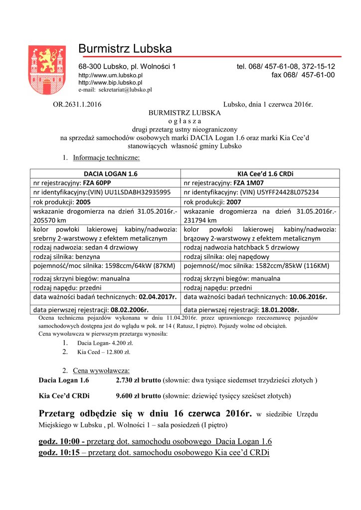 Burmistrz Lubska 68-300 Lubsko, pl. Wolności 1 tel. 068/ 457-61-08, 372-15-12 fax 068/ 457-61-00 http://www.um.lubsko.pl http://www.bip.lubsko.pl e-mail: [email protected] OR.2631.1.2016 Lubsko, dnia 1 czerwca 2016r. BURMISTRZ LUBSKA ogłasza drugi przetarg ustny nieograniczony na sprzedaż samochodów osobowych marki DACIA Logan 1.6 oraz marki Kia Cee’d stanowiących własność gminy Lubsko 1. Informacje techniczne: DACIA LOGAN 1.6 nr rejestracyjny: FZA 60PP nr identyfikacyjny:(VIN) UU1LSDABH32935995 rok produkcji: 2005 wskazanie drogomierza na dzień 31.05.2016r.205570 km kolor powłoki lakierowej kabiny/nadwozia: srebrny 2-warstwowy z efektem metalicznym rodzaj nadwozia: sedan 4 drzwiowy rodzaj silnika: benzyna pojemność/moc silnika: 1598ccm/64kW (87KM) KIA Cee’d 1.6 CRDi nr rejestracyjny: FZA 1M07 nr identyfikacyjny: (VIN) U5YFF24428L075234 rok produkcji: 2007 wskazanie drogomierza na dzień 31.05.2016r.231794 km kolor powłoki lakierowej kabiny/nadwozia: brązowy 2-warstwowy z efektem metalicznym rodzaj nadwozia hatchback 5 drzwiowy rodzaj silnika: olej napędowy pojemność/moc silnika: 1582ccm/85kW (116KM) rodzaj skrzyni biegów: manualna rodzaj skrzyni biegów: manualna rodzaj napędu: przedni rodzaj napędu: przedni data ważności badań technicznych: 02.04.2017r. data ważności badań technicznych: 10.06.2016r. data pierwszej rejestracji: 08.02.2006r. data pierwszej rejestracji: 18.01.2008r. Ocena techniczna pojazdów wykonana w dniu 11.04.2016r. przez uprawnionego rzeczoznawcę pojazdów samochodowych dostępna jest do wglądu w pok. nr 14 ( Ratusz, I piętro). Pojazdy wolne od obciążeń. Cena wywoławcza w pierwszym przetargu wynosiła: 1. 2. Dacia Logan- 4.200 zł. Kia Ceed – 12.800 zł. 2. Cena wywoławcza: Dacia Logan 1.6 2.730 zł brutto (słownie: dwa tysiące siedemset trzydzieści złotych ) Kia Cee’d CRDi 9.600 zł brutto (słownie: dziewięć tysięcy sześćset złotych) Przetarg odbędzie się w dniu 16 czerwca 2016r. w siedzibie Urzędu Miejskiego w Lubsku , pl. Wolności 1 – sala posiedzeń (I piętro) godz. 10:00 - przetarg dot. samochodu osobowego Dacia Logan 1.6 godz. 10:15 – przetarg dot. samochodu osobowego Kia cee’d CRDi Warunkiem wzięcia udziału w przetargach jest wpłacenie wadium w terminie do 10 czerwca 2016 roku w wysokości 10% tj. 273,00 zł – dla samochodu osobowego Dacia Logan 1.6 960,00 zł – dla samochodu osobowego marki Kia cee’d CRDi w pieniądzu w kasie Urzędu Miejskiego w Lubsku przy ul. Powstańców Wielkopolskich 3 w godzinach od 8.00 do 13.00, lub na rachunek bankowy Gminy Lubsko nr 55 1020 5402 0000 0202 0267 7821 z podaniem nazwy ruchomości w tytule wpłaty „wadium Dacia” lub „wadium Kia”. Wadium wniesione przez wyłonionego w wyniku przetargu nabywcę zalicza się na poczet ceny nabycia ruchomości. Pozostałym osobom wadium zwraca się w godzinach otwarcia kasy lub przelewem na wskazany przez nich rachunek bankowy, niezwłocznie po zakończeniu lub odwołaniu przetargu , jednak nie później niż przed upływem 7 dni licząc od dnia następnego po zakończeniu lub odwołaniu przetargu. Termin zawarcia umowy kupna - sprzedaży zostanie ustalony w terminie nie krótszym niż 5 dni po rozstrzygniętym przetargu. Osoby uczestniczące w przetargu zobowiązane są przedłożyć komisji przetargowej dowód wpłaty wadium i dowód tożsamości. Osoby reprezentujące w przetargu podmioty gospodarcze dodatkowo dokumenty niezbędne do ich reprezentowania tj. aktualny (ważny 3 m-ce) wypis z rejestru sądowego lub ewidencji działalności gospodarczej, umowę spółki, zgodę właściwych organów statutowych na nabycie ruchomości objętej przetargiem. Uczestnicy biorący udział w przetargu osobiście lub przez pełnomocnika (pełnomocnictwo wymagane w formie pisemnej). Nabywca przejmuje ruchomość w istniejącym stanie faktycznym i prawnym. Samochód będzie udostępniony zainteresowanym do wglądu od poniedziałku do piątku w godz. 8:00 do 13:00 w Lubsku przy pl. Wolności 1– po wcześniejszym umówieniu terminu pod nr tel. 68 4576114. Ogłaszający zastrzega sobie prawo odwołania przetargu z ważnych przyczyn. Wydanie przedmiotu zbycia nastąpi niezwłocznie po zapłaceniu ceny i podpisaniu umowy sprzedaży. Jeżeli uczestnik który wygrał przetarg uchyla się od zawarcia umowy, bez uzasadnionej przyczyny we wskazanym przez sprzedającego terminie, sprzedający może od zawarcia umowy odstąpić i zatrzymać wniesione przez tego uczestnika wadium. Z Regulaminem przeprowadzania przetargów ustnych i pisemnych dotyczących sprzedaży ruchomości będących własnością gminy powołanym Zarządzeniem nr 11/w/2013 Burmistrza Lubska z dnia 12 kwietnia 2013r., zmienionego Zarządzeniem nr 32/w/2016 Burmistrza Lubska z dnia 25 kwietnia 2016r. można zapoznać się w siedzibie sprzedającego tj. Urząd Miejski w Lubsku, jak również Biuletynie Informacji Publicznej Urzędu Miejskiego w Lubsku jako załącznik do przedmiotowego ogłoszenia o przetargu. Burmistrz Lubska Lech Jurkowski .