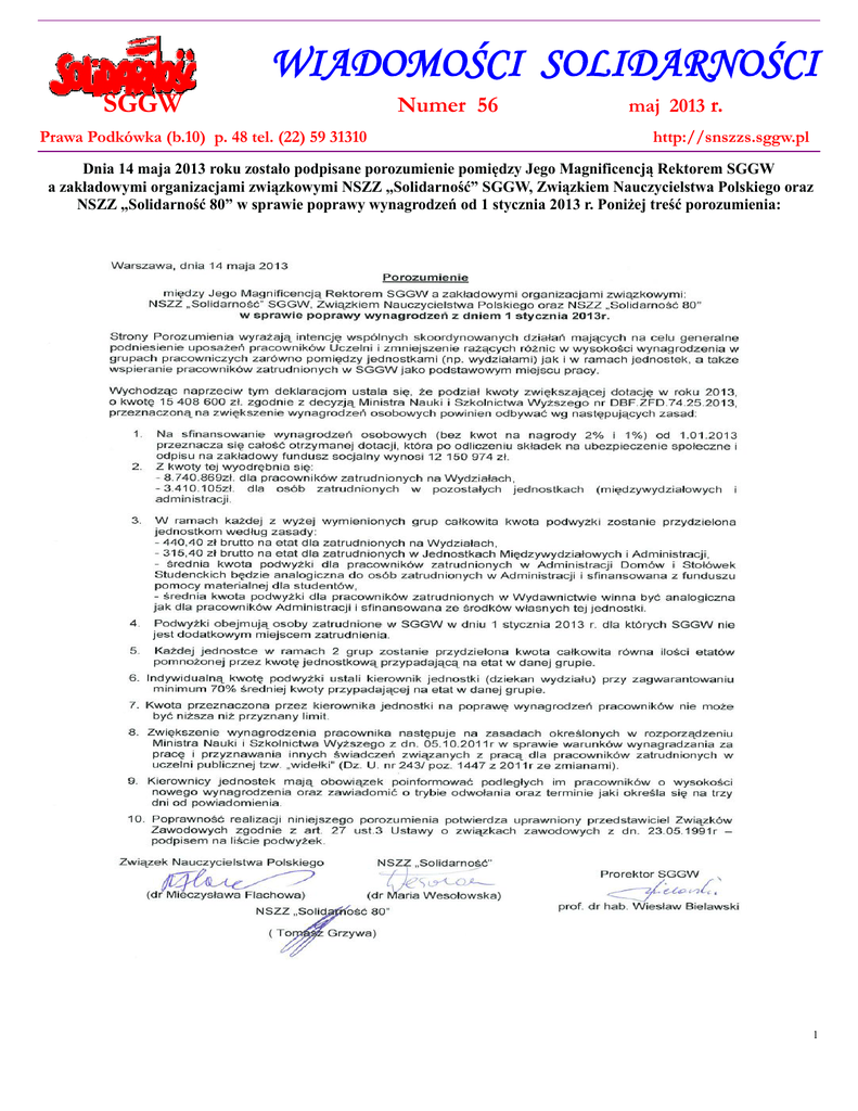 WIADOMOŚCI SOLIDARNOŚCI SGGW Prawa Podkówka (b.10) p. 48 tel. (22) 59 31310 Numer 56 maj 2013 r. http://snszzs.sggw.pl Dnia 14 maja 2013 roku zostało podpisane porozumienie pomiędzy Jego Magnificencją Rektorem SGGW a zakładowymi organizacjami związkowymi NSZZ „Solidarność” SGGW, Związkiem Nauczycielstwa Polskiego oraz NSZZ „Solidarność 80” w sprawie poprawy wynagrodzeń od 1 stycznia 2013 r. Poniżej treść porozumienia: 1 Informacje z zebrań Prezydium KZ NSZZ „Solidarność” SGGW w dniu 9.04. 2013 1. Okresowa ocena nauczycieli akademickich SGGW w Warszawie. Przewodnicząca zapoznała zebranych z treścią pisma, jakie otrzymaliśmy z Ministerstwa Nauki i Szkolnictwa Wyższego. Pismo jest odpowiedzią na nasze pytania dotyczące okresowej oceny pracowników naukowo-dydaktycznych w SGGW, a mianowicie pominięcia roku 2008 w ocenie i nie uwzględnienie w ankiecie oceny opieki weterynaryjnej świadczonej przez lekarzy weterynarii. Z odpowiedzi wynika, że rok 2008 nie może być pominięty w ocenie. Ocena musi mieć charakter ciągły obejmujący całokształt osiągnieć pracowników. Ministerstwo powołując się na art.132 ust.4 Ustawy wymienia enumeratywnie okresy, których nie wlicza się do okresu pracy podlegającego ocenie. Są to urlop macierzyński, urlop wychowawczy, urlop dla poratowania zdrowia oraz okresy służby wojskowej lub służby zastępczej. W kwestii opieki weterynaryjnej Ministerstwo stwierdza, że wskazanej ocenie nie powinno podlegać uczestniczenie w realizacji działalności weterynaryjnej. Działalność ta jest prowadzona na podstawie art.112 Ustawy, a uczestniczenie w niej powinno być realizowane na podstawie odrębnej umowy. Członkowie Prezydium uznali, że ze stanowiskiem Ministerstwa należy zapoznać nauczycieli akademickich. W związku z tym do Przewodniczących Kół NSZZ "Solidarność" SGGW w poszczególnych jednostkach zostanie skierowane pismo z prośbą o poinformowanie wszystkich nauczycieli akademickich, którzy z powodu pominięcia roku 2008 w ocenie tracą punkty, aby dołączyli do ankiety dokumentację potwierdzającą przysługujące im punkty. W przypadku nie uwzględnienia ich przez Wydziałową Komisję ds. Oceny należy skierować odwołanie do Uczelnianej Komisji ds. Oceny. Negatywne rozstrzygniecie przez Komisję Uczelnianą otwiera możliwość wystąpienia do Sądu Pracy. Komisja Zakładowa NSZZ "Solidarność" SGGW udziela konkretnej pomocy w przygotowaniu pozwu i prowadzeniu rozprawy. Na wniosek Sekretarza KZ „S” Joanny Wyleżałek w piśmie skierowanym do Przewodniczących Kół zawarte jest przypomnienie, że zgodnie z §145 pkt.2 Statutu SGGW w pracach Komisji ds. Oceny na życzenie pracownika uczestniczy przedstawiciel związku zawodowego. W związku z tym, że obowiązujący aktualnie Regulamin oceny pracowników i ankieta budzą wiele wątpliwości i zastrzeżeń, Tomasz Kondraszuk zaproponował, aby opracować wszystkie krytyczne uwagi i wnioski oraz skierować je do Władz Uczelni, tak aby ankieta oceny prowadzonej za dwa lata była poprawiona. Ustalono, że uwagi i wnioski do obecnie prowadzonej oceny przygotuje Jacek Bujko i Tomasz Kondraszuk. 2. Na dzień 16 kwietnia br. zaplanowano spotkanie z prof. dr hab. Wiesławem Bielawskim - Prorektorem ds. Rozwoju SGGW i przedstawicieli NSZZ "Solidarność" SGGW. 3. Zakładowy Fundusz Świadczeń Socjalnych SGGW. Pani Przewodnicząca poinformowała zebranych o odpowiedzi, jaką otrzymaliśmy od Pani dr hab. Aliny Daniłowskiej - Przewodniczącej Rektorskiej Komisji ds. Socjalnych na skierowane do Niej pismo w sprawie sprawozdania z wykorzystania ZFŚS w roku 2012 przedstawionego na posiedzeniu Senatu w dniu 25 marca br. Z odpowiedzi dowiadujemy się, że Pani Przewodnicząca Komisji nie ma żadnych formalnych uprawnień do uzyskiwania od Kwestury informacji o stanie konta ZFŚS. Proponuje, aby o taką informację Komisja Zakładowa NSZZ "Solidarność" zwracała się bezpośrednio do Kwestury. Z pewnością wystąpimy o taką informację. Nasze zdziwienie budzi jednak fakt, że Pani Przewodnicząca i członkowie Komisji ds. Socjalnych nie mają informacji o stanie konta ZFŚS. Ponadto, w takiej sytuacji, wydaje się, że sprawozdanie o ZFŚS powinna uzupełniać Kwestura. W swojej odpowiedzi Pani Przewodnicząca Komisji ds. Socjalnych wyjaśnia również, że umieszczenie w sprawozdaniu informacji o liczbie osób towarzyszących uczestnikom wypoczynku w Kirach miało charakter dodatkowy i jako informacja zbędna nie będzie umieszczana w przyszłości w sprawozdaniach. 4. Komisja ds. Przeciwdziałania Dyskryminacji i Mobbingowi w SGGW. Sekretarz KZ „S” Joanna Wyleżałek poinformowała o ostatnim spotkaniu z JM Rektorem, na którym dyskutowany był Regulamin działania Komisji. Niestety nie udało się wprowadzić do składu Komisji przedstawiciela pracowników obsługi i robotników, a w tej grupie bardzo często dochodzi do działań dyskryminujących pracowników. Nadal podtrzymujemy wniosek o uzupełnienie składu Komisji o przedstawiciela pracowników tej grupy. Joanna Wyleżałek stwierdziła, że zapis o prowadzeniu akcji informacyjnej nie gwarantuje systematycznego szkolenia kadry kierowniczej w zakresie mobbingu. Postuluje włączenie szkoleń w zakresie przeciwdziałania mobbingowi do okresowych szkoleń prowadzonych przez Inspektorat BiHP. Zwróciła również uwagę na korzystną zmianę w § 8 pkt.12 dotyczącą uznania przez Komisję zgłoszenia za zasadne. Zatem, każda sprawa zgłoszona do rzecznika ds. mobbingu będzie rozpatrzona. Jeśli rzecznik nie rozwiąże problemu, sprawę skieruje do rozpatrzenia przez Komisję. 5. Sprawa nieprawidłowości w ochronie budynków na Rakowieckiej. Przewodnicząca przypomniała kilka rozmów oraz pismo, jakie skierowane zostało do kierownika Obiektów przy ul. Rakowieckiej w sprawie korekty grafiku dyżurów świątecznych. W piśmie prosiliśmy również o właściwe traktowanie pracownik