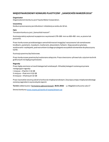 MIĘDZYNARODOWY KONKURS PLASTYCZNY „SAMOCHÓD MARZEŃ 2016” Organizator Organizatorem konkursu jest Toyota Motor Corporation. Uczestnicy Konkurs przeznaczony jest dla dzieci i młodzieży w wieku do 16 lat. Opis Tematem konkursu jest „Samochód marzeń”. Ilustrację należy wykonać na papierze o wymiarach 270–300 mm na 420–450 mm, w pionie lub poziomie. Prace konkursowe przedstawiające samochód marzeń mogą być narysowane lub namalowane kredkami, pastelami, mazakami, markerami, akwarelami, farbami. Dopuszczalne są kolaże, wydzieranki i wyklejanki, pod warunkiem ścisłego przylegania wszystkich elementów do płaszczyzny kartki. Ilustracje powinny być kolorowe. Prace konkursowe powinny być wykonane odręcznie. Prace stworzone cyfrowo lub z użyciem technik graficznych nie będą przyjmowane. Nagrody Prace będą oceniane w trzech kategoriach wiekowych. W każdej kategorii zostaną przyznane następujące nagrody: I miejsce – iPad Air 2 16 GB II miejsce – iPad mini 4 16 GB III miejsce – iPod touch 32 GB Prace laureatów wezmą udział w konkursie międzynarodowym. Zwycięzcy etapu międzynarodowego zostaną nagrodzeni wycieczką do Japonii. Termin oddania prac i formularzy zgłoszeniowych 28.01.2016r - p. Magdalena Kuczma sala 17 Strona konkursu www.toyota.pl/world-of-toyota/dream-car