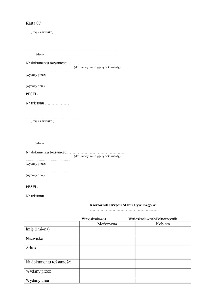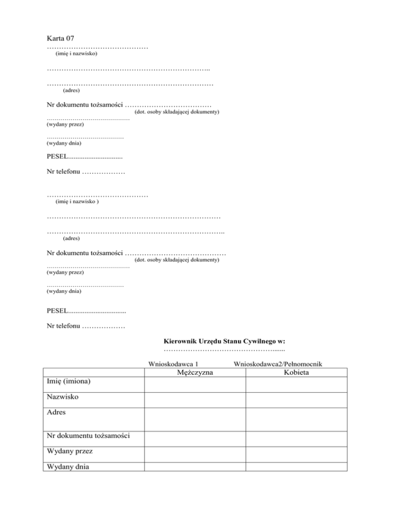 Karta 07 Mężczyzna Kobieta Imię (imiona) Nazwisko Adres Nr