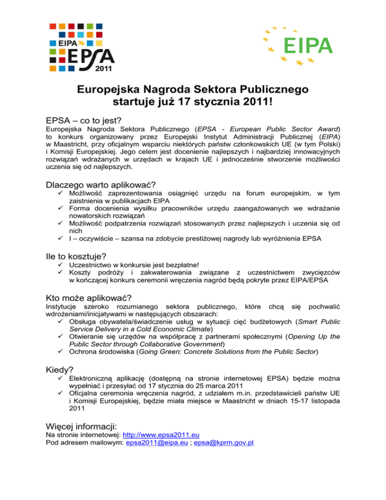 Europejska Nagroda Sektora Publicznego startuje juŜ 17 stycznia 2011! EPSA – co to jest? Europejska Nagroda Sektora Publicznego (EPSA - European Public Sector Award) to konkurs organizowany przez Europejski Instytut Administracji Publicznej (EIPA) w Maastricht, przy oficjalnym wsparciu niektórych państw członkowskich UE (w tym Polski) i Komisji Europejskiej. Jego celem jest docenienie najlepszych i najbardziej innowacyjnych rozwiązań wdraŜanych w urzędach w krajach UE i jednocześnie stworzenie moŜliwości uczenia się od najlepszych. Dlaczego warto aplikować? MoŜliwość zaprezentowania osiągnięć urzędu na forum europejskim, w tym zaistnienia w publikacjach EIPA Forma docenienia wysiłku pracowników urzędu zaangaŜowanych we wdraŜanie nowatorskich rozwiązań MoŜliwość podpatrzenia rozwiązań stosowanych przez najlepszych i uczenia się od nich I – oczywiście – szansa na zdobycie prestiŜowej nagrody lub wyróŜnienia EPSA Ile to kosztuje? Uczestnictwo w konkursie jest bezpłatne! Koszty podróŜy i zakwaterowania związane z uczestnictwem zwycięzców w kończącej konkurs ceremonii wręczenia nagród będą pokryte przez EIPA/EPSA Kto moŜe aplikować? Instytucje szeroko rozumianego sektora publicznego, które chcą się pochwalić wdroŜeniami/inicjatywami w następujących obszarach: Obsługa obywatela/świadczenie usług w sytuacji cięć budŜetowych (Smart Public Service Delivery in a Cold Economic Climate) Otwieranie się urzędów na współpracę z partnerami społecznymi (Opening Up the Public Sector through Collaborative Government) Ochrona środowiska (Going Green: Concrete Solutions from the Public Sector) Kiedy? Elektroniczną aplikację (dostępną na stronie internetowej EPSA) będzie moŜna wypełniać i przesyłać od 17 stycznia do 25 marca 2011 Oficjalna ceremonia wręczenia nagród, z udziałem m.in. przedstawicieli państw UE i Komisji Europejskiej, będzie miała miejsce w Maastricht w dniach 15-17 listopada 2011 Więcej informacji: Na stronie internetowej: http://www.epsa2011.eu Pod adresem mailowym: [email protected] ; [email protected]