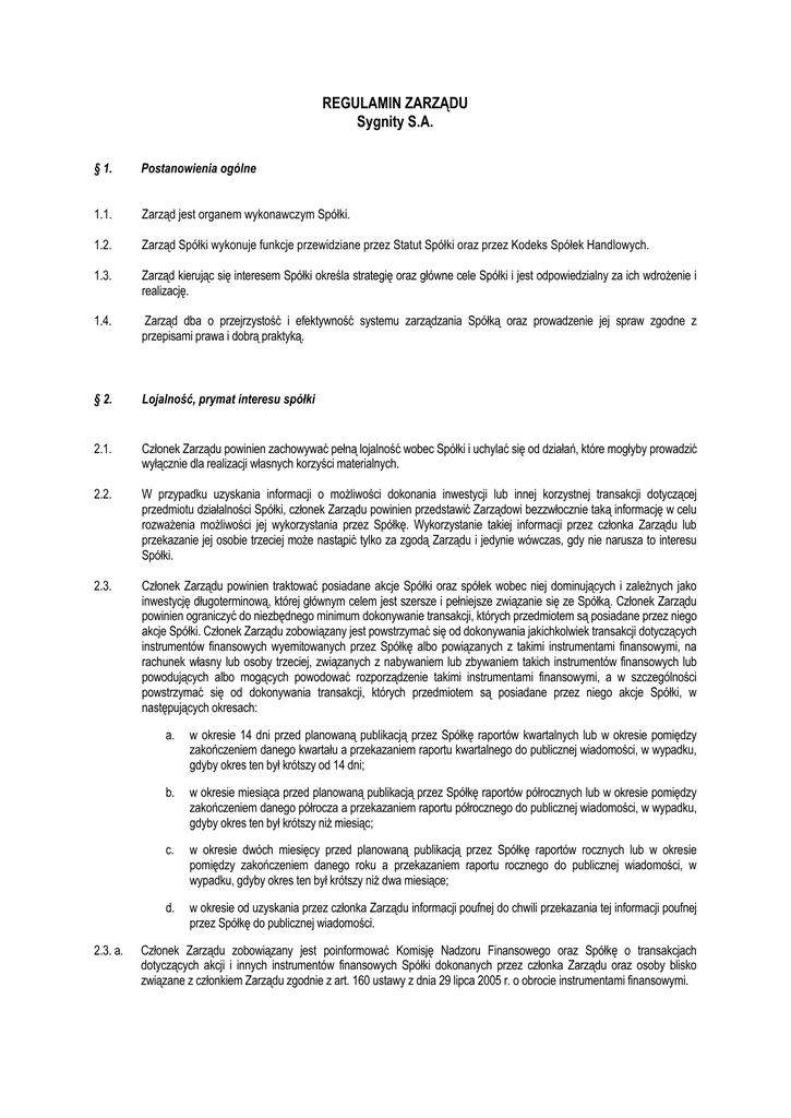 REGULAMIN ZARZĄDU Sygnity S.A. § 1. Postanowienia ogólne 1.1. Zarząd jest organem wykonawczym Spółki. 1.2. Zarząd Spółki wykonuje funkcje przewidziane przez Statut Spółki oraz przez Kodeks Spółek Handlowych. 1.3. Zarząd kierując się interesem Spółki określa strategię oraz główne cele Spółki i jest odpowiedzialny za ich wdrożenie i realizację. 1.4. Zarząd dba o przejrzystość i efektywność systemu zarządzania Spółką oraz prowadzenie jej spraw zgodne z przepisami prawa i dobrą praktyką. § 2. Lojalność, prymat interesu spółki 2.1. Członek Zarządu powinien zachowywać pełną lojalność wobec Spółki i uchylać się od działań, które mogłyby prowadzić wyłącznie dla realizacji własnych korzyści materialnych. 2.2. W przypadku uzyskania informacji o możliwości dokonania inwestycji lub innej korzystnej transakcji dotyczącej przedmiotu działalności Spółki, członek Zarządu powinien przedstawić Zarządowi bezzwłocznie taką informację w celu rozważenia możliwości jej wykorzystania przez Spółkę. Wykorzystanie takiej informacji przez członka Zarządu lub przekazanie jej osobie trzeciej może nastąpić tylko za zgodą Zarządu i jedynie wówczas, gdy nie narusza to interesu Spółki. 2.3. Członek Zarządu powinien traktować posiadane akcje Spółki oraz spółek wobec niej dominujących i zależnych jako inwestycję długoterminową, której głównym celem jest szersze i pełniejsze związanie się ze Spółką. Członek Zarządu powinien ograniczyć do niezbędnego minimum dokonywanie transakcji, których przedmiotem są posiadane przez niego akcje Spółki. Członek Zarządu zobowiązany jest powstrzymać się od dokonywania jakichkolwiek transakcji dotyczących instrumentów finansowych wyemitowanych przez Spółkę albo powiązanych z takimi instrumentami finansowymi, na rachunek własny lub osoby trzeciej, związanych z nabywaniem lub zbywaniem takich instrumentów finansowych lub powodujących albo mogących powodować rozporządzenie takimi instrumentami finansowymi, a w szczególności powstrzymać się od dokonywania transakcji, których przedmiotem są posiadane przez niego akcje Spółki, w następujących okresach: 2.3. a. a. w okresie 14 dni przed planowaną publikacją przez Spółkę raportów kwartalnych lub w okresie pomiędzy zakończeniem danego kwartału a przekazaniem raportu kwartalnego do publicznej wiadomości, w wypadku, gdyby okres ten był krótszy od 14 dni; b. w okresie miesiąca przed planowaną publikacją przez Spółkę raportów półrocznych lub w okresie pomiędzy zakończeniem danego półrocza a przekazaniem raportu półrocznego do publicznej wiadomości, w wypadku, gdyby okres ten był krótszy niż miesiąc; c. w okresie dwóch miesięcy przed planowaną publikacją przez Spółkę raportów rocznych lub w okresie pomiędzy zakończeniem danego roku a przekazaniem raportu rocznego do publicznej wiadomości, w wypadku, gdyby okres ten był krótszy niż dwa miesiące; d. w okresie od uzyskania przez członka Zarządu informacji poufnej do chwili przekazania tej informacji poufnej przez Spółkę do publicznej wiadomości. Członek Zarządu zobowiązany jest poinformować Komisję Nadzoru Finansowego oraz Spółkę o transakcjach dotyczących akcji i innych instrumentów finansowych Spółki dokonanych przez członka Zarządu oraz osoby blisko związane z członkiem Zarządu zgodnie z art. 160 ustawy z dnia 29 lipca 2005 r. o obrocie instrumentami finansowymi. 2.4. Przy dokonywaniu transakcji z akcjonariuszami oraz innymi osobami, których interesy wpływają na interes Spółki, Zarząd powinien działać ze szczególną starannością, aby transakcje były dokonywane na warunkach rynkowych. 2.5. Członkowie Zarządu są zobowiązani poinformować Radę Nadzorczą, o każdym konflikcie interesów w związku z pełnioną funkcją lub o możliwości jego powstania. § 3. Skład, powoływanie i kadencja Zarządu Spółki 3.1. Zarząd Spółki składa się z nie więcej niż dziewięciu członków, w tym Prezesa Zarządu Spółki. 3.2. Kadencja Zarządu trwa trzy lata. Członkowie Zarządu mogą być ponownie powołani na następną kadencję. 3.3. Mandaty członków Zarządu wygasają z dniem odbycia Walnego Zgromadzenia zatwierdzającego sprawozdanie, bilans, rachunek zysków i strat za ostatni rok urzędowania. 3.4. Prezesa Zarządu Spółki powołuje Rada Nadzorcza z własnej inicjatywy. Pozostałych członków Zarządu powołuje Rada Nadzorcza na wniosek Prezesa Zarządu Spółki. 3.5. Zarząd lub członkowie Zarządu mogą być w każdej chwili zawieszeni w czynnościach lub odwołani przez Radę Nadzorczą przed upływem kadencji. 3.6. Odwołanie lub zawieszenie członków Zarządu lub całego Zarządu wymaga uchwały Rady Nadzorczej podjętej większością 2/3 głosów członków Rady Nadzorczej obecnych na posiedzeniu, w obecności co najmniej połowy liczby członków Rady Nadzorczej. 3.7. Odwołanie lub zawieszenie w czynnościach członka Zarządu Spółki przez Walne Zgromadzenie może nastąpić wyłącznie z ważnych powodów, w szczególności: a) b) c) popełnienia przestępstwa, nadużycia zaufania akcjonariuszy, utraty zdolności do wykonywania funkcji. 3.8. Uchwała Walnego Zgromadzenia w sprawie odwołania lub zawieszenia w czynnościach członka Zarządu Spółki wymaga 2/3 oddanych głosów. § 4. Funkcje Zarządu Spółki 4.1. Zarząd Spółki prowadzi sprawy Spółki i reprezentuje Spółkę. 4.2. Do zakresu działania Zarządu Spółki należą wszystkie sprawy Spółki nie zastrzeżone do kompetencji Walnego Zgromadzenia lub Rady Nadzorczej. 4.3. Zarząd Spółki jest w szczególności zobowiązany do: a) zgłoszenia Spółki do sądu rejestrowego oraz zgłaszanie do sądu rejestrowego wszelkich danych wymaganych ujawnienia w aktach rejestrowych, b) prowadzenia księgi protokołów Walnego Zgromadzenia i sporządzania odpisów uchwał, c) sporządzenia i złożen