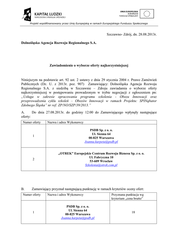 Projekt współfinansowany przez Unię Europejską w ramach Europejskiego Funduszu Społecznego Szczawno- Zdrój, dn. 28.08.2013r. Dolnośląska Agencja Rozwoju Regionalnego S.A. Zawiadomienie o wyborze oferty najkorzystniejszej Niniejszym na podstawie art. 92 ust. 2 ustawy z dnia 29 stycznia 2004 r. Prawo Zamówień Publicznych (Dz. U. z 2013r. poz. 907) Zamawiający: Dolnośląska Agencja Rozwoju Regionalnego S.A. z siedzibą w Szczawnie – Zdroju zawiadamia o wyborze oferty najkorzystniejszej w postępowaniu prowadzonym w trybie negocjacji z ogłoszeniem pn: „Usługa w zakresie opracowania programu szkolenia - Obozu Innowacji oraz przeprowadzenia cyklu szkoleń – Obozów Innowacji w ramach Projektu: SPINqbator Zdolnego Śląska” nr ref: ZP/NO/SZP/39/2013.” A. Do dnia 27.08.2013r. do godziny 12:00 do Zamawiającego wpłynęły następujące oferty: Numer oferty B. Nazwa i adres Wykonawcy 1 PSDB Sp. z o. o. Ul. Sienna 64 00-825 Warszawa [email protected] 2 „OTREK” Europejskie Centrum Rozwoju Biznesu Sp. z o. o. Ul. Fabryczna 10 53-609 Wrocław [email protected] Zamawiający przyznał następującą punktację w ramach kryteriów oceny ofert: Numer oferty 1 Nazwa i adres Wykonawcy PSDB Sp. z o. o. Ul. Sienna 64 00-825 Warszawa [email protected] Przyznana punktacja wg kryterium „cena brutto” 18 Projekt współfinansowany przez Unię Europejską w ramach Europejskiego Funduszu Społecznego 2 C. „OTREK” Europejskie Centrum Rozwoju Biznesu Sp. z o. o. Ul. Fabryczna 10 53-609 Wrocław [email protected] 100 Zamawiający dokonał wyboru oferty Wykonawcy: „OTREK” Europejskie Centrum Rozwoju Biznesu Sp. z o. o. Ul. Fabryczna 10 53-609 Wrocław W postępowaniu przetargowym uczestniczyło 2 Wykonawców. Wybrana oferta została sporządzona prawidłowo, treść dokumentów oraz ich daty odpowiadają wymogom określonym w specyfikacji istotnych warunków zamówienia. Oferta w myśl przyjętego kryterium oceny ofert otrzymała 100 pkt i tym samym została najwyżej oceniona przez Zamawiającego. D. Zamawiający nie odrzucił żadnej oferty. E. Zamawiający nie wykluczył z postępowania żadnego Wykonawcy. F. Zamawiający informuje, że zgodnie z art. 94 ust. 2 pkt 3 lit. „b” Ustawy Prawo Zamówień Publicznych umowa w sprawie niniejszego zamówienia może zostać zawarta z pominięciem terminów o których mowa w art. 94 ust. 1 pkt. 1 tej Ustawy. O planowanym terminie zawarcia umowy wybrany wykonawca zostanie poinformowany odrębnym pismem. G. Zamawiający jednocześnie informuje, iż wobec czynności podjętych przez Zamawiającego w toku postępowania można wnieść środki ochrony prawnej przewidziane w Dziale VI Ustawy z dnia 29 stycznia 2004r. Prawo Zamówień Publicznych (Dz. U. z 2013r. poz. 907). Zatwierdzam: Z up. Kierownika Zamawiającego: Małgorzata Pętela