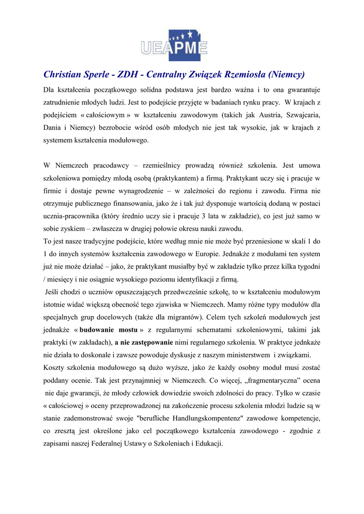 Christian Sperle - ZDH - Centralny Związek Rzemiosła (Niemcy) Dla kształcenia początkowego solidna podstawa jest bardzo ważna i to ona gwarantuje zatrudnienie młodych ludzi. Jest to podejście przyjęte w badaniach rynku pracy. W krajach z podejściem « całościowym » w kształceniu zawodowym (takich jak Austria, Szwajcaria, Dania i Niemcy) bezrobocie wśród osób młodych nie jest tak wysokie, jak w krajach z systemem kształcenia modułowego. W Niemczech pracodawcy – rzemieślnicy prowadzą również szkolenia. Jest umowa szkoleniowa pomiędzy młodą osobą (praktykantem) a firmą. Praktykant uczy się i pracuje w firmie i dostaje pewne wynagrodzenie – w zależności do regionu i zawodu. Firma nie otrzymuje publicznego finansowania, jako że i tak już dysponuje wartością dodaną w postaci ucznia-pracownika (który średnio uczy sie i pracuje 3 lata w zakładzie), co jest już samo w sobie zyskiem – zwłaszcza w drugiej połowie okresu nauki zawodu. To jest nasze tradycyjne podejście, które według mnie nie może być przeniesione w skali 1 do 1 do innych systemów kształcenia zawodowego w Europie. Jednakże z modułami ten system już nie może działać – jako, że praktykant musiałby być w zakładzie tylko przez kilka tygodni / miesięcy i nie osiągnie wysokiego poziomu identyfikacji z firmą. Jeśli chodzi o uczniów opuszczających przedwcześnie szkołę, to w kształceniu modułowym istotnie widać większą obecność tego zjawiska w Niemczech. Mamy różne typy modułów dla specjalnych grup docelowych (także dla migrantów). Celem tych szkoleń modułowych jest jednakże « budowanie mostu » z regularnymi schematami szkoleniowymi, takimi jak praktyki (w zakładach), a nie zastępowanie nimi regularnego szkolenia. W praktyce jednkaże nie działa to doskonale i zawsze powoduje dyskusje z naszym ministerstwem i związkami. Koszty szkolenia modułowego są dużo wyższe, jako że każdy osobny moduł musi zostać poddany ocenie. Tak jest przynajmniej w Niemczech. Co więcej, „fragmentaryczna” ocena nie daje gwarancji, że młody człowiek dowiedzie swoich zdolności do pracy. Tylko w czasie « całościowej » oceny przeprowadzonej na zakończenie procesu szkolenia młodzi ludzie są w stanie zademonstrować swoje "berufliche Handlungskompentenz" zawodowe kompetencje, co zresztą jest określone jako cel początkowego kształcenia zawodowego - zgodnie z zapisami naszej Federalnej Ustawy o Szkoleniach i Edukacji. Thomas Mayr IBW (Austria) Modularyzacja jest szeroko używanym terminem używanym w różnym kontekście w różnych krajach. Ma różne znaczenia, nie tylko jako określenie, ale sam sposób realizacji bardzo się różni w poszczególnych krajach. Dlatego też, generalne odpowiedzi raczej nie są możliwe. Główne zagadnienie polega na ocenie pod kątem używalności i oscyluje wokół dwóch pytań: 1. Jak dalece koncepcja “zawodu” jest zakorzeniona w danym kraju? W Austrii “Berufsprinzip” jest bardzo ważna I odnosi się mocno do samo-określenia danego człowieka. (is very important and relates very much to the self-concept of people). Inne kraje, jak Wielka Brytania posiadają dużo bardziej elastyczne podejście w tej kwestii I koncentrują się raczej na małych jednostkach kompetencji. To z kolei prowadzi do drugiego pytania: 2. jaki jest zakres modułu? Moduł może być bardzo mały w swoim zakresie (jedynie kilka umiejętności, których można się nauczyć w ciągu kilku dni) lub raczej duże. W Austrii, termin modularyzacja jest używany dla nowoprojektowanych profili zawodowych w szkoleniu uczniów (apprenticeship training). Jako, że “Berufsprinzip” jest bardzo ważna z punktu widzenia nie tylko Izb Gospodarczych, ale i związków zawodowych, moduły są bardzo szerokie i w zasadzie nie dotykają Berufsprinzip. Trzyletni program podzielony jest na 3 moduły, które nie są oceniane indywidualnie, ale razem. W zasadzie system zamierza wprowadzić szerszy poziom elastyczności i specjalności w ramach konkretnego zawodu. Dlatego też, nie ma nic wspólnego z innymi, zawężonymi koncepcjami modularyzacji. Wszystkie pozostałe pytania mogą znaleźć odpowiedź tylko w relacji do ogólnego systemu szkolenia uczniów. Najważniejsze fundamenty to: - około 40% przedstawicieli tej grupy wiekowej przechodzi taki typ szkolenia - Istnieje ok. 260 profili zawodowych - Szkolenie odbywa się w miejscu pracy i w szkole. Ale podstawą jest umowa z firmą. - System jest zarządzany głównie przez partnerów społecznych – z izbami gospodarczymi działającymi na podstawie delegacji resortu spraw gospodarczych. - Egzamin jest organizowany przez Izbę Gospodarczą na poziomie lokalnym. Komisja składa się z praktyków lub ekspertów z danego zawodu (przedstawiciele pracodawców lub pracowników). - Instytucją przyznającą kwalifikacje jest lokalna Izba Gospodarcza - Uczeń otrzymuje „wynagrodzenie” ze swojej firmy - “lwią część” kosztów jego przygotowania pokrywają przedsiębiorcy. Ale są i zachęty finansowe ze strony rządu. W ramach systemu, pojęcie modularyzacja obecnie ma raczej pozytywny wydźwięk, pomimo faktu małej prędkości, z jaką projektowane są nowe profile zawodowe przy wykorzystaniu modułów. Powiedzmy, że oryginalne znaczenie modularyzacji, zwłaszcza jednostek których się indywidualnie uczy i które się ocenia bez wspólnej ramy, takiej jak zawód - są dyskutowane głównie w relacji do europejskich inicjatyw i instrumentów, takich jak ECVET. Niemniej jednak, tak jak tego się domagaliśmy, rząd od początku wyraźnie oświadczył, że ECVET ma być tylko i wyłącznie narzędziem mobilności – bez żadnego charakteru regulacyjnego, czy normatywnego na poziomie systemu. Z tego też powodu, sytuacja w Austrii jest inna niż w Niemczech, gdzie wydaje się, że toczy się dyskusja nad węższym określeniem modularyzacji.