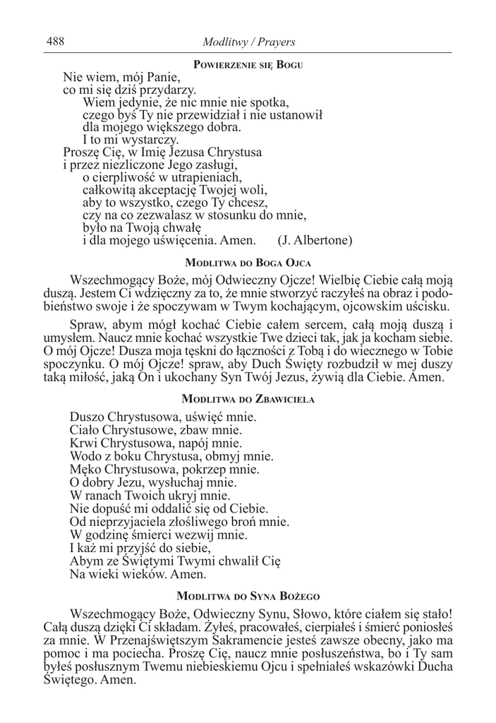 488 Modlitwy / Prayers Powierzenie się Bogu Nie wiem, mój Panie, co mi się dziś przydarzy. Wiem jedynie, że nic mnie nie spotka, czego byś Ty nie przewidział i nie ustanowił dla mojego większego dobra. I to mi wystarczy. Proszę Cię, w Imię Jezusa Chrystusa i przez niezliczone Jego zasługi, o cierpliwość w utrapieniach, całkowitą akceptację Twojej woli, aby to wszystko, czego Ty chcesz, czy na co zezwalasz w stosunku do mnie, było na Twoją chwałę i dla mojego uświęcenia. Amen. (J. Albertone) Modlitwa do Boga Ojca Wszechmogący Boże, mój Odwieczny Ojcze! Wielbię Ciebie całą moją duszą. Jestem Ci wdzięczny za to, że mnie stworzyć raczyłeś na obraz i podobieństwo swoje i że spoczywam w Twym kochającym, ojcowskim uścisku. Spraw, abym mógł kochać Ciebie całem sercem, całą moją duszą i umysłem. Naucz mnie kochać wszystkie Twe dzieci tak, jak ja kocham siebie. O mój Ojcze! Dusza moja tęskni do łączności z Tobą i do wiecznego w Tobie spoczynku. O mój Ojcze! spraw, aby Duch Święty rozbudził w mej duszy taką miłość, jaką On i ukochany Syn Twój Jezus, żywią dla Ciebie. Amen. Modlitwa do Zbawiciela Duszo Chrystusowa, uświęć mnie. Ciało Chrystusowe, zbaw mnie. Krwi Chrystusowa, napój mnie. Wodo z boku Chrystusa, obmyj mnie. Męko Chrystusowa, pokrzep mnie. O dobry Jezu, wysłuchaj mnie. W ranach Twoich ukryj mnie. Nie dopuść mi oddalić się od Ciebie. Od nieprzyjaciela złośliwego broń mnie. W godzinę śmierci wezwij mnie. I każ mi przyjść do siebie, Abym ze Świętymi Twymi chwalił Cię Na wieki wieków. Amen. Modlitwa do Syna Bożego Wszechmogący Boże, Odwieczny Synu, Słowo, które ciałem się stało! Całą duszą dzięki Ci składam. Żyłeś, pracowałeś, cierpiałeś i śmierć poniosłeś za mnie. W Przenajświętszym Sakramencie jesteś zawsze obecny, jako ma pomoc i ma pociecha. Proszę Cię, naucz mnie posłuszeństwa, bo i Ty sam byłeś posłusznym Twemu niebieskiemu Ojcu i spełniałeś wskazówki Ducha Świętego. Amen. Modlitwy / Prayers 489 Modlitwa do Pana Jezusa Tarczo i ochrono moja. Panie Jezu, zmiłuj się nade mną! Zasłoń mnie przed moimi nieprzyjaciółmi, tak jak sam osłoniłeś siebie wtedy, gdy Cię Żydzi chcieli ukamienować i zepchnąć z góry. Wówczas to Ty o Panie, swoją wszechmocą Boską zakryłeś ich oczy i niewidzialny przeszedłeś między nimi. Rozkaż Aniołowi Stróżowi, aby mnie strzegł i bronił od nieszczęść wszelkiego zła. Jezu, Książę Pokoju, pociecho wszystkich utrapionych, ufających w Tobie, zmiłuj się nade mną! Daj mi łaskę i Twoje boskie błogosławieństwo, abym mógł żyć w zgodzie, miłości i jedności ze wszystkimi ludźmi na świecie. Daj mi serce mężne, nietrwożliwe, tak jak dałeś Dawidowi i Samsonowi! Daj mądrość i siłę! Broń mnie Twoją Boską mocą! W imię Ojca i Syna i Ducha Świętego. Amen. Uwielbienie Imienia Jezus Niech Imię Twoje, Panie, zajaśnieje nade mną. Wzywam pomocy Twego Imienia, Jezu! Dziękuję Ci, że mogę wypowiadać Twoje Imię. Dziękuję za miłość Ojca, któremu się oddaję, wzywając Imienia Twego; Ojcze, w Twe ręce składam ducha mego. Tylko Tyś jest Panem. Tylko Tyś Najwyższy, Jezu Chryste. Z Duchem Świętym, w chwale Boga Ojca. Amen. Modlitwa do Ducha Świętego Wszechmogący Boże, Czcigodny Duchu Święty! Ty jesteś Prawdą, Miłością i Światłem. Łaską swoją napełniaj duszę moją. Oświecaj mój rozum, abym mógł poznać prawdę. Wzmacniaj moją wolę, abym mógł wybrać dobro. Wzrusz duszę moją, abym mógł bezgranicznie kochać Ciebie, Ojca i Syna. Amen. Litania do Miłosierdzia Bożego Kyrie, eleison. Chryste, eleison. Kyrie, eleison. Chryste, usłysz nas, Chryste, wysłuchaj nas. Ojcze z nieba, Boże, zmiłuj się nad nami. Synu, Odkupicielu świata, Boże, Duchu Święty, Boże, Święta Trójco, Jedyny Boże, Miłosierdzie Boże, największy przymiocie Stwórcy, - ufam Tobie Miłosierdzie Boże, najwyższa doskonałości Odkupiciela, Miłosierdzie Boże, niezgłębiona miłości Uświęciciela, Miłosierdzie Boże, niepojęta tajemnico Trójcy Świętej, Miłosierdzie Boże, wyrazie największej potęgi Pana, Miłosierdzie Boże, w stworzeniu duchów niebieskich, Miłosierdzie Boże, powołujące nas z nicości do bytu, Miłosierdzie Boże, ogarniające wszechświat cały, Miłosierdzie Boże, darzące nas życiem nieśmiertelnym, 490 Modlitwy / Prayers Miłosierdzie Boże, chroniące nas przed zasłużonymi karami, Miłosierdzie Boże, dźwigające nas z nędzy grzechu, Miłosierdzie Boże, usprawiedliwiające nas w Słowie wcielonym, Miłosierdzie Boże, wypływające z ran Chrystusowych, Miłosierdzie Boże, tryskające z Najświętszego Serca Jezusowego, Miłosierdzie Boże, dające nam Najświętszą Maryję Pannę na Matkę Miłosierdzia, Miłosierdzie Boże, w objawieniu tajemnic Bożych, Miłosierdzie Boże, w ustanowieniu Kościoła Powszechnego, Miłosierdzie Boże, w ustanowieniu Sakramentów świętych, Miłosierdzie Boże, przede wszystkim w sakramencie chrztu i pokuty, Miłosierdzie Boże, w sakramencie Ołtarza i kapłaństwa, Miłosierdzie Boże, w powołaniu nas do wiary świętej, Miłosierdzie Boże, w nawróceniu grzeszników, Miłosierdzie Boże, w uświęceniu sprawiedliwych, Miłosierdzie Boże, w udoskonaleniu świątobliwych, Miłosierdzie Boże, zdroju chorych i cierpiących, Miłosierdzie Boże, ukojenie serc udręczonych, Miłosierdzie Boże, nadziejo dusz zrozpaczonych, Miłosierdzie Boże, towarzyszące wszystkim ludziom zawsze i wszędzie, Miłosierdzie Boże, uprzedzające nas łaskami, Miłosierdzie Boże, pokoju konających, Miłosierdzie Boże, rozkoszy niebiańska zbawionych, Miłosierdzie Boże, ochłodo i ulgo dusz czyśćcowych, Miłosierdzie Boże, korono wszystkich świętych, Miłosierdzie Boże, niewyczerpane źródło cudów, Baranku Boży, któryś okazał największe Miłosierdzie w odkupieniu świata na krzyżu, - prz