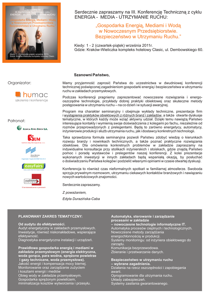 Zapraszamy na III. Konferencjê Techniczn¹ z cyklu: ENERGIA - MEDIA - UTRZYMANIE RUCHU „Gospodarka Energi¹, Mediami i Wod¹ w Nowoczesnym Przedsiêbiorstwie. Bezpieczeñstwo w Utrzymaniu Ruchu.” Serdecznie zapraszamy na III. Konferencjê Techniczn¹ z cyklu ENERGIA - MEDIA - UTRZYMANIE RUCHU: „Gospodarka Energi¹, Mediami i Wod¹ w Nowoczesnym Przedsiêbiorstwie. Bezpieczeñstwo w Utrzymaniu Ruchu.” Kiedy: 1 - 2 (czwartek-pi¹tek) wrzeœnia 2011r. Gdzie: Kraków-Wieliczka kompleks hotelowy Clasic, ul. Dembowskiego 60. Kiedy: 1 - 2 (czwartek-pi¹tek) wrzeœnia 2011r. Gdzie: Kraków-Wieliczka kompleks hotelowy Clasic. Szanowni Pañstwo, Organizator: Mamy przyjemnoœæ zaprosiæ Pañstwa do uczestnictwa w dwudniowej konferencji technicznej poœwiêconej zagadnieniom gospodarki energi¹ i bezpieczeñstwa w utrzymaniu ruchu w zak³adach przemys³owych. Podczas konferencji pragniemy zaprezentowaã nowoczesne rozwiàzania i energooszczêdne technologie, przyk³ady dobrej praktyki obiektowej oraz skuteczne metody postæpowania w utrzymaniu ruchu – na co dzieñ i w sytuacji awaryjnej. Patronat: Program ma charakter seminaryjny i obejmuje wyk³ady techniczne, prezentacje firm i wyst¹pienia praktyków obiektowych z ró¿nych bran¿ i zak³adów, a tak¿e otwarte dyskusje tematyczne, w których ka¿dy mo¿e wzi¹æ aktywny udzia³. Dziêki temu nawi¹¿¹ Pañstwo interesuj¹ce kontakty i wymieni¹ swoje doœwiadczenia z kolegami po fachu, niezale¿nie od rozmów przeprowadzonych z prelegentami. Bêd¹ to zarówno energetycy, automatycy, in¿ynierowie produkcji i s³u¿b utrzymania ruchu, jak i dostawcy konkretnych technologii. Taka sprawdzona formu³a seminaryjna pozwoli Pañstwu zdobyæ wiedzê o kierunkach rozwoju bran¿y i nowinkach technicznych, a tak¿e poznaæ praktyczne rozwi¹zania obiektowe. Dla omówienia konkretnych problemów w zak³adzie zapraszamy na indywidualne konsultacje przy stolikach in¿ynierskich i stoiskach, gdzie znajd¹ Pañstwo pomoc i poradê wystawców i prelegentów naszej konferencji. Z kolei prezentacje wykonanych inwestycji w innych zak³adach bêd¹ wspania³¹ okazj¹, by pos³uchaæ o doœwiadczeniu Pañstwa kolegów i podzieliæ w³asnymi opiniami w czasie otwartej dyskusji. Konferencja to równie¿ czas nieformalnych spotkañ w familiarnej atmosferze. Swoboda sprzyja prywatnym rozmowom, utrzymaniu ciekawych kontaktów bran¿owych i nawi¹zaniu nowych wartoœciowych znajomoœci. Serdecznie zapraszamy. 15 lat doœwiadczenia w pomiarach Z powa¿aniem, Edyta Duraziñska-Caba PLANOWANY ZAKRES TEMATYCZNY: Od audytu do efektywnoúci. Audyt energetyczny w zakùadach przemysùowych. Inwestycje, równie¿ niskonak³adowe, wspierajàce efektywnoúã. Diagnostyka energetyczna instalacji i urzàdzeñ. Prawidùowa gospodarka energià i mediami w zakùadzie przemysùowym (energia elektryczna, woda gor¹ca, para wodna, spræýone powietrze i gazy techniczne, woda przemys³owa). Jakoúã energii i kompensacja mocy biernej. Monitorowanie oraz zarzàdzanie zuýyciem i kosztami energii i mediów Obieg wody w zakùadzie przemysùowym. Gospodarka spræýonym powietrzem, minimalizacja kosztów wytworzenia i przesyùu. Automatyka, sterowanie i zarzàdzanie procesami w zakùadzie – nowoczesne technologie informatyczne IT. Automatyka procesów cieplnych i technologicznych. Nowoczesne metody zarzàdzania energochùonnoúcià w produkcji. Systemy monitoringu: od inýyniera obiektowego do zarzàdu. Komunikacja bezprzewodowa. Zbieranie i przetwarzanie danych. Bezpieczeñstwo w utrzymaniu ruchu – wybrane zagadnienia. Dziaùania na rzecz oszczædnoúci i zapobiegania awarii. Oprogramowanie dla utrzymania ruchu. Ukùady zabezpieczeñ. Systemy zasilania gwarantowanego. Zapraszamy na III. Konferencjê Techniczn¹ z cyklu: ENERGIA - MEDIA - UTRZYMANIE RUCHU „Gospodarka Energi¹, Mediami i Wod¹ w Nowoczesnym Przedsiêbiorstwie. Bezpieczeñstwo w Utrzymaniu Ruchu.” Serdecznie zapraszamy na III. Konferencjê Techniczn¹ z cyklu ENERGIA - MEDIA - UTRZYMANIE RUCHU: „Gospodarka Energi¹, Mediami i Wod¹ w Nowoczesnym Przedsiêbiorstwie. Bezpieczeñstwo w Utrzymaniu Ruchu.” Kiedy: 1 - 2 (czwartek-pi¹tek) wrzeœnia 2011r. Gdzie: Kraków-Wieliczka kompleks hotelowy Clasic, ul. Dembowskiego 60. Kiedy: 1 - 2 (czwartek-pi¹tek) wrzeœnia 2011r. Gdzie: Kraków-Wieliczka kompleks hotelowy Clasic. Cel konferencji: Rzetelne przedstawienie wybranych zagadnieñ w ujêciu praktycznym, in¿ynierskim: - poszanowanie energii i mediów w przemyœle tj. na etapie przesy³u i prawid³owego u¿ytkowania - dzia³ania zwiêkszaj¹ce oszczêdnoœæ od najprostszych po systemowe - bezpieczeñstwo w utrzymaniu ruchu, wybrane zagadnienia - automatyka, sterowanie i zarzàdzanie procesami w zakùadzie – nowoczesne technologie. Komu dedykowana: Dyrektorzy techniczni i szefowie wydzia³ów. In¿ynierowie obiektowi, utrzymania ruchu i automatycy z zak³adów przemys³owych i z energetyki. Ciep³ownicy i energetycy, oraz g³ówni energetycy z zak³adów produkcyjnych. Wszystkie osoby, których praca dotyczy tematyki energii i zarz¹dzania procesami w przemyœle. PROGRAM RAMOWY KONFERENCJI: 1. dzieñ Godz. 11.00 – 13.00 Rejestracja goœci. Przygotowanie stolików in¿ynierskich i stoisk. Godz. 12.00 – 13.00 Obiad. Otwarcie konferencji: 1.09.2011 czwartek godz. 13.00. Powitanie. Przedstawienie za³o¿eñ i programu konferencji. Prezentacja patronów cyklu i konferencji. Przegl¹d spotkañ bran¿owych: targi, konferencje, seminaria. Godz. 13.30 -19.00 Wyk³ady, prelekcje, prezentacje. Panele Tematyczne. Od audytu do efektywnoœci. Prawidùowa gospodarka energià i mediami w zakùadzie przemysùowym. (energia elektryczna, woda gor¹ca, para wodna, spræýone powietrze i gazy techniczne) Woda przemys³owa. Automatyka, sterowanie i zarzàdzanie procesami w zakùadzie – nowoczesne technologie. Dyskusja Bran¿owa. W przerwach indywidualne konsultacje in¿ynierskie i rozmowy z kontrahentami. Godz. 20.00 - 24.