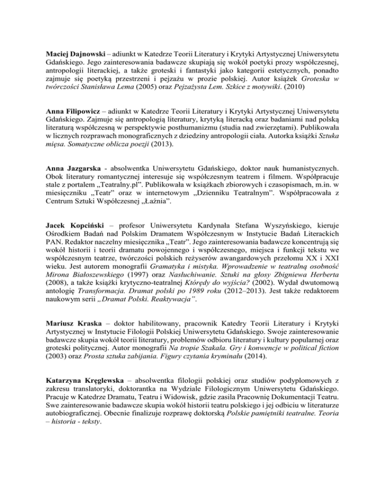Maciej Dajnowski – adiunkt w Katedrze Teorii Literatury i Krytyki Artystycznej Uniwersytetu Gdańskiego. Jego zainteresowania badawcze skupiają się wokół poetyki prozy współczesnej, antropologii literackiej, a także groteski i fantastyki jako kategorii estetycznych, ponadto zajmuje się poetyką przestrzeni i pejzażu w prozie polskiej. Autor książek Groteska w twórczości Stanisława Lema (2005) oraz Pejzażysta Lem. Szkice z motywiki. (2010) Anna Filipowicz – adiunkt w Katedrze Teorii Literatury i Krytyki Artystycznej Uniwersytetu Gdańskiego. Zajmuje się antropologią literatury, krytyką literacką oraz badaniami nad polską literaturą współczesną w perspektywie posthumanizmu (studia nad zwierzętami). Publikowała w licznych rozprawach monograficznych z dziedziny antropologii ciała. Autorka książki Sztuka mięsa. Somatyczne oblicza poezji (2013). Anna Jazgarska - absolwentka Uniwersytetu Gdańskiego, doktor nauk humanistycznych. Obok literatury romantycznej interesuje się współczesnym teatrem i filmem. Współpracuje stale z portalem „Teatralny.pl”. Publikowała w książkach zbiorowych i czasopismach, m.in. w miesięczniku „Teatr” oraz w internetowym „Dzienniku Teatralnym”. Współpracowała z Centrum Sztuki Współczesnej „Łaźnia”. Jacek Kopciński – profesor Uniwersytetu Kardynała Stefana Wyszyńskiego, kieruje Ośrodkiem Badań nad Polskim Dramatem Współczesnym w Instytucie Badań Literackich PAN. Redaktor naczelny miesięcznika „Teatr”. Jego zainteresowania badawcze koncentrują się wokół historii i teorii dramatu powojennego i współczesnego, miejsca i funkcji tekstu we współczesnym teatrze, twórczości polskich reżyserów awangardowych przełomu XX i XXI wieku. Jest autorem monografii Gramatyka i mistyka. Wprowadzenie w teatralną osobność Mirona Białoszewskiego (1997) oraz Nasłuchiwanie. Sztuki na głosy Zbigniewa Herberta (2008), a także książki krytyczno-teatralnej Którędy do wyjścia? (2002). Wydał dwutomową antologię Transformacja. Dramat polski po 1989 roku (2012–2013). Jest także redaktorem naukowym serii „Dramat Polski. Reaktywacja”. Mariusz Kraska – doktor habilitowany, pracownik Katedry Teorii Literatury i Krytyki Artystycznej w Instytucie Filologii Polskiej Uniwersytetu Gdańskiego. Swoje zainteresowanie badawcze skupia wokół teorii literatury, problemów odbioru literatury i kultury popularnej oraz groteski politycznej. Autor monografii Na tropie Szakala. Gry i konwencje w political fiction (2003) oraz Prosta sztuka zabijania. Figury czytania kryminału (2014). Katarzyna Kręglewska – absolwentka filologii polskiej oraz studiów podyplomowych z zakresu translatoryki, doktorantka na Wydziale Filologicznym Uniwersytetu Gdańskiego. Pracuje w Katedrze Dramatu, Teatru i Widowisk, gdzie zasila Pracownię Dokumentacji Teatru. Swe zainteresowanie badawcze skupia wokół historii teatru polskiego i jej odbiciu w literaturze autobiograficznej. Obecnie finalizuje rozprawę doktorską Polskie pamiętniki teatralne. Teoria – historia - teksty. Zbigniew Majchrowski – profesor zwyczajny w Katedrze Teorii Literatury i Krytyki Artystycznej Uniwersytetu Gdańskiego. Jego zainteresowania badawcze obejmują epokę romantyzmu oraz wiek XX, dramat i teatr współczesny, antropologię literatury i sztuk widowiskowych, a także współczesną kulturę medialną. Autor książek: „Poezja jak otwarta rana”. Czytając Różewicza (1993), Gombrowicz i cień wieszcza (1995), Cela Konrada (1998), Różewicz (2002), Mickiewicz i wiek dwudziesty (2006). Współpracował z Marią Janion przy serii „Transgresje” (Odmieńcy, 1982), wydał teatralia Andrzeja Kijowskiego (Rytuały oglądania, 2005). Współautor i redaktor wielu prac zbiorowych, m.in.: Balsam i trucizna. 13 tekstów o Mickiewiczu (1993), Od Shakespeare’a do Szekspira (1993), Świat według Themersonów (1994), Mickiewicz. Sen i widzenie (2001), Dramat polski. Interpretacje (2001), Księga Janion (2007), Wojna i postpamięć (2011). Ostatnio w ramach serii Dramat Polski. Reaktywacja” opracował wybór sztuk teatralnych Ireneusza Iredyńskiego Kreacja. Dramaty (2014). Joanna Puzyna-Chojka – adiunkt w Katedrze Dramatu, Teatru i Filmu Uniwersytetu Gdańskiego. Badawczo interesuje się współczesną dramaturgią i teatrem „nowego realizmu”. Jest autorką kilkudziesięciu artykułów i esejów zamieszczonych w tomach zbiorowych oraz periodykach kulturalnych. Przez wiele lat zajmowała się również krytyką teatralną, publikując na łamach „Gazety Wyborczej”, „Tygodnika Powszechnego”, „Teatru”, „Dialogu”, „Didaskaliów” i „Notatnika Teatralnego”. Była kierownikiem literackim Teatru Muzycznego im. Danuty Baduszkowej w Gdyni, Teatru im. Wojciecha Bogusławskiego w Kaliszu i Teatru Miejskiego im. Witolda Gombrowicza w Gdyni. Katarzyna Szalewska – adiunkt w Katedrze Teorii Literatury i Krytyki Artystycznej Uniwersytetu Gdańskiego. W swojej pracy badawczej zajmuje się studiami miejskimi, związkami między literaturoznawstwem a teoriami wiedzy o przeszłości, metodologią historii i estetyką melancholijną. Autorka monografii Pasaż tekstowy. Czytanie miasta jako forma doświadczenia przeszłości we współczesnym eseju polskim (2012); współredaktorka książek: Przekleństwo rzeczywistości. Rzecz o obsesji i fantazji (2009) oraz Czesława Miłosza „północna strona” (2009). Joanna Walaszek – profesor Uniwersytetu Jagiellońskiego, historyk i krytyk współczesnego teatru. Swoją działalność naukową, krytyczną i dydaktyczną skupia wokół zagadnień „żywego" teatru - twórczości wybitnych artystów (reżyserów aktorów, zespołów), przedstawień, interpretacji scenicznych dramatów (m.in. Szekspira), procesów przemian idei, estetyki, teorii i praktyki współczesnego teatru. Autorka książek: Konrad Swinarski i jego krakowskie inscenizacje (1992), Teatr Wajdy. W kręgu arcydzieł