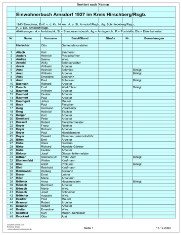 Sortiert nach Namen Einwohnerbuch Arnsdorf 1927 im Kreis Hirschberg/Rsgb. 1943 Einwohner, Entf. v. d. Kr. 14 km., A. u. St. Arnsdorf/Rsgb., Ag. Schmiedeberg/Rsgb., P. u. Eis. Arnsdorf/Rsgb. Abkürzungen: A.= Amtsbezirk, St.= Standesamtsbezirk, Ag.= Amtsgericht, P.= Poststelle, Eis.= Eisenbahnstat. Nr. 1 2 3 4 5 6 7 8 9 10 11 12 13 14 15 16 17 18 19 20 21 22 23 24 25 26 27 28 29 30 31 32 33 34 35 36 37 38 39 40 41 42 43 44 45 46 47 48 Name Vorname Beruf/Stand Hielscher Otto Gemeindevorsteher Alisch Anders Andrae Arnold Asser Aust Aust Aust Aust Baensch Barsch Baumert Baumert Baumert Baumgart Beck Berg Berg Berger Bernhard Bessert Beyer Beyer Beyer Beyer Bihm Birke Birke Birke Birkner Bittner Blankenfeld Blau Bleil Bornowski Boser Böer Böhmer Bönsch Bönsch Bönsch Böttcher Bradler Brauner Brauner Breiter Breitfeld Bruckauf Karl Heinrich Selma Willy Wilhelm Heinrich Wilhelm Ernestine Paul Richard Emil Wilhelm Gustav Paul Julius Paul Hermann Heinrich Kurt Peter Robert Franz Richard Paul Oswald Emil Klara Richard Gustav Josef Klemens Dr. Walter Adolf Reinhold Hedwig Ernst Marie Anna Bernhard Marie Josef Auguste Paul Robert Robert Ernestine Kurt Otto Zimmerer Postschaffner Wwe. Bahnverwalter Arbeiter Schmied Arbeiter Spinnerin Schlosser Arbeiter Werkführer Arbeiter Arbeiter Arbeiter Maurer Fleischer Vorarbeiter Tischler Arbeiter Arbeiter Fleischermeister Rentner Arbeiter Handelsmann Reserve- Lokomotivführ. Arbeiter Binderin Handels-Gärtner Arbeiter Glasschleifermeister Prakt. Arzt Kaufmann Prokurist Kaufmann Stickerin Lehrer Arbeiterin Hausmeisterin Arbeiter Wwe. Schneider Wwe. Maurer Arbeiter Arbeiter Wwe. Masch.-Schlosser Arzt Abschrift erstellt von: Winfried Schön [email protected] Seite 1 Straße Nr. Bemerkungen Birkigt Birkigt Birkigt Birkigt Birkigt Birkigt Birkigt 15.12.2003 Sortiert nach Namen Nr. Name 49 50 51 52 53 54 55 56 57 58 59 60 61 62 63 64 65 66 67 68 69 70 71 72 73 74 75 76 77 78 79 80 81 82 83 84 85 86 87 88 89 90 91 92 93 94 95 96 97 98 99 100 101 102 103 104 105 106 107 Brückner Brückner Bürgel Bürgel Burkert Cassel Christ Conrad Conrad Dahlheim David Dehmel Deinert Deunert Dittmann Dittmann Dittrich Dom Drabik Dreißig Drescher Drescher Drescher Eckert Effner Eitner Elsner Ende Ende Ende Ende Ende Ende Ende Ende Eng Erbe Erbe Ermel Ermel Ermel Exner Exner Exner Exner Fabig Fabig Färber Fechner Fehringer Feierabend Feige Feist Feisthauer Fendler Fichtner Fichtner Fiebig Fiebig Abschrift erstellt von: Winfried Schön [email protected] Vorname Anna Gustav Anna Josef Paul Philipp Henriette Hermann Max Wilhelm Paul Gustav Paul Auguste Julius Paul Robert Berta Heinrich Friedrich Wilhelm Hermann Martha Robert Emanuel Robert Josef Hermann Emil Richard Anna Heinrich Ida Ida Fritz Eugen Klara Hermann Hermann Paul Adolf Selma Berta Paul Gustav Gustav Hermann Johanna Friedrich Georg Kurt Martha Ernst Karl Kurt Alfred Emilie Emma Gustav Beruf/Stand Wwe. Mangelmeister Wwe. Arbeiter Lagerhalter Rentner Arbeiterin Müllermeister Sägewerksbesitzer Arbeiter Lehrer Arbeiter Baumeister Rentner Reparateur Arbeiter Lokomotivführer Arbeiterin Fabrikbesitzer Bautechniker Stellenbesitzer Arbeiter Wwe. Maschinenführer Pfarrer Kaufmann Arbeiter Arbeiter Arbeiter Arbeiter Hausbesitzerin Landwirt Wwe. Wwe. Landwirt Rechnungs-Rat Arbeiterin Arbeiter Arbeiter Arbeiter Maurer Wwe. Drogerie-Besitzerin Arbeiter Lokomotivführer Böttcher Gastwirt Wwe. Gastwirt Post-Vorsteher Werkführer Näherin Gastwirt Bahnarbeiter Sägewerksbesitzer Fleischermeister Wwe. Arbeiterin Gärtner Seite 2 Straße Nr. Bemerkungen Mühlenbesitzer Birkigt Birkigt Birkigt 15.12.2003 Sortiert nach Namen Nr. 108 109 110 111 112 113 114 115 116 117 118 119 120 121 122 123 124 125 126 127 128 129 130 131 132 133 134 135 136 137 138 139 140 141 142 143 144 145 146 147 148 149 150 151 152 153 154 155 156 157 158 159 160 161 162 163 164 165 166 Name Finger Fischer Fischer Flegel Flemming Franke Franke Friedrich Friese Friese Friese Frunzek Galonska Gebauer Geisler Gerberich Gerditschke Gimler Gläser Göldner Götz Grabinger Grabs Greger Grobe Großmann Großschopf Großstück Hallmann Hallmann Hallmann Hallmann Hallmann Hammer Hammer Hampel Hampel Hampel Hampel Hampel Hampel Hampel Hanuschke Hartmann Hartmann Hartmann Hartmann Hartmann Hartmann Hartmann Hartwig Hauffe Häder Händler Häring Häring Häring Häring Häring Abschrift erstellt von: Winfried Schön [email protected] Vorname Anna Berta Heinrich Heinrich Friedrich Wilhelm Wilhelm Paul Robert Wilhelm Gustav Karl August Fritz Lothar Friedrich Karl Friedrich Wilhelm Paul Robert Josef Bruno Friedrich Otto Hedwig Ernestine Kurt Anna Hermann Anna Christiane Robert Friedrich Ernestine Heinrich Heinrich Gustav Pauline Ernestine Adolf Friedrich Wilhelm Gustav Hermann Albert Aloys Albert Auguste Richard Paul Hermann Hermann Otto Gustav Hermann Paul August Karl Beruf/Stand Wwe. Wwe. Arbeiter Amts-Gehilfe Barbier Fabrikbesitzer Betriebsleiter Kraftfahrer Arbeiter Rentenempfänger Stellenbesitzer Arbeiter Heizer Arbeiter Konditor Schneider Landwirt Eisenbahn-Inspektor Zugführer Postschaffner Schuhmacher Schuhmacher Arbeiter Arbeiter Privatier Schneiderin Rentnerin Kaufmann Arbeiterin Maschinist Wwe. Arbeiterin Arbeiter Klempner Arbeiterin Stellmacher Arbeiter Bauarbeiter Arbeiterin Arbeiterin Stellmacher Gutsbesitzer Lehrer Maurer Arbeiter Klempner Gemeinde-Sekretär Klempnermeister Wwe. Arbeiter Rendant Bäckermeister Arbeiter Bahn-Vorsteher Lohnaufseher Arbeiter Arbeiter Arbeiter Arbeiter Seite 3 Straße Nr. Bemerkungen Birkigt Birkigt Birkigt Birkigt Birkigt Birkigt 15.12.2003 Sortiert nach Namen Nr. 167 168 169 170 171 172 173 174 175 176 177 178 179 180 181 182 183 184 185 186 187 188 189 190 191 192 193 194 195 196 197 198 199 200 201 202 203 204 205 206 207 208 209 210 211 212 213 214 215 216 217 218 219 220 221 222 223 224 225 Name Häring Härtel Härtel Härtel Heese Heier Heilmann Heinrich Heinrich Heinze Heinze Heisig Heisig Heisig Henke Henke Hentschel He
