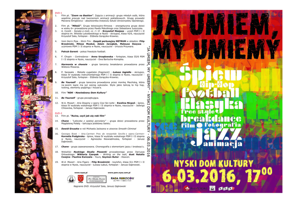 DVD-1 1. Film pt. "Zoom na Bastion". Zajęcia z animacji: grupa młodyh osób, która wspólnie pracuje nad tworzeniem animacji poklatkowych. Grupę prowadzi Marzena Śmiglewicz - absolwentka Instytutu Sztuki Uniwersytetu Opolskiego. 2. 3. KONCERT w wykonaniu uczniów sekcji fortepianu Państwowej Szkoły Muzycznej I stopnia im. Witolda Lutosławskiego w Nysie Film pt. "Miłość". Grupa telewizyjno-filmowa - energetyczna grupa dzieci w wieku 6+ prowadzona przez Pawła Maluśkiego oraz Sebastiana Juszczyka. A. Corelli - Sonata e-moll, cz. I i II - Krzysztof Mesjasz - uczeń PSM I i II stopnia im. Witolda Lutosławskiego w Nysie - skrzypce, klasa VI/6, nauczyciel Krzysztof Sala, fortepian - Elżbieta Gorączko-Krawiec. Vom Herrn Pipa - Stick-Trix - Zespół perkusyjny METRUM w składzie: Filip Brzeźnicki, Miłosz Moskal, Adam Jarząbek, Mateusz Oszywa uczniowie PSM I i II stopnia w Nysie, nauczyciel - Urszula Przywara. 5. Patryk Gerent - pokaz freestyle football. 6. F. Chopin - Contredanse - Anna Urzędowska - fortepian, klasa III/6 PSM I i II stopnia w Nysie, nauczyciel - Ewa Bartocha-Konopka. 7. Harmonia w chaosie - grupa tancerzy breakdance prowadzona przez Wiktora Misiarza. 8. P. Sarasate - Melodie cygańskie (fragment) - Łukasz Jagiełło - skrzypce, klasa IV wydziału instrumentalnego PSM I i II stopnia w Nysie, nauczyciel Krzysztof Sala, fortepian - Elżbieta Gorączko-Krawiec. 9. Be Yourself - grupa taneczna prowadzona przez monikę Macińską, która na swoim kącie ma już szereg sukcesów. Style jakie tańczą to hip hop, locking, elementy poppingu i house'a. 10. Film "NDK - Nawiedzony Dom Kultury" 11. Be Yourself - grupa początkująca. 12. W.A. Mozart - Aria Despiny z opery Cosi fan tutte - Ewelina Nicpoń - śpiew, klasa IV wydziału wokalnego PSM I i II stopnia w Nysie, nauczyciel - Jadwiga Chlewicka, fortepian - Janusz Dąbrowski. DVD-2 13. Film pt. "Ruina, czyli jak się robi film" 14. Chane - "Laleczka z saskiej porcelany" - grupa dzieci prowadzona przez Magdalenę Połatę - tańcząca podstawy baletu. 15. Dawid Gruszka w roli Michaela Jacksona w utworze Smooth Ctiminal 16. Georges Bizet – Aria Carmen Pres de renpartde Seville z opery CarmenKornelia Podgórska - śpiew, klasa IV wydziału wokalnego PSM I i II stopnia w Nysie, nauczyciel - Agnieszka Niewiadmoska, fortepian - Janusz Dąbrowski. 17. Chane - grupa zaawansowana. Choreografia z elementami jazzu i brodway'u. 18. Wokaliści Nyskiego Studia Piosenki prowadzonego przez Dariusza Orłowskiego: Wiktoria Czerpak - Writing on the wall, duet Natalia Cwajna i Paulina Kwiczala - Yours, Szymon Butor - Heaven. 19. W.A. Mozart - Aria Figaro - Filip Brzeźnicki - ksylofon, klasa II/c PSM I i II stopnia w Nysie, nauczyciel - Łukasz Łabuś, fortepian - Janusz Dąbrowski. www.nysa.pl www.psm.nysa.com.pl Nagranie DVD: Krzysztof Sala, Janusz Dąbrowski "JA UMIEM, MY UMIEMY" - NYSKI DOM KULTURY - 06.03.2016 4. Sala Widowiskowa Nyskiego Domu Kultury 6 marca 2016