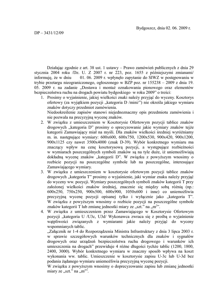 Bydgoszcz, dnia 02. 06. 2009 r. DP – 3431/12/09 Działając zgodnie z art. 38 ust. 1 ustawy – Prawo zamówień publicznych z dnia 29 stycznia 2004 roku /Dz. U. Z 2007 r. nr 223, poz. 1655 z późniejszymi zmianami/ informuję, że w dniu 01. 06. 2009 r. wpłynęło zapytanie do SIWZ w postępowaniu w trybie przetargu nieograniczonego, ogłoszonego w BZP poz. nr 155238 – 2009 z dnia 19. 05. 2009 r. na zadanie „Dostawa i montaż oznakowania pionowego oraz elementów bezpieczeństwa ruchu na drogach powiatu bydgoskiego w roku 2009” o treści: 1. Prosimy o wyjaśnienie, jakiej wielkości znaki należy przyjąć do wyceny. Kosztorys ofertowy (za wyjątkiem pozycji „kategoria D /mini/”) nie określa jakiego wymiaru znaków dotyczy przedmiot zamówienia. Niedookreślenie zapisów stanowi niejednoznaczny opis przedmiotu zamówienia i nie pozwala na precyzyjną wycenę znaków. 2. W związku z umieszczeniem w Kosztorysie Ofertowym pozycji tablice znaków drogowych „kategoria D” prosimy o sprecyzowanie jakie wymiary znaków tejże kategorii Zamawiający miał na myśli. Dla znaków wielkości średniej wyróżniamy m. in. następujące wymiary: 600x600, 600x750, 1200x530, 900x420, 900x1200, 900x1125 czy nawet 3500x4000 (znak D-39). Wybór konkretnego wymiaru ma znaczący wpływ na cenę kosztorysową pozycji, a występujące rozbieżności w wymiarach poszczególnych symboli znaków są na tyle duże, iż uniemożliwiają dokładną wycenę znaków „kategorii D”. W związku z powyższym wnosimy o rozbicie pozycji na poszczególne symbole lub na poszczególne, interesujące Zamawiającego wymiary. 3. W związku z umieszczeniem w kosztorysie ofertowym pozycji tablice znaków drogowych „kategoria T” prosimy o wyjaśnienie, jaki wymiar znaku należy przyjąć do wyceny ww. pozycji. Wymiary poszczególnych symboli znaków kategorii T przy założonej wielkości znaków średniej, znacznie się między sobą różnią (np.: 600x250, 750x250, 900x500, 600x900, 1050x600 i inne) co uniemożliwia precyzyjną wycenę pozycji opisanej tylko i wyłącznie jako „kategoria T”. W związku z powyższym wnosimy o rozbicie pozycji na poszczególne symbole znaków kategorii T lub zmianę jednostki miary ze „szt.” na „m2”. 4. W związku z umieszczeniem przez Zamawiającego w Kosztorysie Ofertowym pozycji „kategoria U /U3c, U3d/ Wykonawca zwraca się z prośbą o wyjaśnienie wątpliwości związanych z wymiarami jakie należy przyjąć do wyceny wspomnianych tablic. „Załącznik nr 1-4 do Rozporządzenia Ministra Infrastruktury z dnia 3 lipca 2003 r. w sprawie szczegółowych warunków technicznych dla znaków i sygnałów drogowych oraz urządzeń bezpieczeństwa ruchu drogowego i warunków ich umieszczenia na drogach” przewiduje 4 różne długości tychże tablic (1200, 1800, 2400, 3000). Wybór konkretnego wymiaru w znaczny sposób wpływa na koszt wykonania ww. tablic. Umieszczenie w kosztorysie zapisu U-3c lub U-3d bez podania żądanego wymiaru uniemożliwia precyzyjną wycenę pozycji. W związku z powyższym wnosimy o doprecyzowanie zapisu lub zmianę jednostki miary ze „szt.” na „m2”. 5. Prosimy o doprecyzowanie zapisu „lustro U-18a” a w szczególności podanie jakiego kształtu (okrągłe, prostokątne) i jakiego wymiaru dotyczy przedmiot zamówienia. Wybór konkretnego kształtu i wymiaru lustra ma bardzo duży wpływ na jego cenę. Niedokładny opis może powodować rozbieżności w interpretacji zapisu i w rezultacie uniemożliwia precyzyjną wycenę pozycji. 6. W związku z umieszczeniem w Kosztorysie Ofertowym pozycji „bariery ochronne typu SP-06/4 z odcinkami początkowymi i końcowymi typu KS-3A”, wykonawca zwraca się z prośbą o wyjaśnienie, co Zamawiający rozumie prze 1 kpl. ww. bariery, a w szczególności o podanie długości odcinka stanowiącego 1 kpl oraz długość odcinka początkowego oraz końcowego bariery. Prosimy również o podanie dokładnego opisu i wzorów odcinków początkowych i końcowych typu KS-3A. Ponadto prosimy o wyjaśnienie jaki typ słupka do bariery należy przyjąć wyceniając pozycję. 7. W związku z zamieszczeniem przez Zamawiającego w Kosztorysie Ofertowym pozycji „bariery ochronne /rurowe – 2,0/” wnosimy o umieszczenie w SIWZ wzoru oraz pełnego opisu ww. pozycji, a w szczególności o podanie wymiarów, koloru oraz rodzaju materiałów jakich należy użyć do wykonania barier ochronnych. Pozostawienie zapisu w postaci niezmienionej stanowi niepełny opis zamówienia oraz uniemożliwia precyzyjną wycenę pozycji. 8. W związku z zamieszczeniem przez Zamawiającego w Kosztorysie Ofertowym pozycji „słupki do znaków, składane z przedłużką” wnosimy o umieszczenie w SIWZ wzorów oraz pełnego opisu ww. pozycji, a w szczególności o podanie wymiarów, oraz rodzaju materiałów jakich należy użyć do wykonania ww. słupków. 9. W związku z umieszczeniem przez Zamawiającego w Kosztorysie Ofertowym pozycji „elementy odblaskowe, okrągłe o średnicy 50 mm” prosimy o wyjaśnienie czy Zamawiający miał na myśli „U-1c punktowy element odblaskowy prowadzący umieszczony na barierze ochronnej”. Jeżeli nie, prosimy o zamieszczenie w SIWZ dokładnego opisu pozycji wraz ze wzorami. 10. W związku z umieszczeniem w Kosztorysie ofertowym pozycji: „dostawa i instalacja tablicy ostrzegawczej typu U-26b” i „dostawa i instalacja tablicy ostrzegawczej typu U-26d” oraz w nawiązaniu do zapisów „Załącznika nr 1-4 do Rozporządzenia Ministra Infrastruktury z dnia 3 lipca 2003 r. [...]” (str. 434, pkt 11.9 Tablice zamykające): „Do zamykania pasa ruchu, a w szczególności z powodu prowadzenia robót drogowych, stosuje się tablice zamykające mocowane do pojazdów”, prosimy o podanie pełnego opisu pojazdów na jakich Zamawiający życzy sobie zamontować ww. tablice. Prosimy również o umieszczenie w Specyfikacji Technicznej pełnych parametrów jakim powinny odpowiadać 