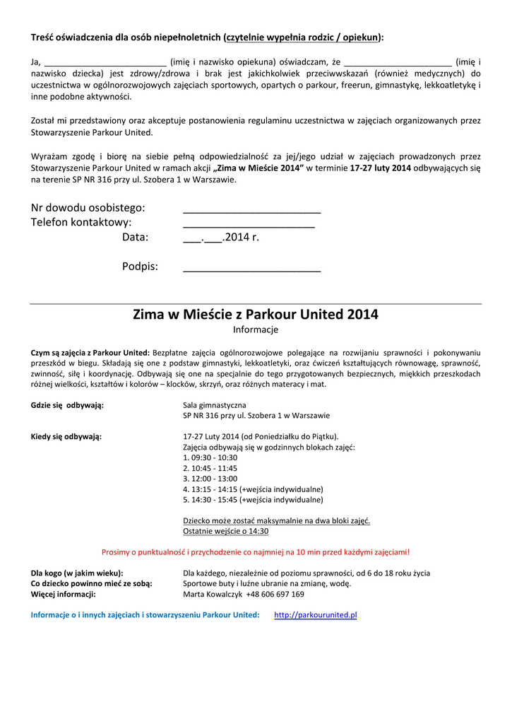 Treść oświadczenia dla osób niepełnoletnich (czytelnie wypełnia rodzic / opiekun): Ja, __________________________ (imię i nazwisko opiekuna) oświadczam, że _______________________ (imię i nazwisko dziecka) jest zdrowy/zdrowa i brak jest jakichkolwiek przeciwwskazań (również medycznych) do uczestnictwa w ogólnorozwojowych zajęciach sportowych, opartych o parkour, freerun, gimnastykę, lekkoatletykę i inne podobne aktywności. Został mi przedstawiony oraz akceptuje postanowienia regulaminu uczestnictwa w zajęciach organizowanych przez Stowarzyszenie Parkour United. Wyrażam zgodę i biorę na siebie pełną odpowiedzialność za jej/jego udział w zajęciach prowadzonych przez Stowarzyszenie Parkour United w ramach akcji „Zima w Mieście 2014” w terminie 17-27 luty 2014 odbywających się na terenie SP NR 316 przy ul. Szobera 1 w Warszawie. Nr dowodu osobistego: Telefon kontaktowy: Data: Podpis: _______________________ ______________________ ___.___.2014 r. _______________________ Zima w Mieście z Parkour United 2014 Informacje Czym są zajęcia z Parkour United: Bezpłatne zajęcia ogólnorozwojowe polegające na rozwijaniu sprawności i pokonywaniu przeszkód w biegu. Składają się one z podstaw gimnastyki, lekkoatletyki, oraz ćwiczeń kształtujących równowagę, sprawność, zwinność, siłę i koordynację. Odbywają się one na specjalnie do tego przygotowanych bezpiecznych, miękkich przeszkodach różnej wielkości, kształtów i kolorów – klocków, skrzyń, oraz różnych materacy i mat. Gdzie się odbywają: Sala gimnastyczna SP NR 316 przy ul. Szobera 1 w Warszawie Kiedy się odbywają: 17-27 Luty 2014 (od Poniedziałku do Piątku). Zajęcia odbywają się w godzinnych blokach zajęć: 1. 09:30 - 10:30 2. 10:45 - 11:45 3. 12:00 - 13:00 4. 13:15 - 14:15 (+wejścia indywidualne) 5. 14:30 - 15:45 (+wejścia indywidualne) Dziecko może zostać maksymalnie na dwa bloki zajęć. Ostatnie wejście o 14:30 Prosimy o punktualność i przychodzenie co najmniej na 10 min przed każdymi zajęciami! Dla kogo (w jakim wieku): Co dziecko powinno mieć ze sobą: Więcej informacji: Dla każdego, niezależnie od poziomu sprawności, od 6 do 18 roku życia Sportowe buty i luźne ubranie na zmianę, wodę. Marta Kowalczyk +48 606 697 169 Informacje o i innych zajęciach i stowarzyszeniu Parkour United: http://parkourunited.pl