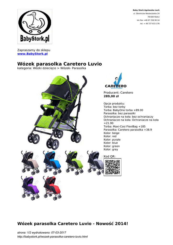 Baby Stork Agnieszka Lach ul. Obrońców Westerplatte 24 78-600 Wałcz tel./fax +48 67 258 90 24 tel. + 48 727 615 176 Zapraszamy do sklepu www.BabyStork.pl Wózek parasolka Caretero Luvio kategoria: Wózki dziecięce > Wózek- Parasolka Producent: Caretero 289,00 zł Opcje produktu: Torba: bez torby Torba: BabyOno torba +89.00 Parasolka: bez parasolki Ochraniacze na koła: bez ochraniaczy Ochraniacze na koła: Ochraniacze na koła +21.90 Torba: Maxi-Cosi FlexiBag +185 Parasolka: Caretero parasolka +38.9 Kolor: beige Kolor: red Kolor: purple Kolor: blue Kolor: green Kolor: grey Kod QR: Wózek parasolka Caretero Luvio - Nowość 2014! strona: 1/2 wydrukowano: 07-03-2017 http://babystork.pl/wozek-parasolka-caretero-luvio.html Wózek spacerowy Luvio to konstrukcja bezkompromisowa - kompaktowa i lekka, a jednocześnie funkcjonalna. Sprawia to, że wózek Luvio to idealne rozwiązanie dla aktywnych rodzin. Sprawdzi się zarówno w trakcie krótkiego wypadu po codzienne zakupy jak i w czasie wakacyjnych podróży. Najważniejsze cechy wózka spacerowego Luvio: Wysokiej jakości materiały i dynamiczne wzornictwo - zgodne z najnowszymi trendami Regulowane nachylenie oparcia i podnóżka Pozioma poprzeczka dodatkowo stabilizująca ramę wózka Pięciopunktowe szelki i wyjmowany pałąk chroniące małego pasażera w trakcie podróży Przedłużana budka z dwoma okienkami Praktyczny i łatwy w obsłudze ręczny system składania Piankowe rączki o ergonomicznym kształcie Skrętne przednie koła z funkcją blokady Koła tylne wyposażone w łączony hamulec Praktyczny i pojemny kosz na zakupy Folia przeciwdeszczowa i pokrowiec na nóżkiw wyposażeniu standardowym Wózek zgodny z europejską normą EN 1888 Wymiary wózka (szer./dł./wys.) Po rozłożeniu: 48/80/104 cm Po złożeniu: 30/102/35 cm Waga: 7,4 kg strona: 2/2 wydrukowano: 07-03-2017 http://babystork.pl/wozek-parasolka-caretero-luvio.html