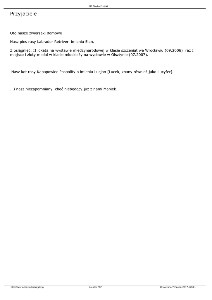 MP Studio Projekt Przyjaciele Oto nasze zwierzaki domowe Nasz pies rasy Labrador Retriver imieniu Elan. Z osiągnięć: II lokata na wystawie międzynarodowej w klasie szczeniąt we Wrocławiu (09.2006) raz I miejsce i złoty medal w klasie młodzieży na wystawie w Olsztynie (07.2007). Nasz kot rasy Kanapowiec Pospolity o imieniu Lucjan [Lucek, znany również jako Lucyfer]. ...i nasz niezapomniany, choć niebędący już z nami Maniek. http://www.mpstudioprojekt.pl Kreator PDF Utworzono 7 March, 2017, 06:01