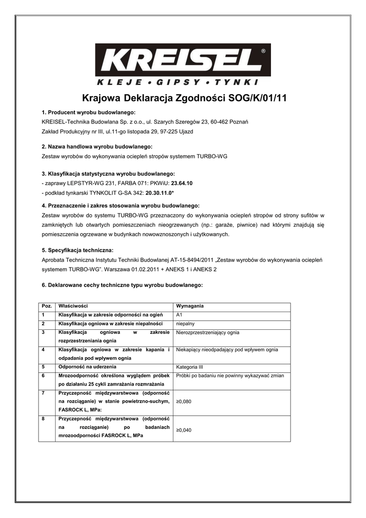 Krajowa Deklaracja Zgodności SOG/K/01/11 1. Producent wyrobu budowlanego: KREISEL-Technika Budowlana Sp. z o.o., ul. Szarych Szeregów 23, 60-462 Poznań Zakład Produkcyjny nr III, ul.11-go listopada 29, 97-225 Ujazd 2. Nazwa handlowa wyrobu budowlanego: Zestaw wyrobów do wykonywania ociepleń stropów systemem TURBO-WG 3. Klasyfikacja statystyczna wyrobu budowlanego: - zaprawy LEPSTYR-WG 231, FARBA 071: PKWiU: 23.64.10 - podkład tynkarski TYNKOLIT G-SA 342: 20.30.11.0* 4. Przeznaczenie i zakres stosowania wyrobu budowlanego: Zestaw wyrobów do systemu TURBO-WG przeznaczony do wykonywania ociepleń stropów od strony sufitów w zamkniętych lub otwartych pomieszczeniach nieogrzewanych (np.: garaże, piwnice) nad którymi znajdują się pomieszczenia ogrzewane w budynkach nowowznoszonych i użytkowanych. 5. Specyfikacja techniczna: Aprobata Techniczna Instytutu Techniki Budowlanej AT-15-8494/2011 „Zestaw wyrobów do wykonywania ociepleń systemem TURBO-WG”. Warszawa 01.02.2011 + ANEKS 1 i ANEKS 2 6. Deklarowane cechy techniczne typu wyrobu budowlanego: Poz. Właściwości Wymagania 1 Klasyfikacja w zakresie odporności na ogień A1 2 Klasyfikacja ogniowa w zakresie niepalności niepalny 3 Klasyfikacja Nierozprzestrzeniający ognia 4 Klasyfikacja ogniowa w zakresie kapania i 5 Odporność na uderzenia Kategoria III Mrozoodporność określona wyglądem próbek Próbki po badaniu nie powinny wykazywać zmian ogniowa w zakresie rozprzestrzeniania ognia Niekapiący nieodpadający pod wpływem ognia odpadania pod wpływem ognia 6 po działaniu 25 cykli zamrażania rozmrażania 7 Przyczepność międzywarstwowa (odporność na rozciąganie) w stanie powietrzno-suchym, ≥0,080 FASROCK L, MPa: 8 Przyczepność międzywarstwowa (odporność na rozciąganie) po mrozoodporności FASROCK L, MPa badaniach ≥0,040 7. Nazwa i numer akredytowanej jednostki certyfikującej lub laboratorium oraz numer certyfikatu lub numer raportu z badań typu, jeżeli taka jednostka brała udział w zastosowanym systemie oceny zgodności wyrobu budowlanego: Instytut Techniki Budowlanej ul. Filtrowa1; 00-611 Warszawa – Certyfikat Zakładowej Kontroli Produkcji ITB-0469/Z przez Zakład Certyfikacji ITB (numer akredytacji AC 020), wydany po raz pierwszy 25.02.2011 Warszawa Ocena zgodności 2+ Deklaruję z pełną odpowiedzialnością, że wyroby budowlane objęte deklaracją są zgodne z dokumentami wymienionymi w pkt.6. Poznań, dnia 1 marca 2011r. aktualizacja 28.09.2012