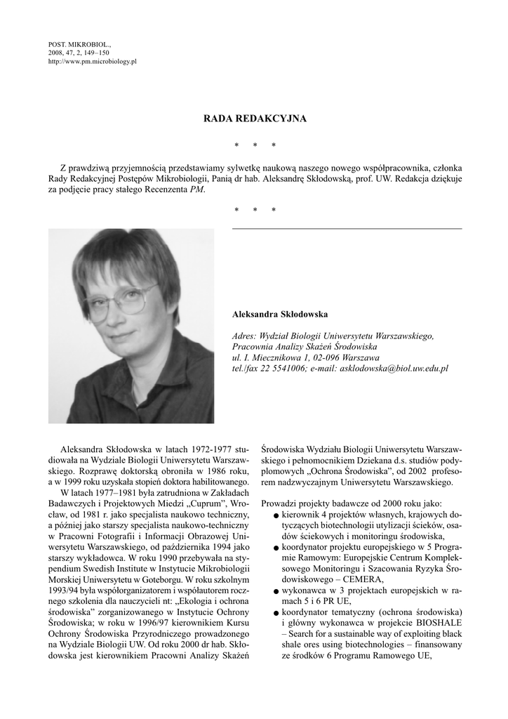 POST. MIKROBIOL., 2008, 47, 2, 149150 http://www.pm.microbiology.pl RADA REDAKCYJNA * * * Z prawdziw¹ przyjemnoci¹ przedstawiamy sylwetkê naukow¹ naszego nowego wspó³pracownika, cz³onka Rady Redakcyjnej Postêpów Mikrobiologii, Pani¹ dr hab. Aleksandrê Sk³odowsk¹, prof. UW. Redakcja dziêkuje za podjêcie pracy sta³ego Recenzenta PM. * * * Aleksandra Sk³odowska Adres: Wydzia³ Biologii Uniwersytetu Warszawskiego, Pracownia Analizy Ska¿eñ rodowiska ul. I. Miecznikowa 1, 02-096 Warszawa tel./fax 22 5541006; e-mail: [email protected] Aleksandra Sk³odowska w latach 1972-1977 studiowa³a na Wydziale Biologii Uniwersytetu Warszawskiego. Rozprawê doktorsk¹ obroni³a w 1986 roku, a w 1999 roku uzyska³a stopieñ doktora habilitowanego. W latach 19771981 by³a zatrudniona w Zak³adach Badawczych i Projektowych Miedzi Cuprum, Wroc³aw, od 1981 r. jako specjalista naukowo techniczny, a póniej jako starszy specjalista naukowo-techniczny w Pracowni Fotografii i Informacji Obrazowej Uniwersytetu Warszawskiego, od padziernika 1994 jako starszy wyk³adowca. W roku 1990 przebywa³a na stypendium Swedish Institute w Instytucie Mikrobiologii Morskiej Uniwersytetu w Goteborgu. W roku szkolnym 1993/94 by³a wspó³organizatorem i wspó³autorem rocznego szkolenia dla nauczycieli nt: Ekologia i ochrona rodowiska zorganizowanego w Instytucie Ochrony rodowiska; w roku w 1996/97 kierownikiem Kursu Ochrony rodowiska Przyrodniczego prowadzonego na Wydziale Biologii UW. Od roku 2000 dr hab. Sk³odowska jest kierownikiem Pracowni Analizy Ska¿eñ rodowiska Wydzia³u Biologii Uniwersytetu Warszawskiego i pe³nomocnikiem Dziekana d.s. studiów podyplomowych Ochrona rodowiska, od 2002 profesorem nadzwyczajnym Uniwersytetu Warszawskiego. Prowadzi projekty badawcze od 2000 roku jako: ● kierownik 4 projektów w³asnych, krajowych dotycz¹cych biotechnologii utylizacji cieków, osadów ciekowych i monitoringu rodowiska, ● koordynator projektu europejskiego w 5 Programie Ramowym: Europejskie Centrum Kompleksowego Monitoringu i Szacowania Ryzyka rodowiskowego CEMERA, ● wykonawca w 3 projektach europejskich w ramach 5 i 6 PR UE, ● koordynator tematyczny (ochrona rodowiska) i g³ówny wykonawca w projekcie BIOSHALE Search for a sustainable way of exploiting black shale ores using biotechnologies finansowany ze rodków 6 Programu Ramowego UE, 150 RADA REDAKCYJNA kierownik projektu badawczego zamawianego Utylizacja odpadów przemys³u mineralnego z zastosowaniem metod biotechnologicznych oraz stworzenie banku mikroorganizmów potencjalnie u¿ytecznych w biometalurgii. Jest autorem lub wspó³autorem 45 publikacji (m.in. w FEMS Letters, Geomicrobiology Journal, Journal of Applied Microbiology, Canadian Journal of Microbiology, Experimental Botany, Environmental Pollu● tion, Polish Journal of Microbiolgy) i 30 doniesieñ konferencyjnych, 3 ksi¹¿ek z dziedziny ochrony rodowiska i biotechnologii w ochronie rodowiska, 1 patentu; jest te¿ konsultantem w zakresie normy ISO 14001, recenzentem Environmental Pollution, Chemosphere, Polish Journal of Microbiolgy. Jest cz³onkiem Rady Naukowej Instytutu Optyki Stosowanej, Rady Naukowej Uniwersyteckiego Centrum Badañ nad rodowiskiem.